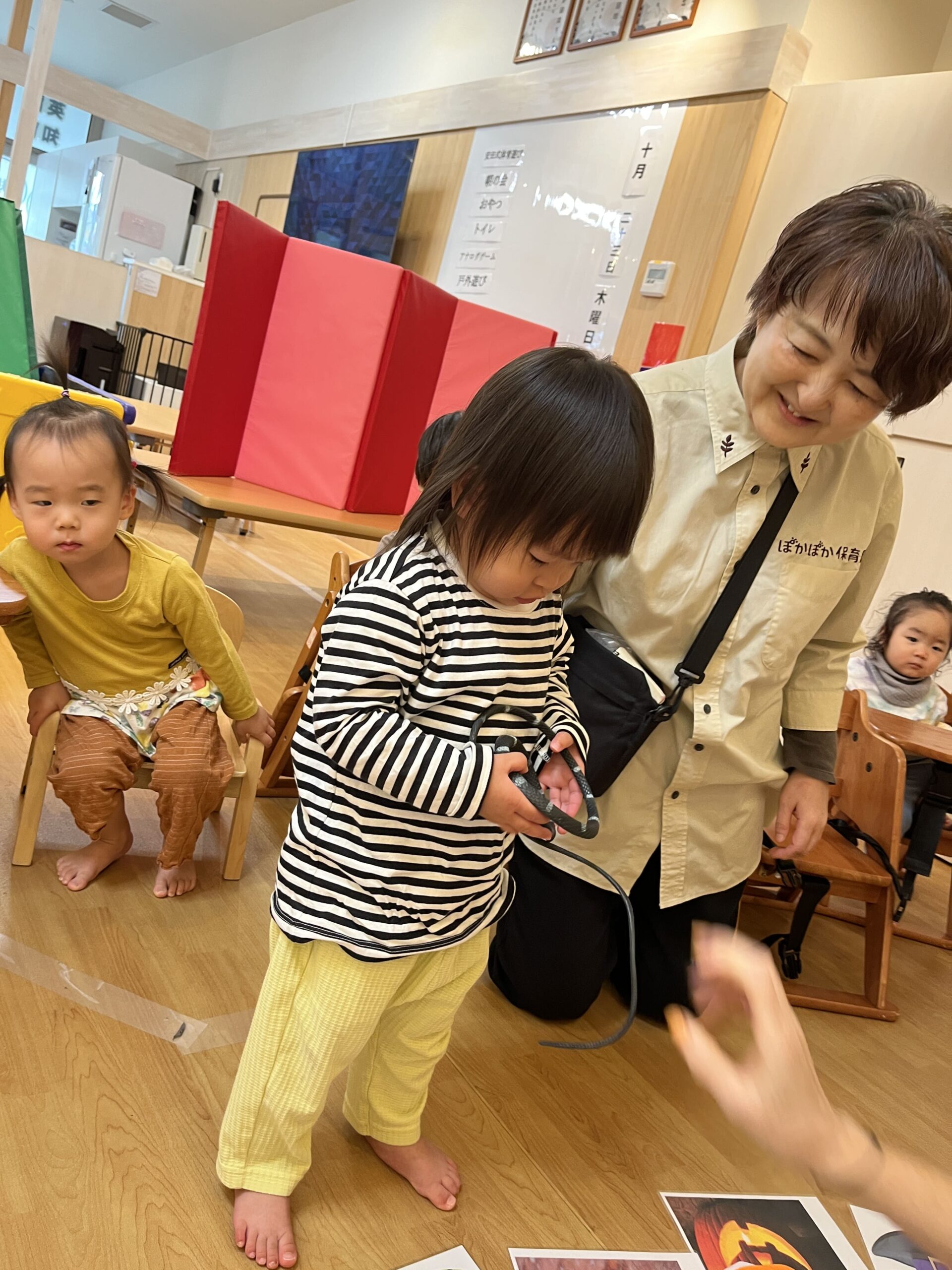 2歳さんは「う~ん、パンプキンどこかな??」と絵本をじっくり見ながら探してカードにタッチ、1歳さんも「ここ!」と手を伸ばします。0歳さんは先生と一緒にカードへていねいにタッチ、仲良しで参加できました。