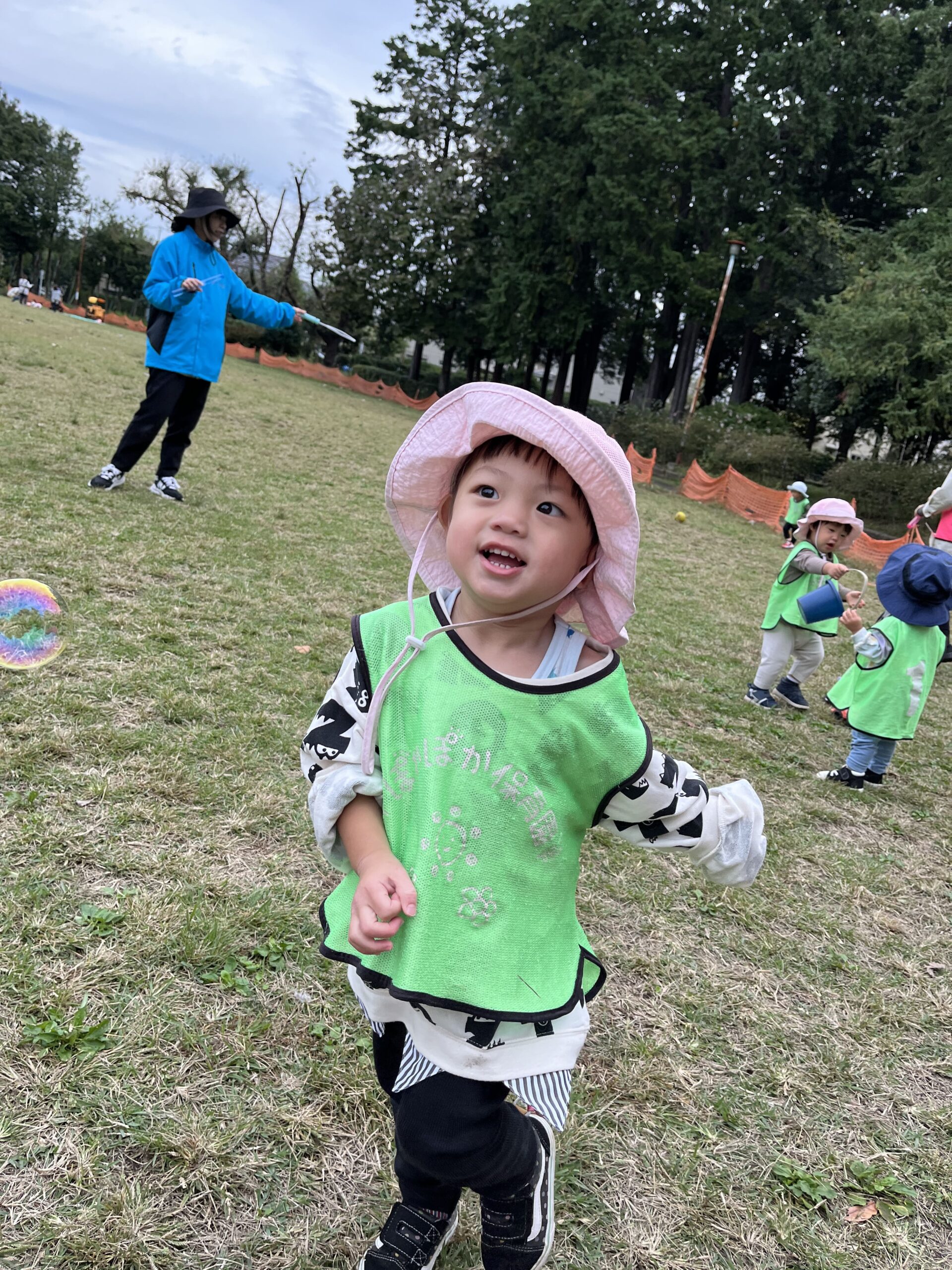 風に乗って勢いよく飛ぶしゃぼん玉を見て「まってー!」と2歳さんが追いかけ、