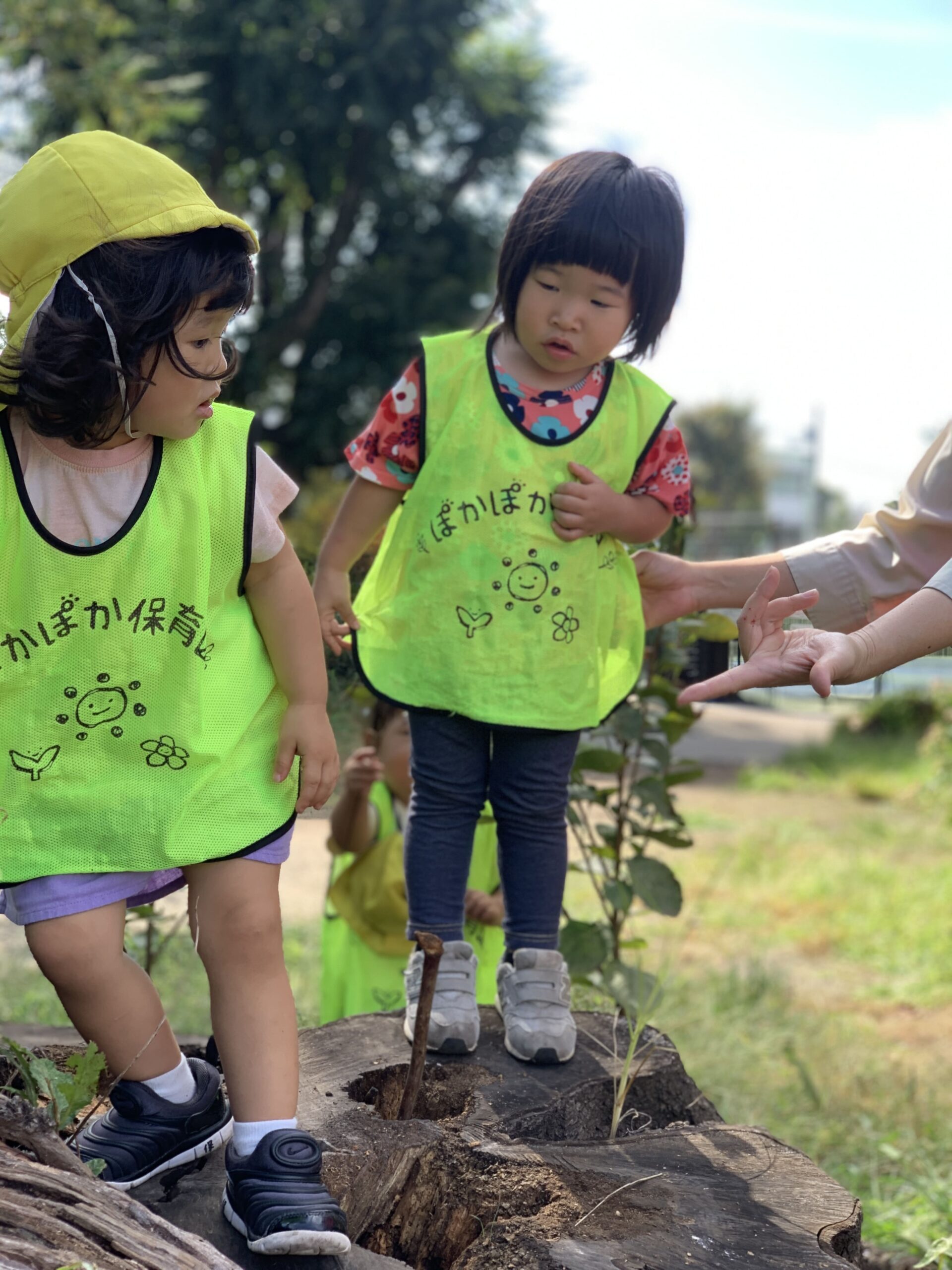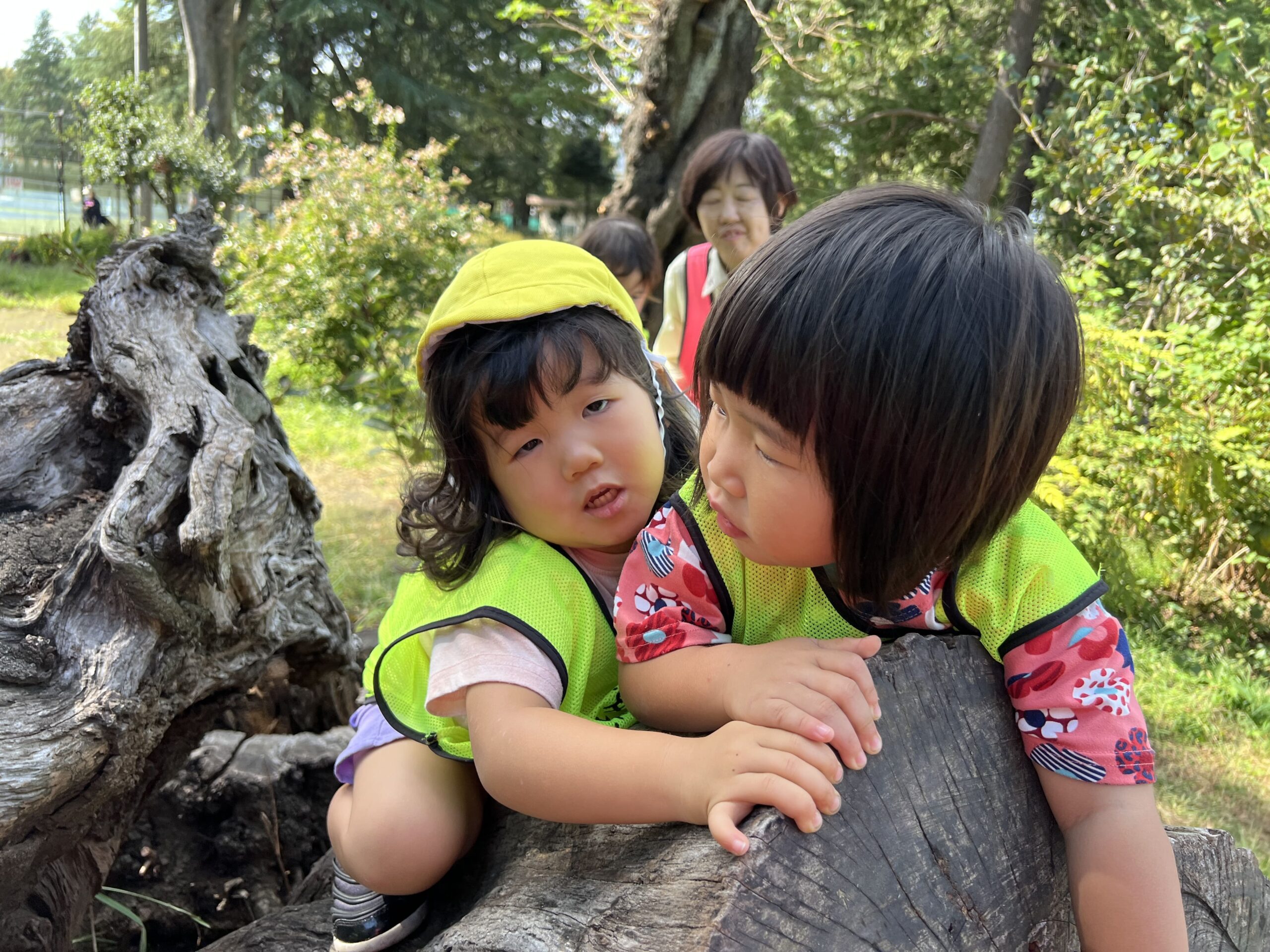 木の根元で「め、でてる!」と2歳さんが指さし。