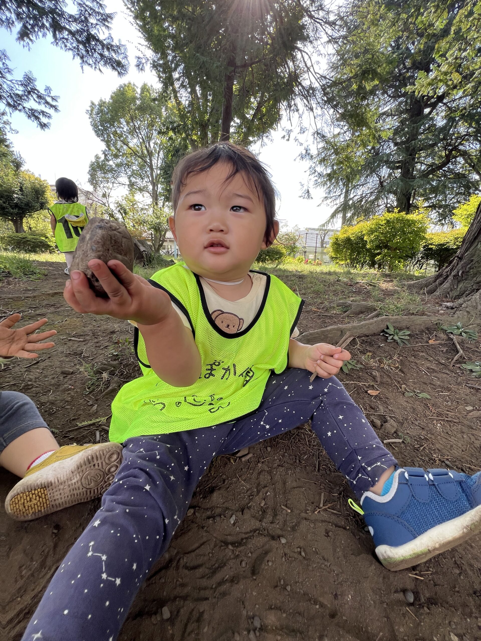 2歳さんが「芽!切り株!」、1歳さんは「ベンチすき!」、「大きな石も見つけた!」、0歳さんは「にこー!」と笑顔でお返事。