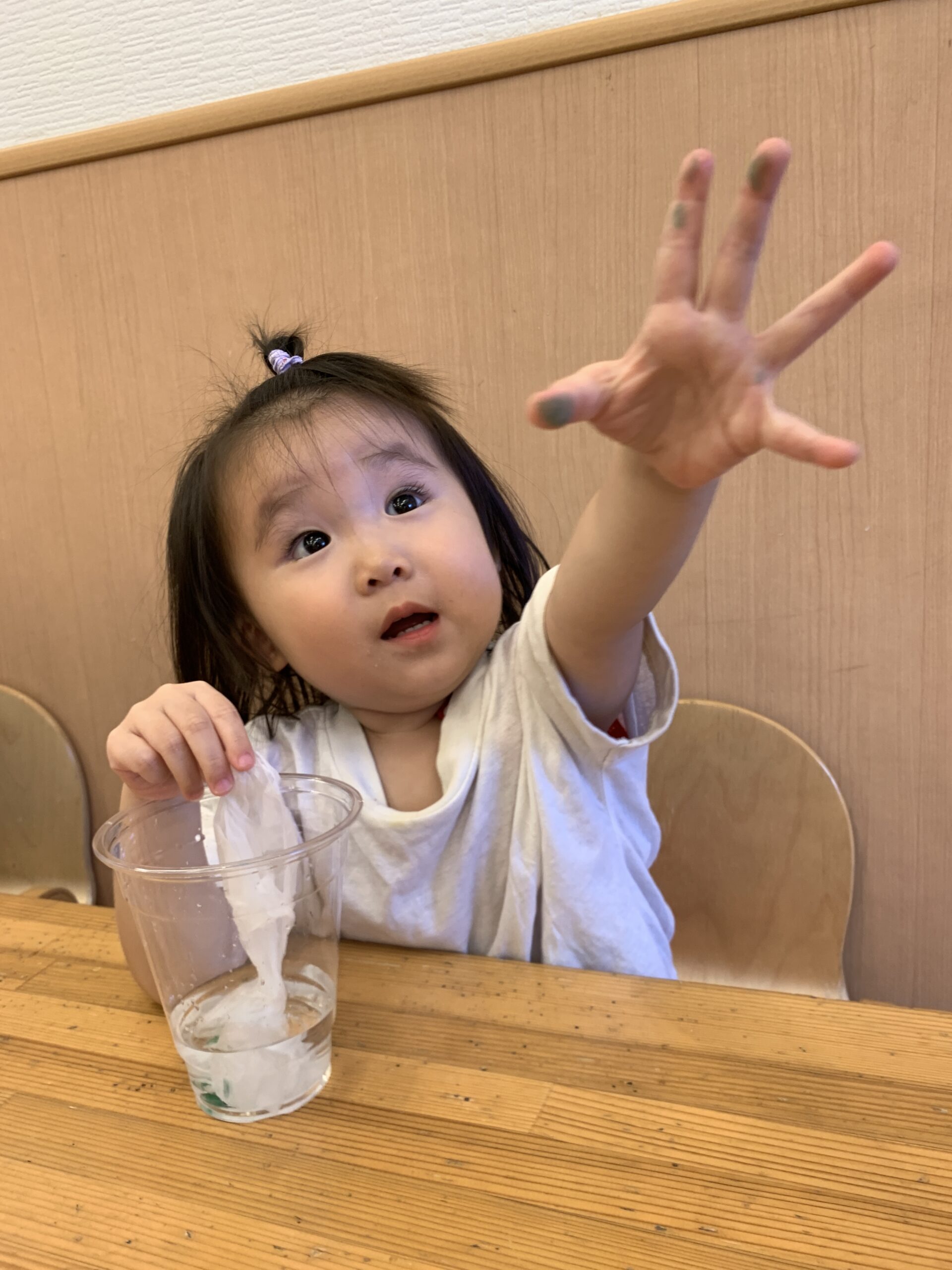 みんな真剣な顔でじーっとこよりを見つめ、色水の変化を観察していました。