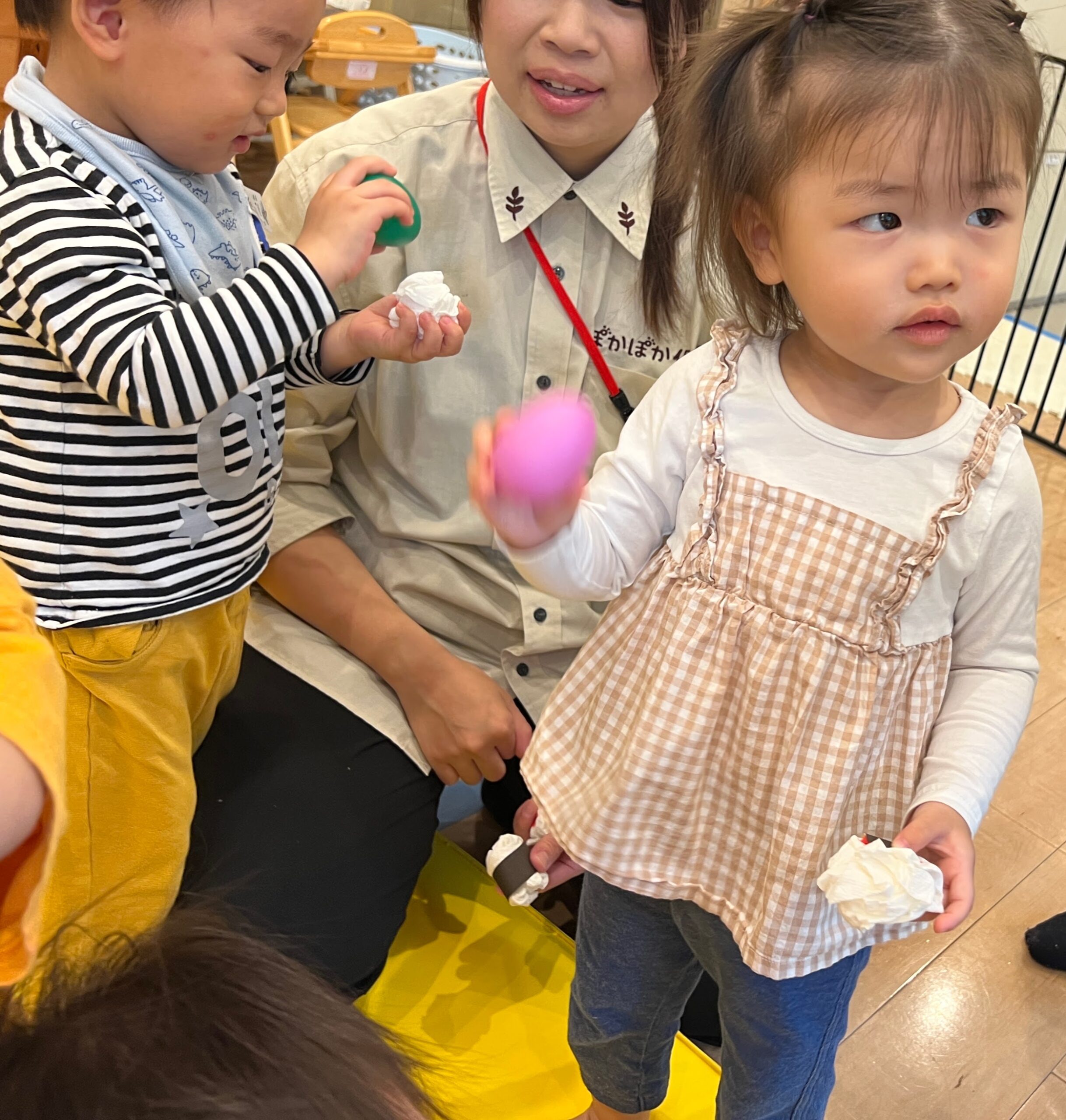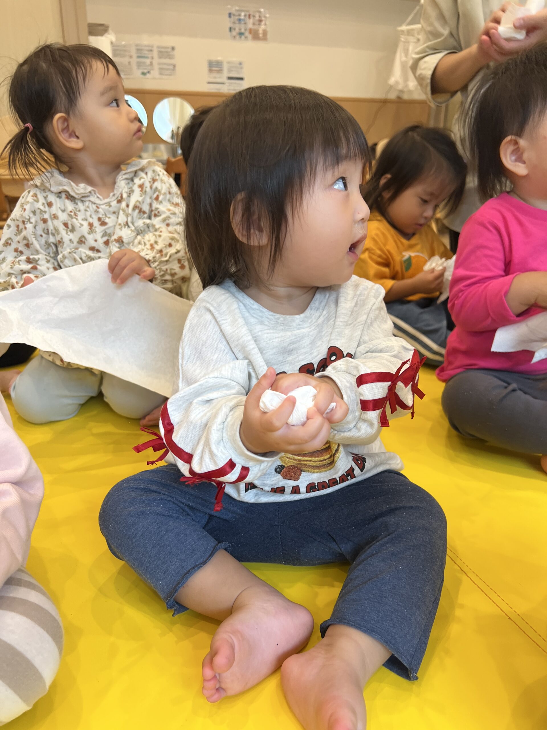 歌とリズムに合わせて、歌いながらキッチンペーパーをにぎにぎ!!