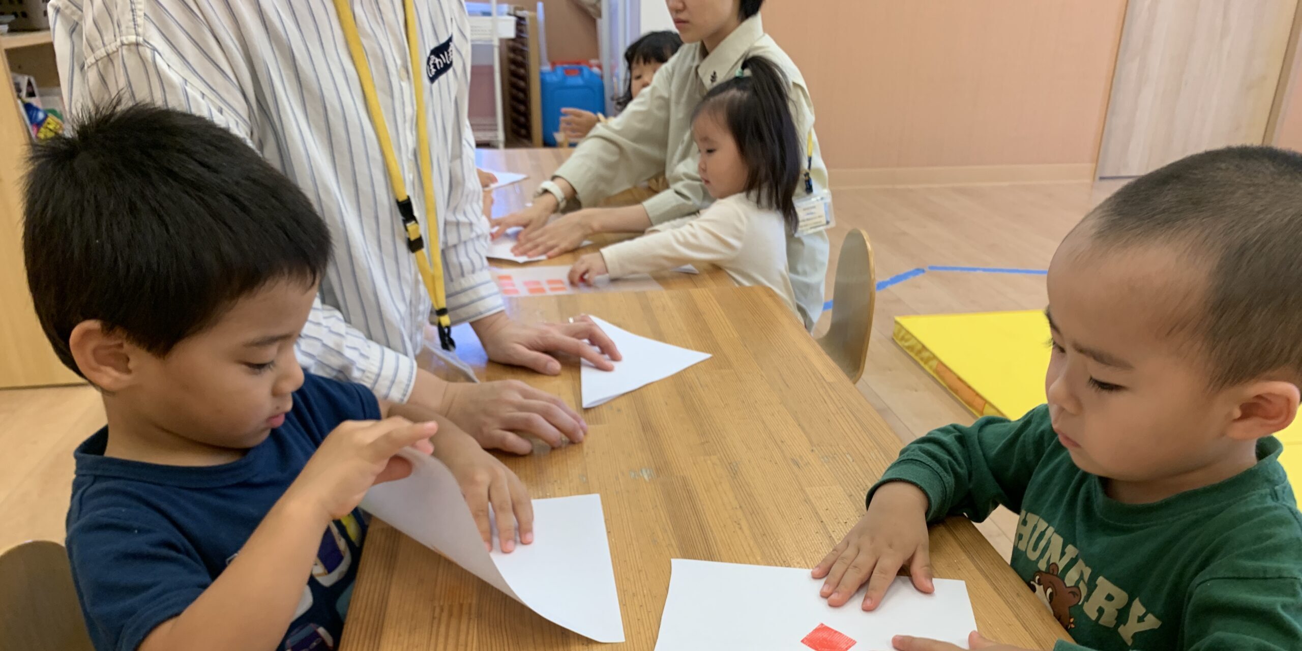 「こうかな?」「むずかしい!」と、真剣な表情で紙と格闘する子どもたち。