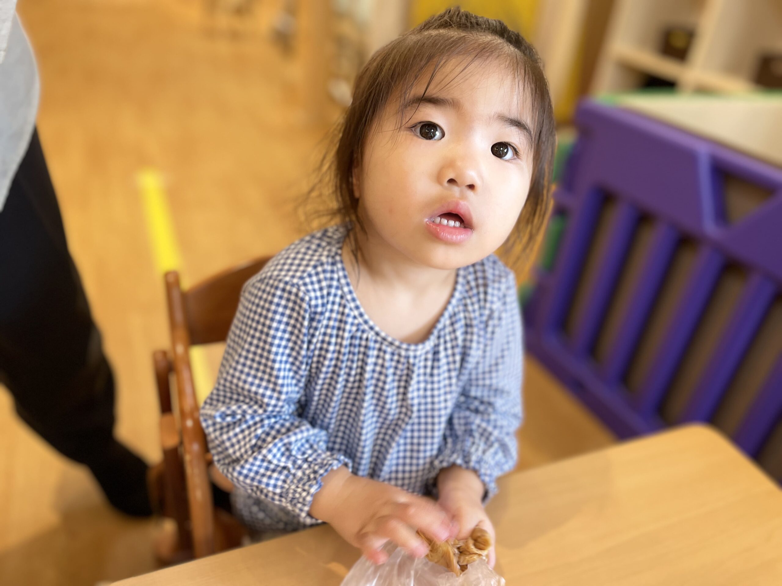 後半はサイエンス+の味噌実験。「これ、なんのにおい?」に「おみそ!」と2歳さん。
