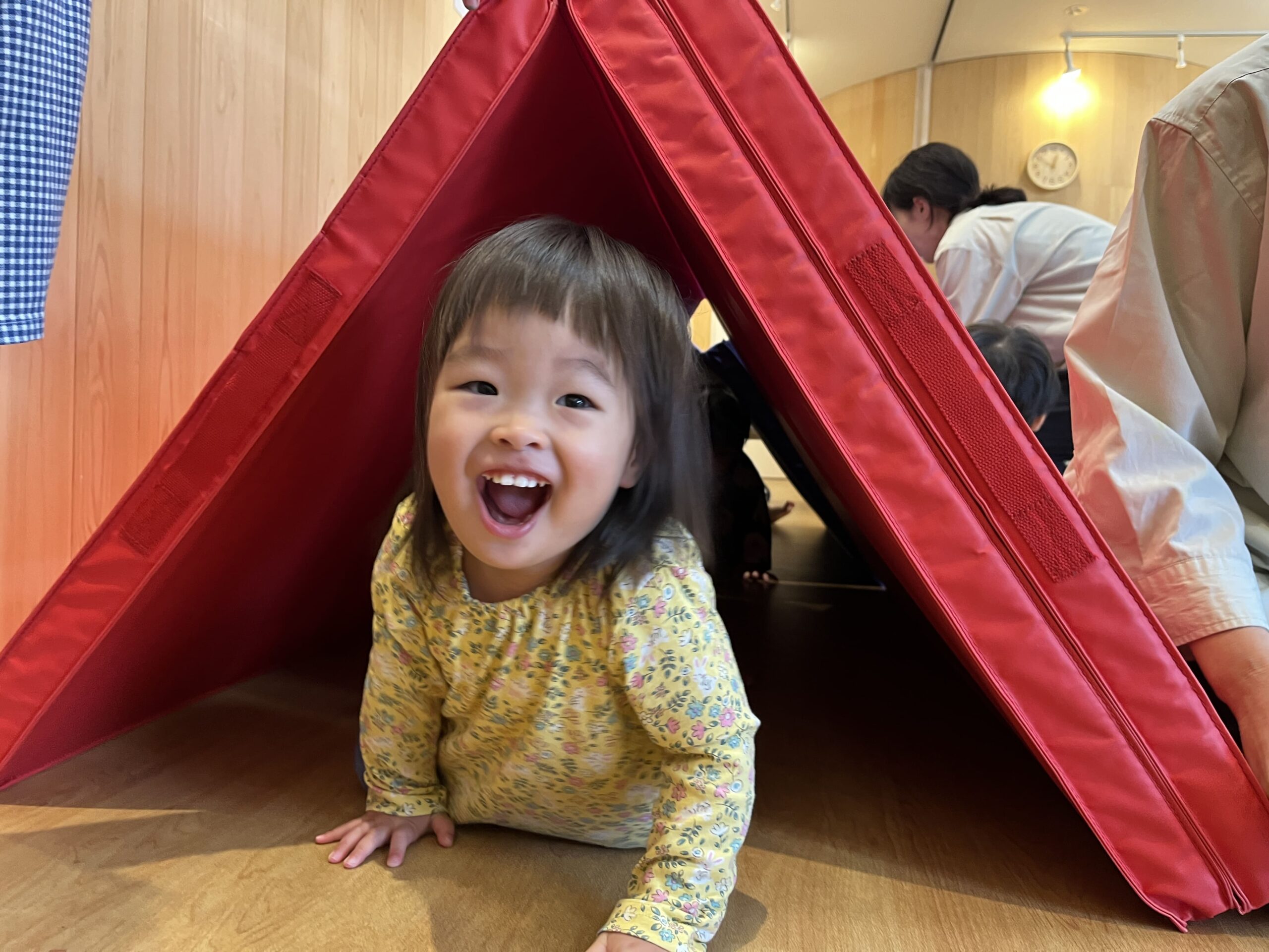 0歳さんはハイハイでゆっくり、出口で「ばぁ!」と嬉しい拍手が広がりました。