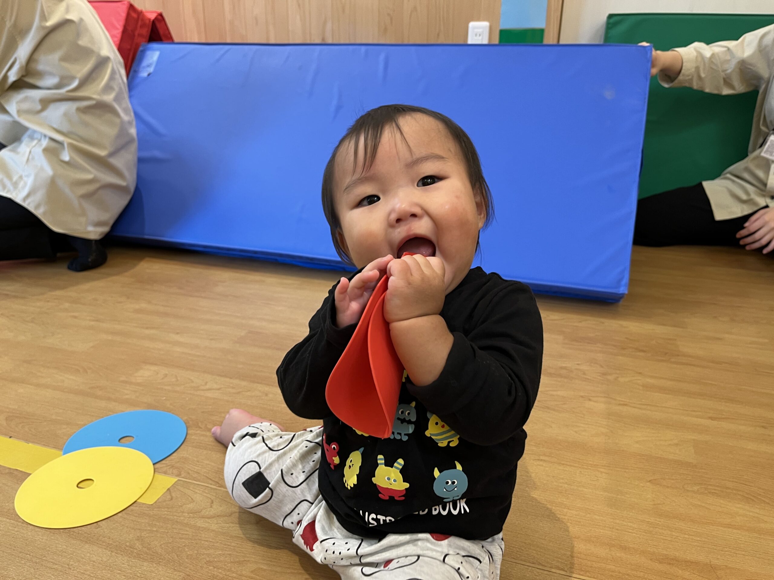 0歳さんはマットにタッチしてニコっと、みんな仲良しで楽しい雰囲気。