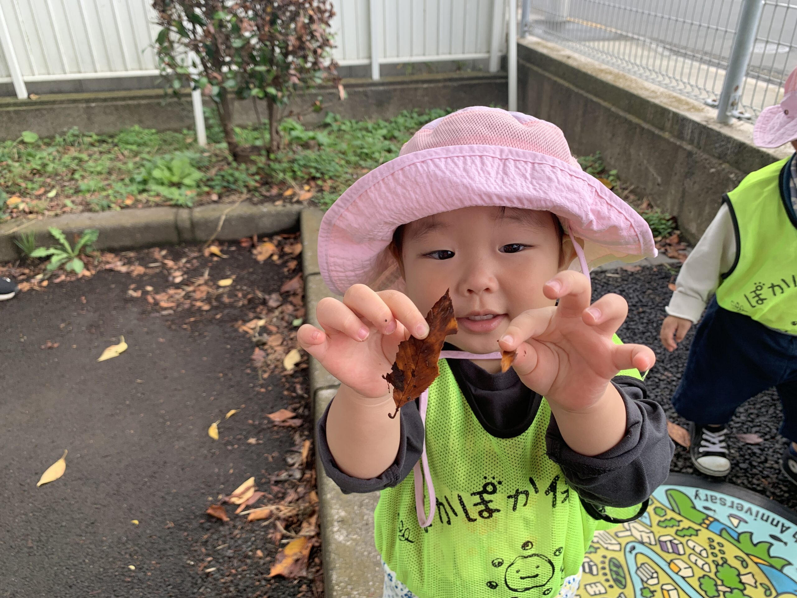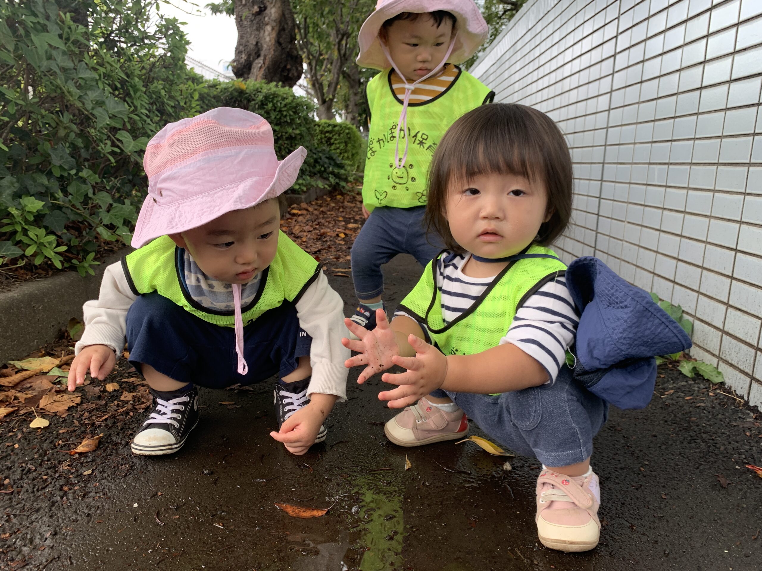 落ち葉を拾って、水たまりに入れて水の感触を楽しむ姿も見られました。