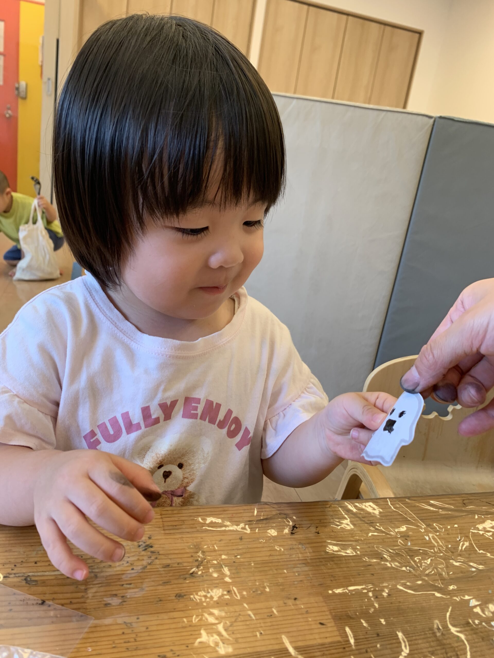 保育者と一緒にステンシルで模様がつく不思議さを楽しむ