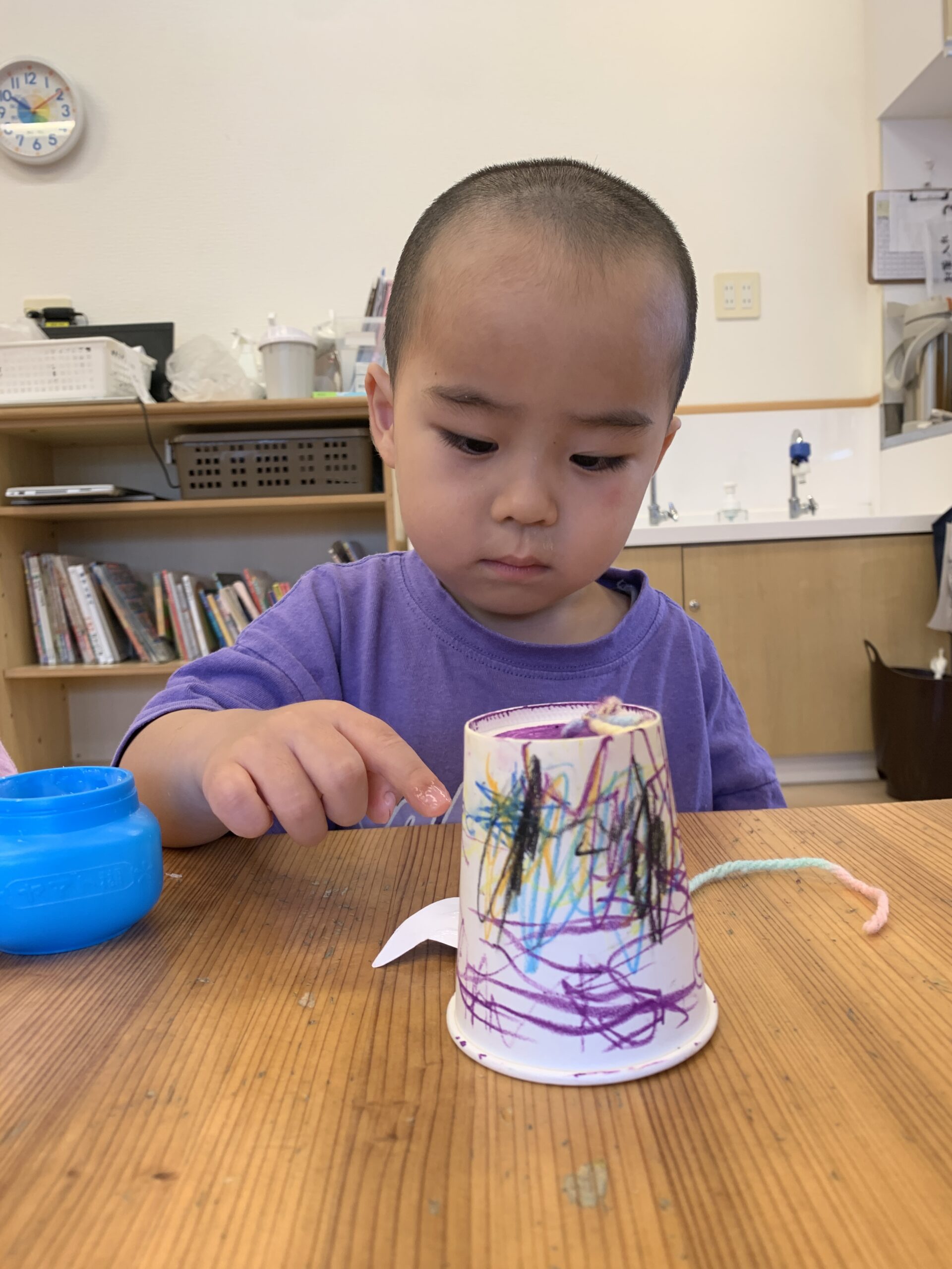 2歳児:のりを指に付けて帽子を紙コップに接着する感覚を楽しむ
