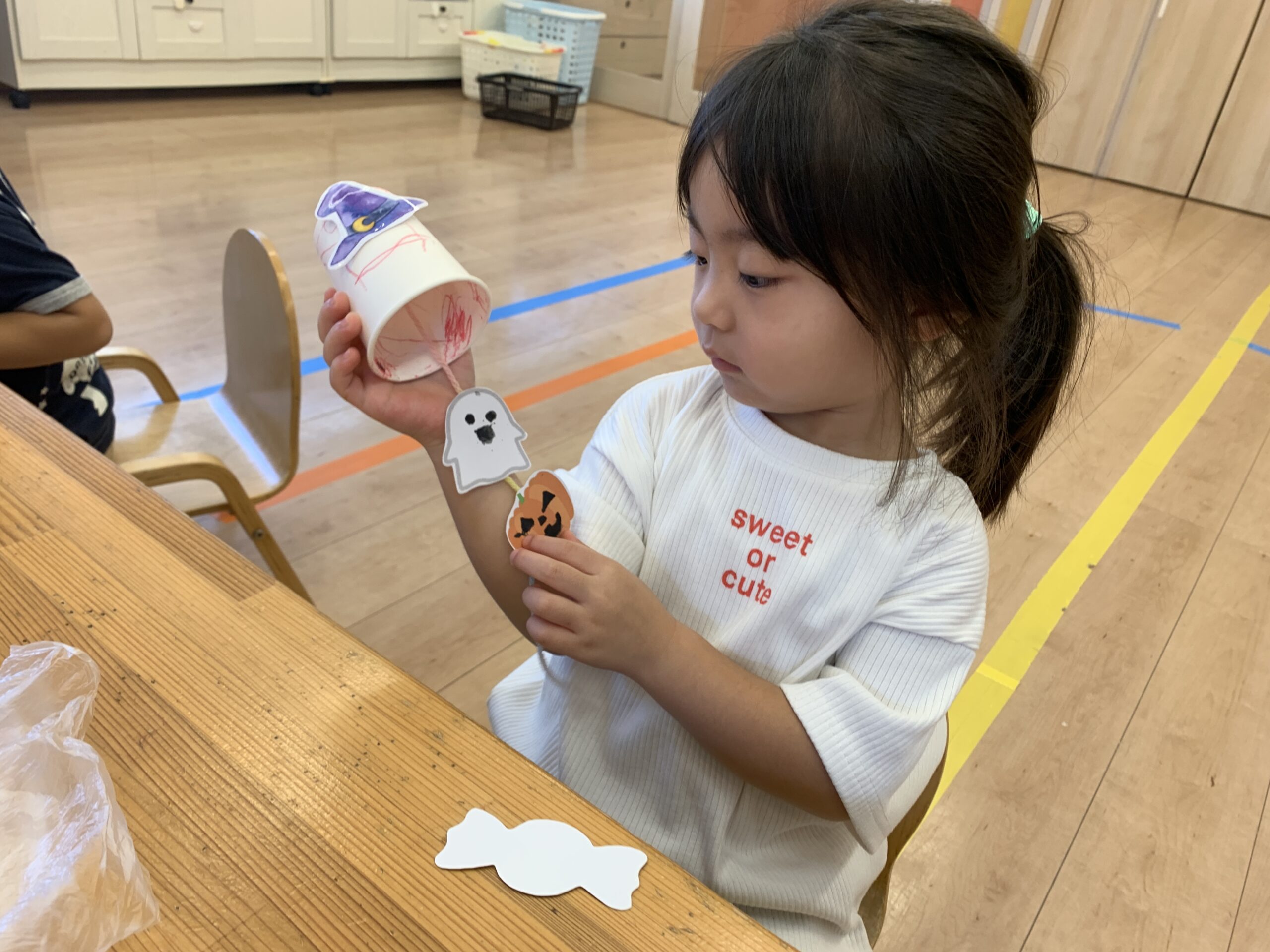 紙コップに自由にオバケの顔を描くことで創作意欲を育む
