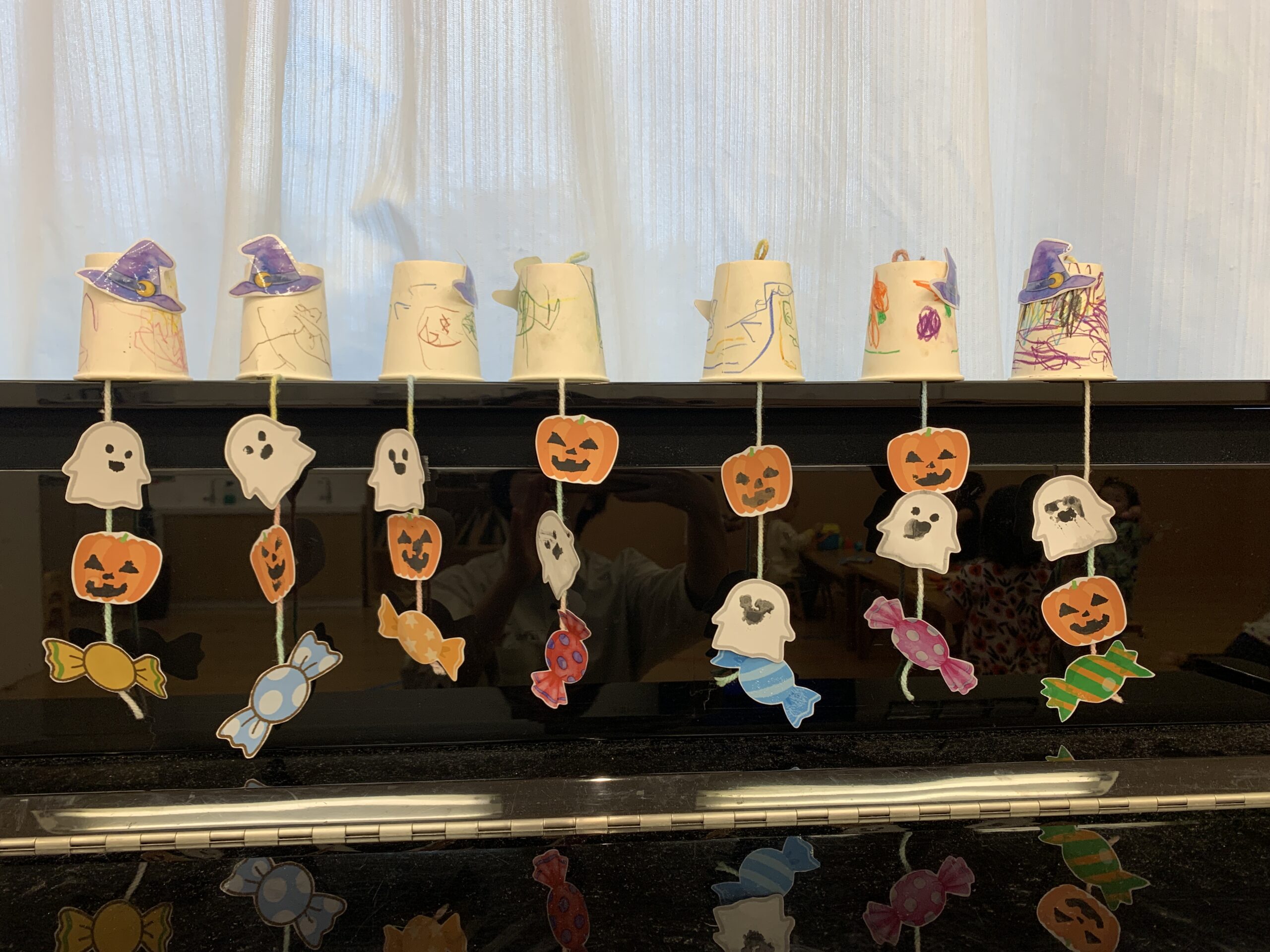 最後におばけに帽子を貼って・・ ステンシルをしたパンプキンやキャンデーも貼って・・。セロハンテープで貼るって結構難しいわ・・