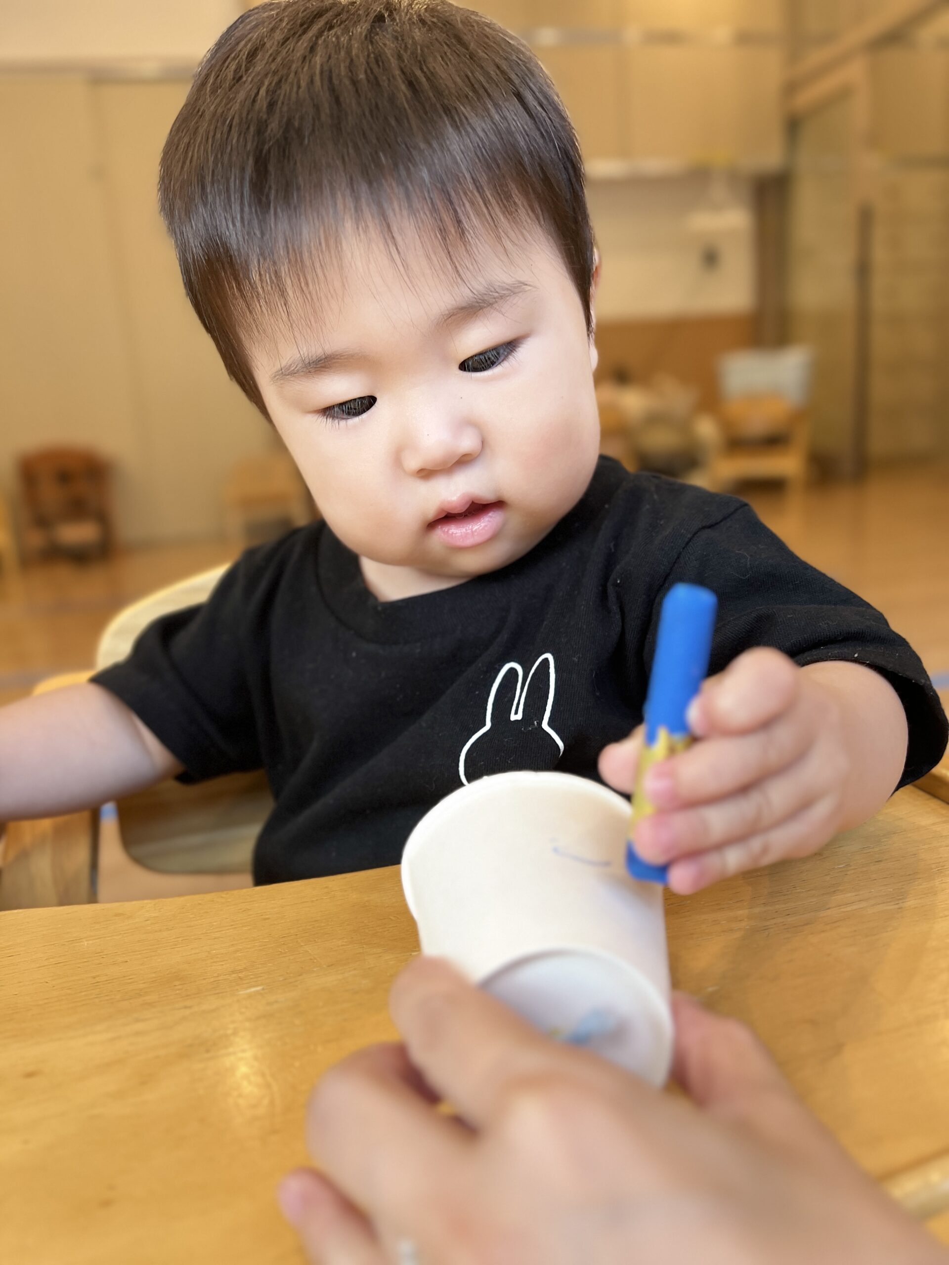 1歳児:のりを指に付けて帽子を紙コップに接着する感覚を楽しむ