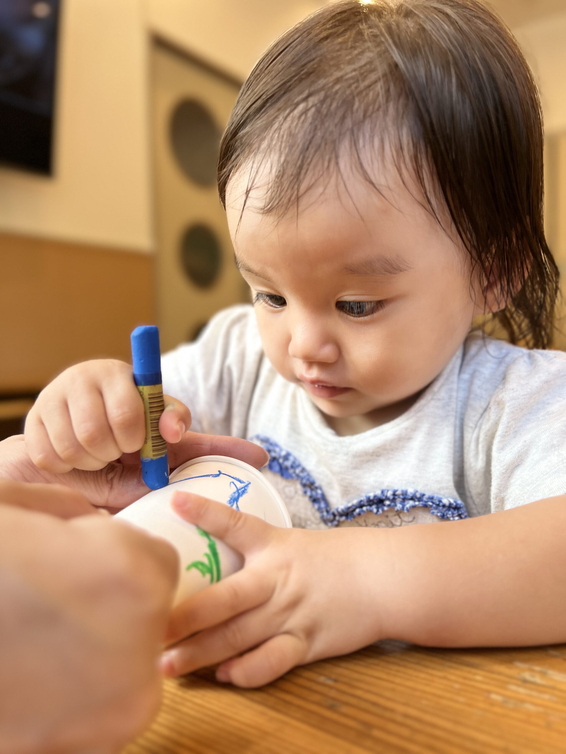 0歳児:保育者と一緒にオバケの顔をクレヨンで描くことに挑戦する