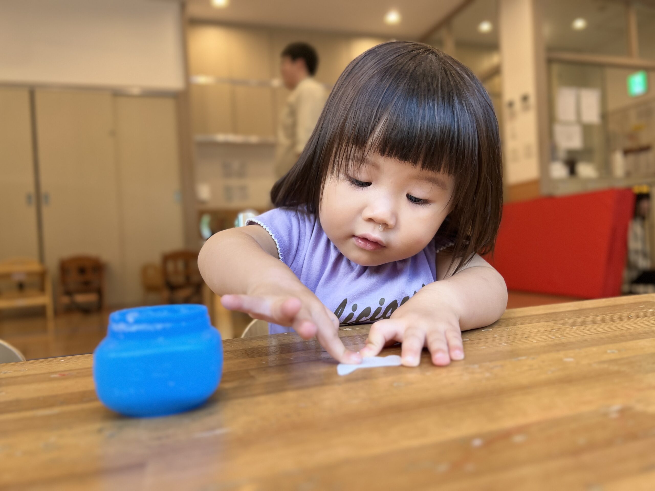1歳児さんも乗りの使い方が上手になってきました。指先を使って適量を取って塗ります。