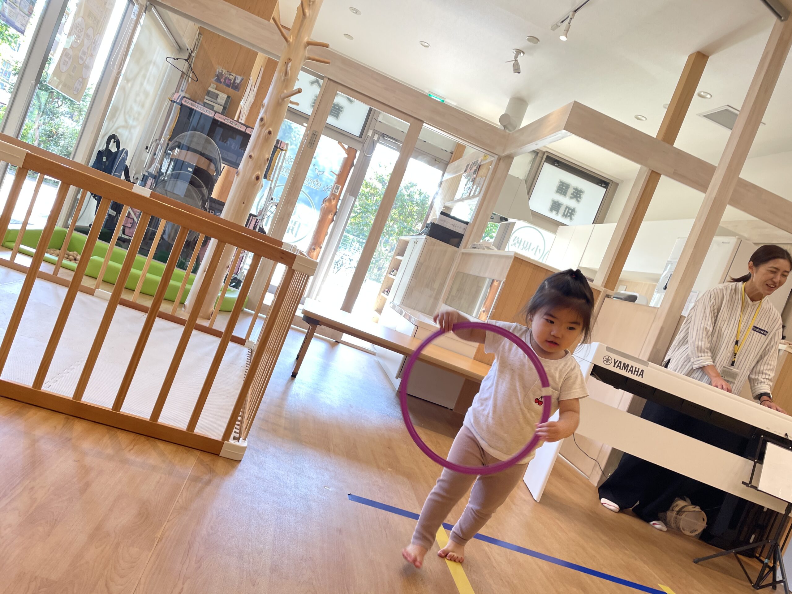 フープをこまのように回し、それを見たみんなが、出来るよ~!と次々にチャレンジする一コマがありました。