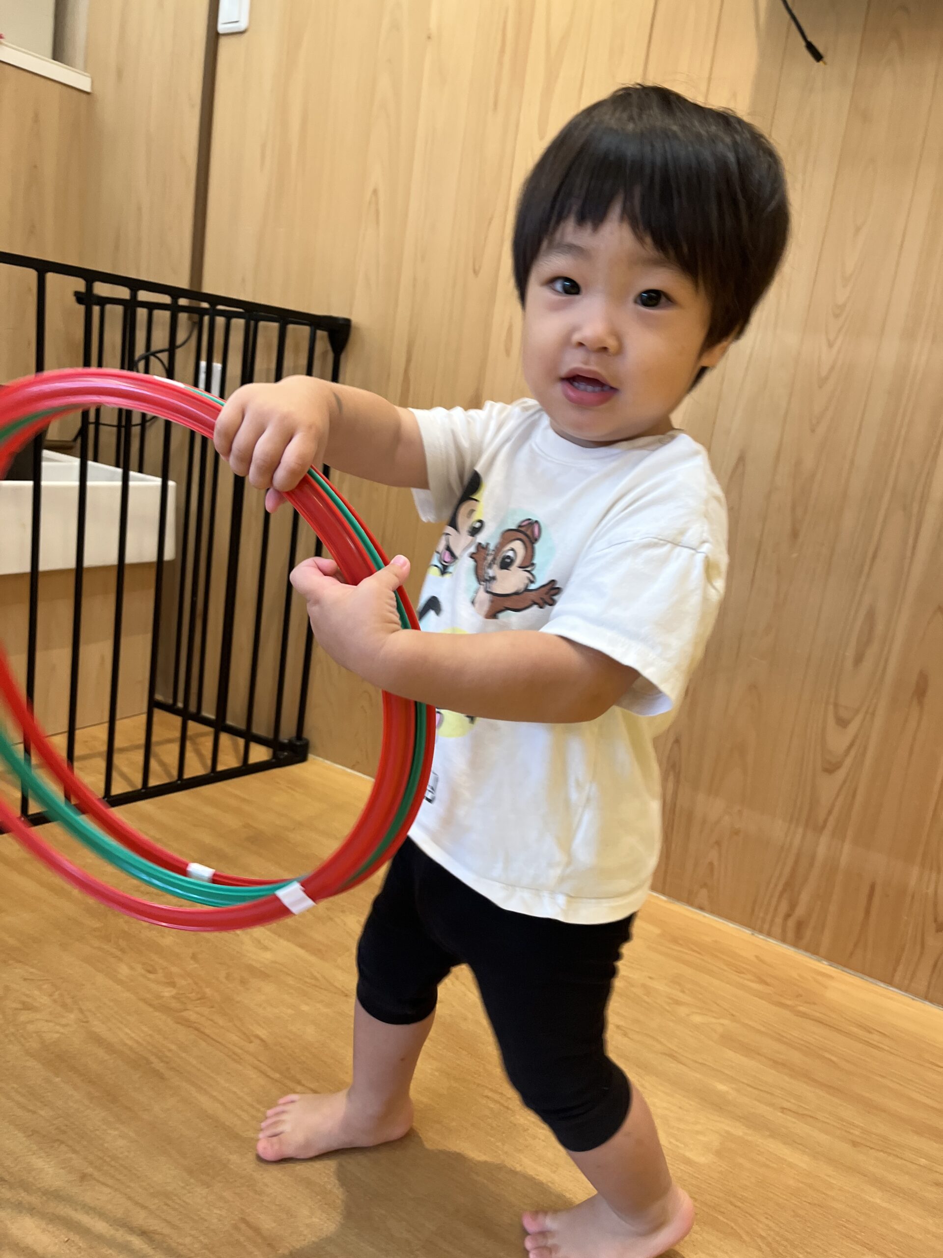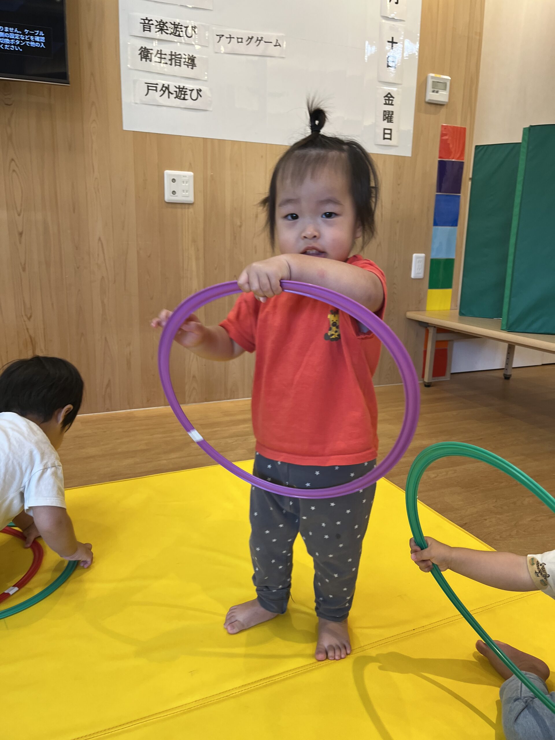 フープをこまのように回し、それを見たみんなが、出来るよ~!と次々にチャレンジする一コマがありました。