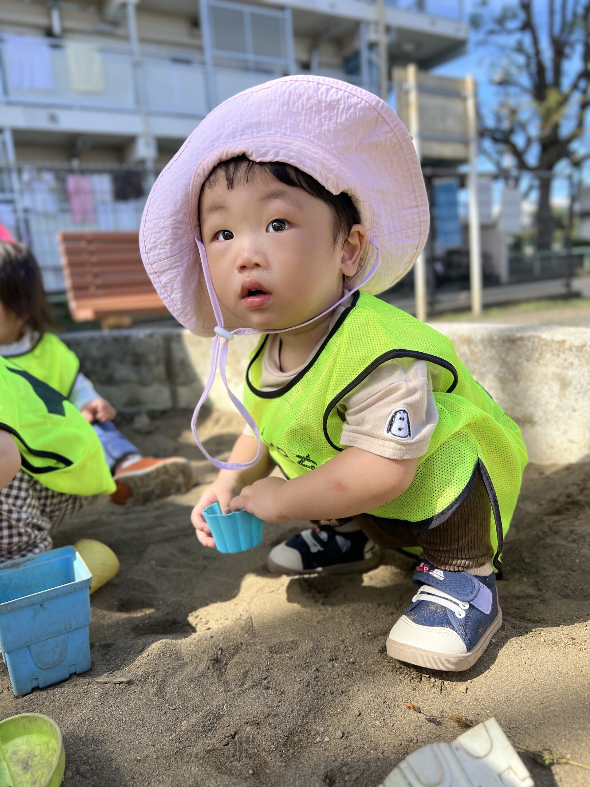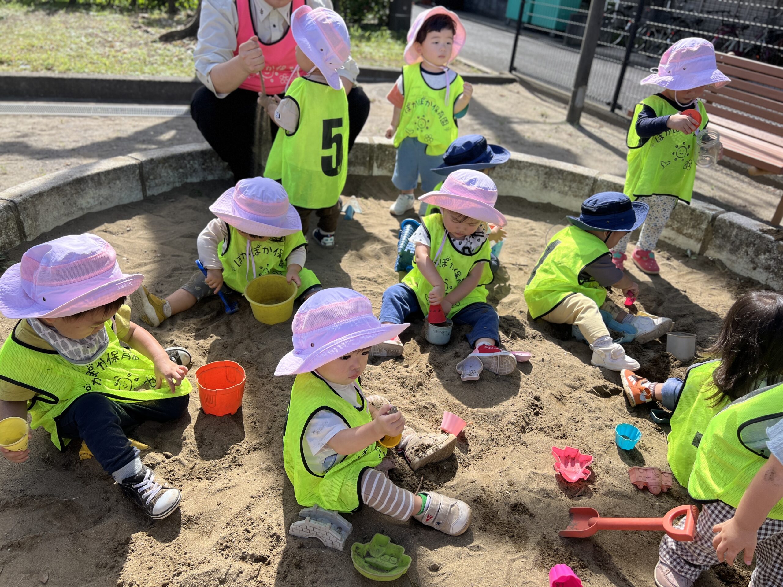 砂場では、小さなスコップで一生懸命砂をすくったり、お砂のケーキを作ったり。「みてみて!おおきいね!」と、砂山を指さして先生に教えてくれる子もいました。