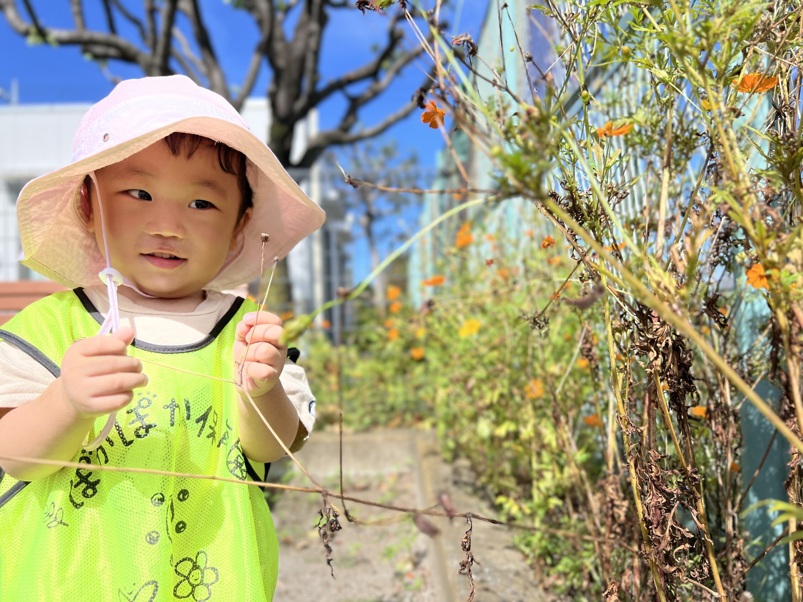 公園内を楽しそうに探検する姿も。落ち葉を拾ったり、お花を見つけたり、「わー、あっちにもなにかあるかな?」と、きらきらした目で新しい発見を求めていました。