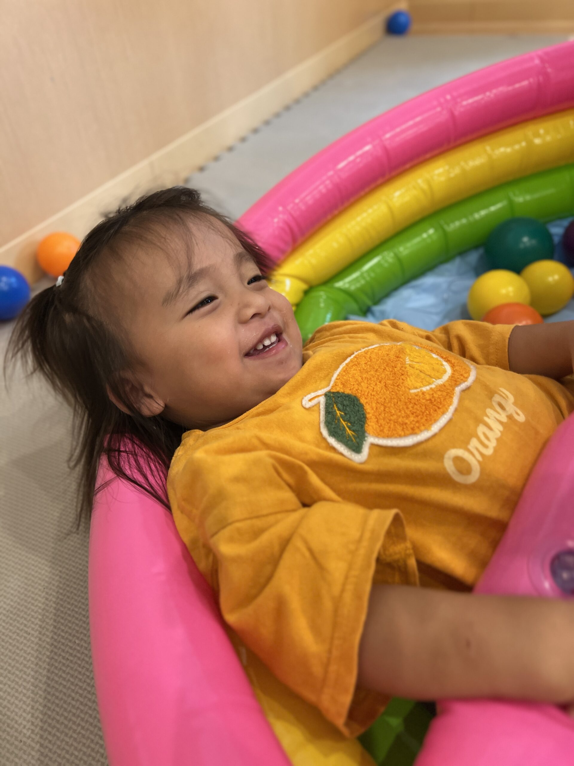 たくさんのボールに埋もれて体を動かしたり、投げたり転がしたりと、全身を使ってのびのびと友達と遊びました!