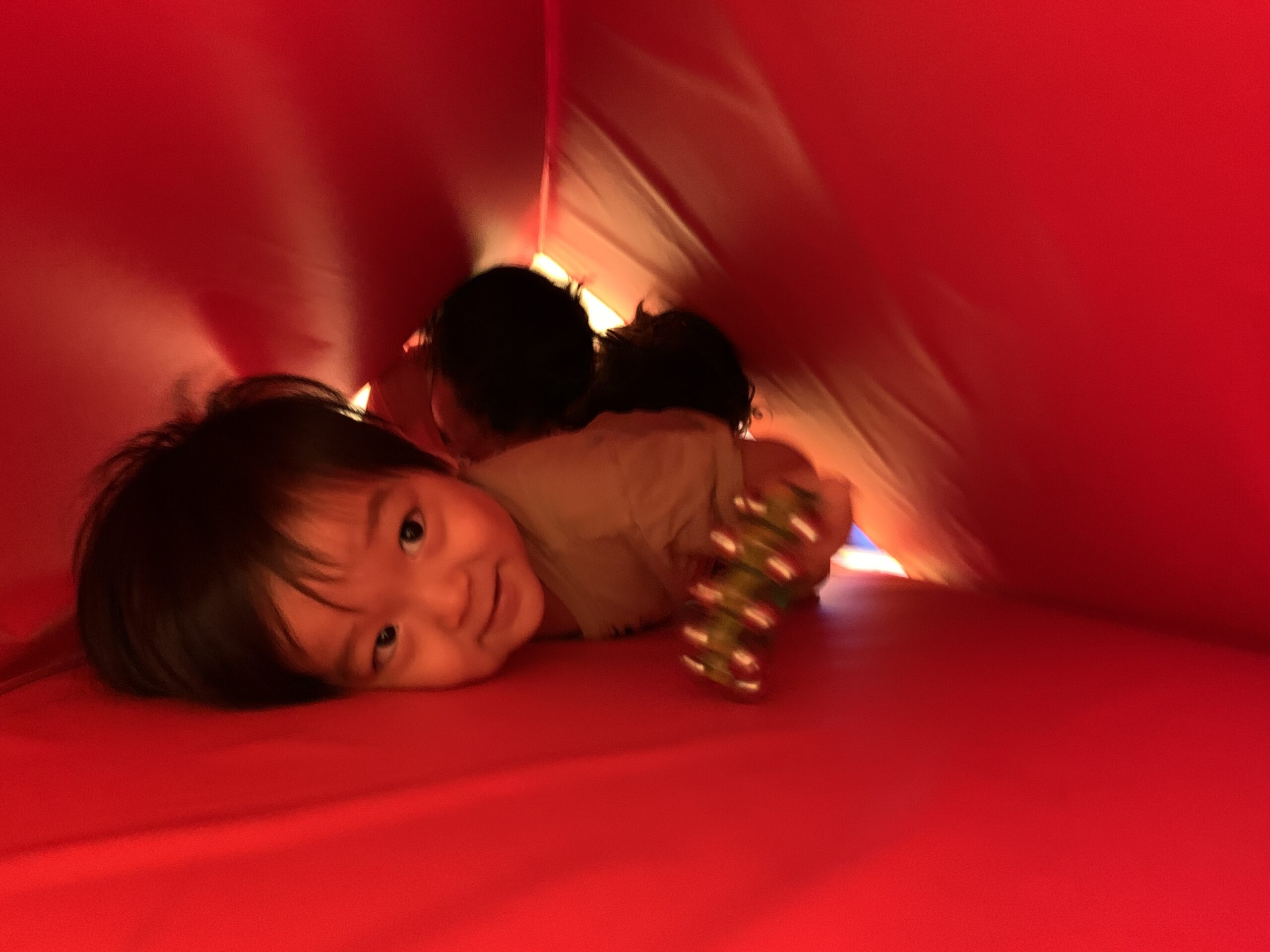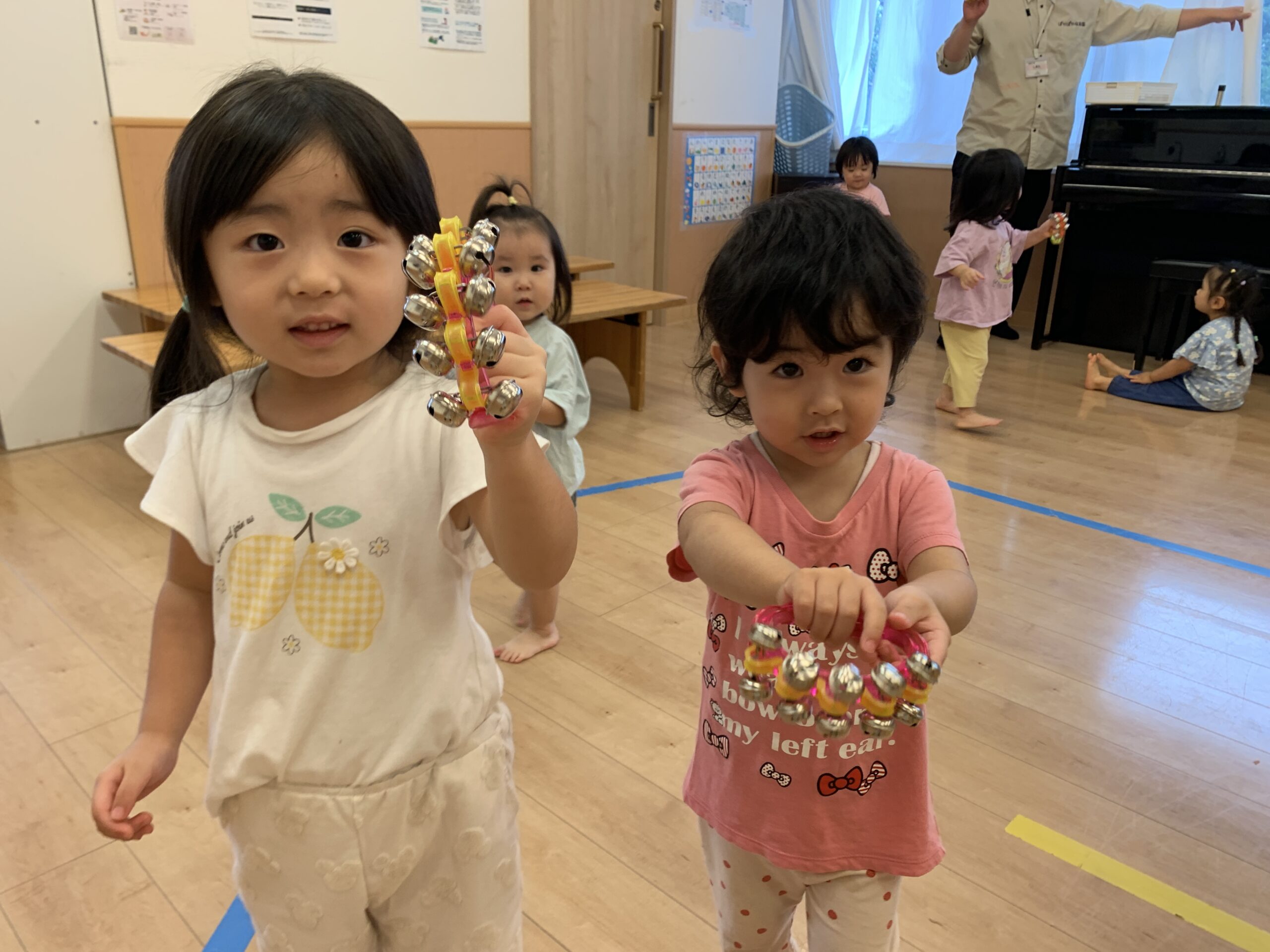 その後は、マットをトンネルにして、みんなで鈴を持って「リンリン」と鳴らしながら、