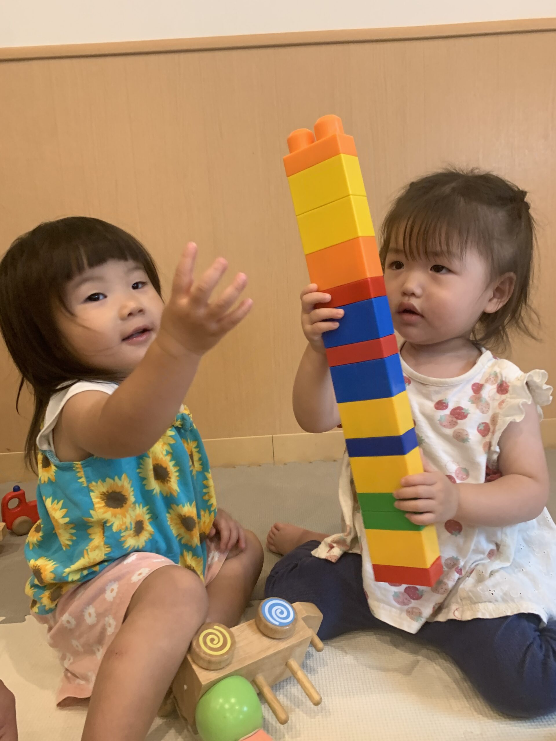 「せんせい、できたよ!」と、高く積み上げたブロックの塔を自慢げに見せてくれる子もいます。