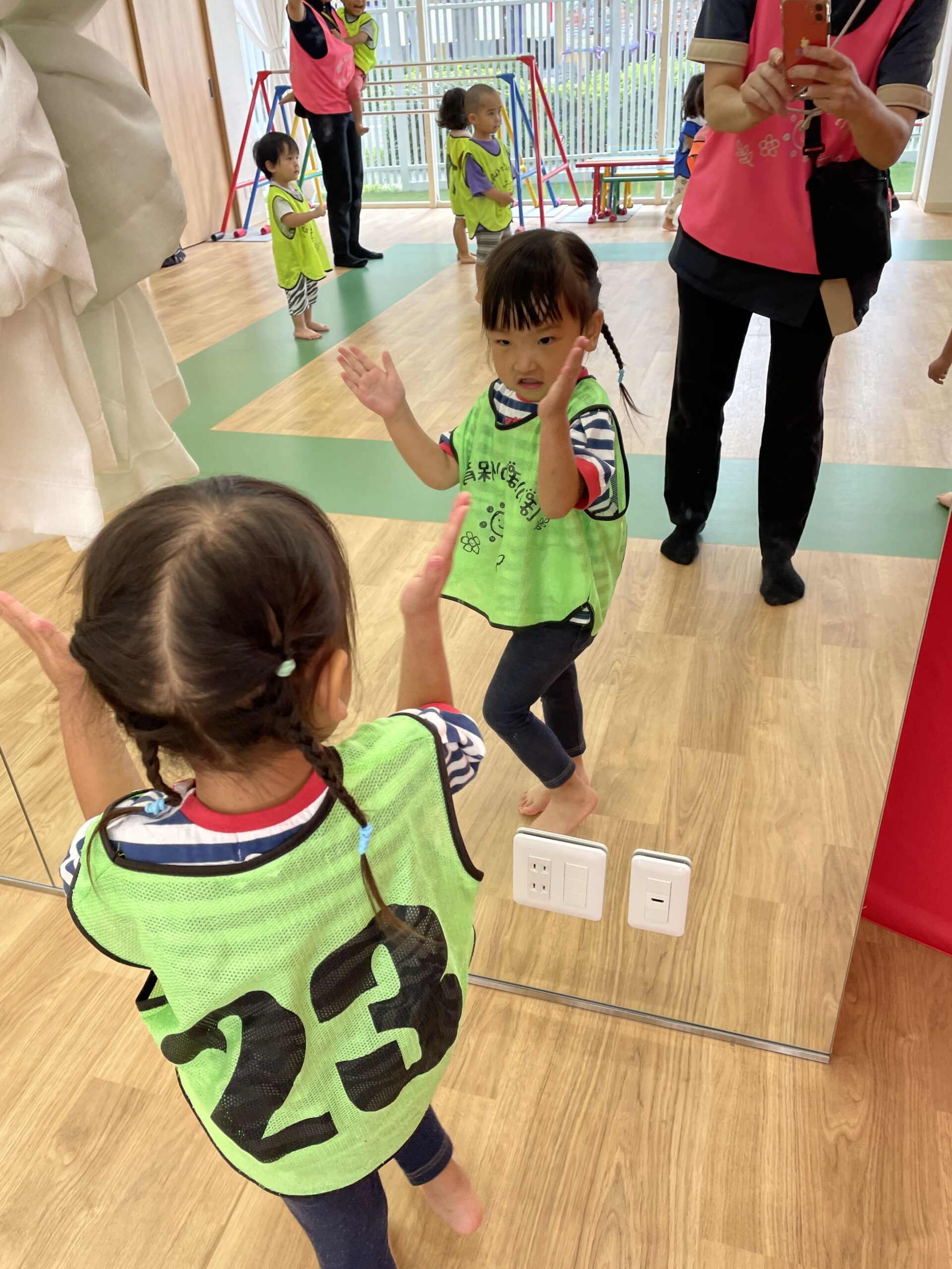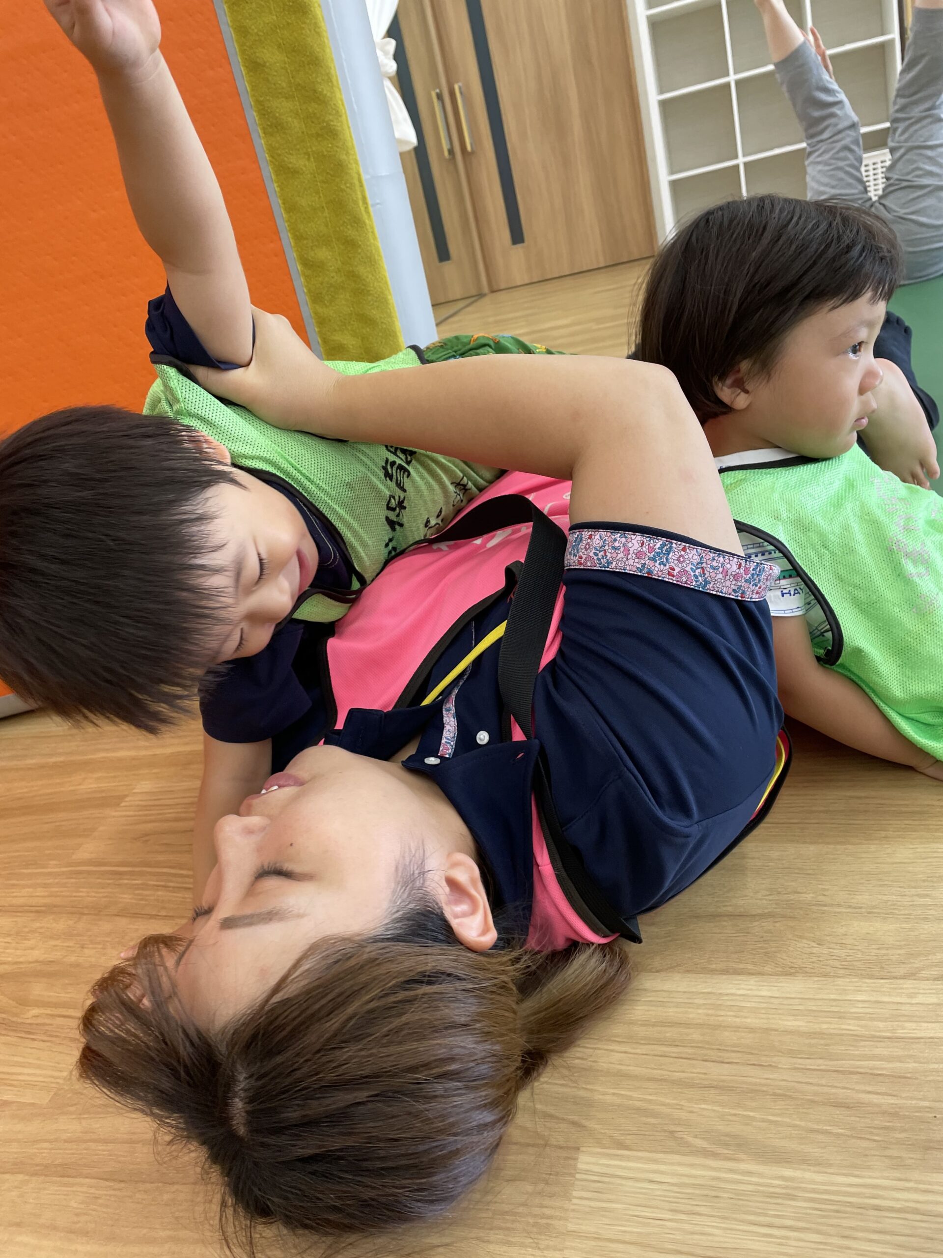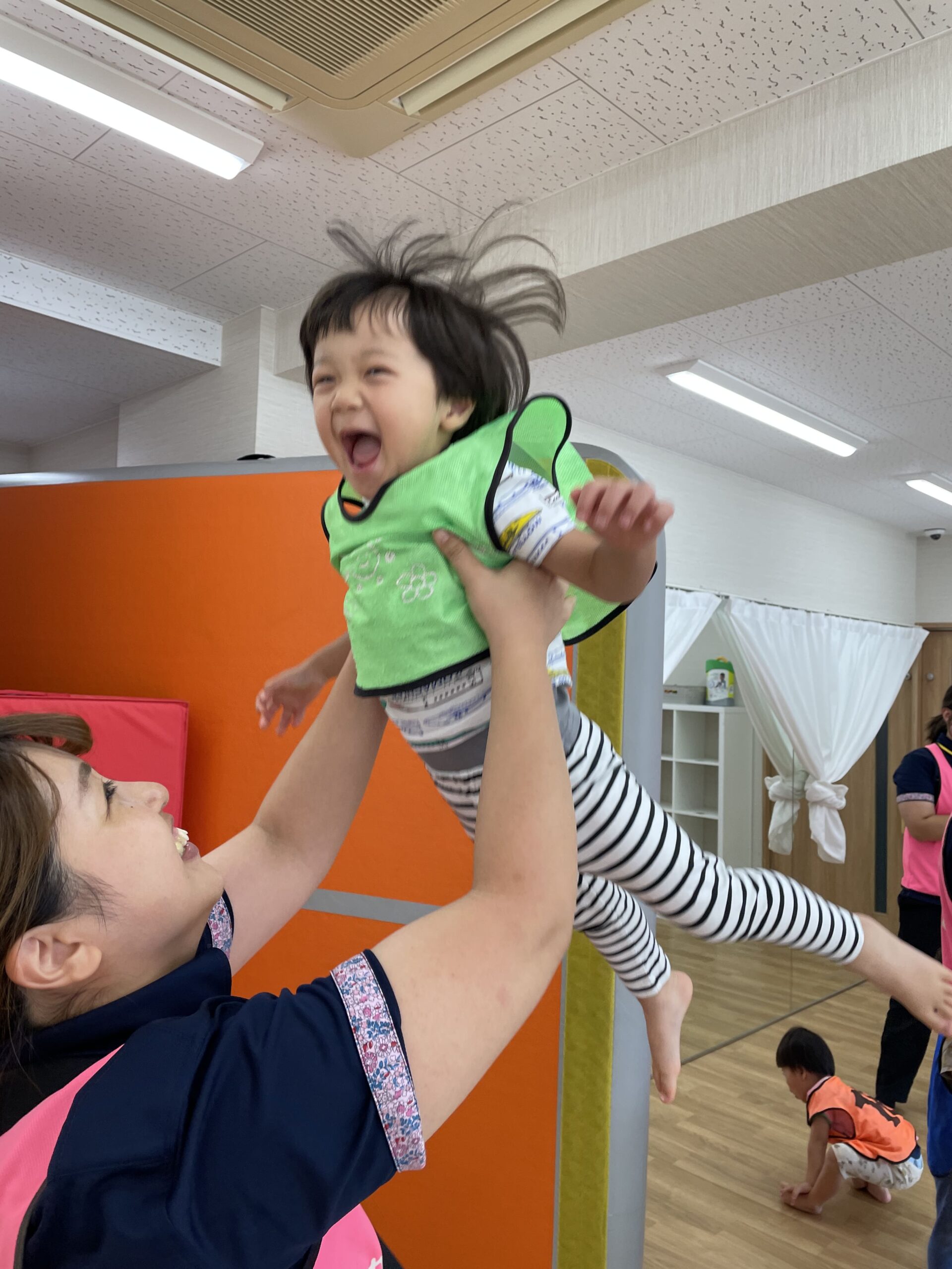 ジャンプする時間は先生が高い高いをしました。とても嬉しそうに「わー!」「もっとやって-!」と嬉しい声が響きます。表現する楽しさと協力する喜びが、ダンスの時間の中で自然に育っていきました。