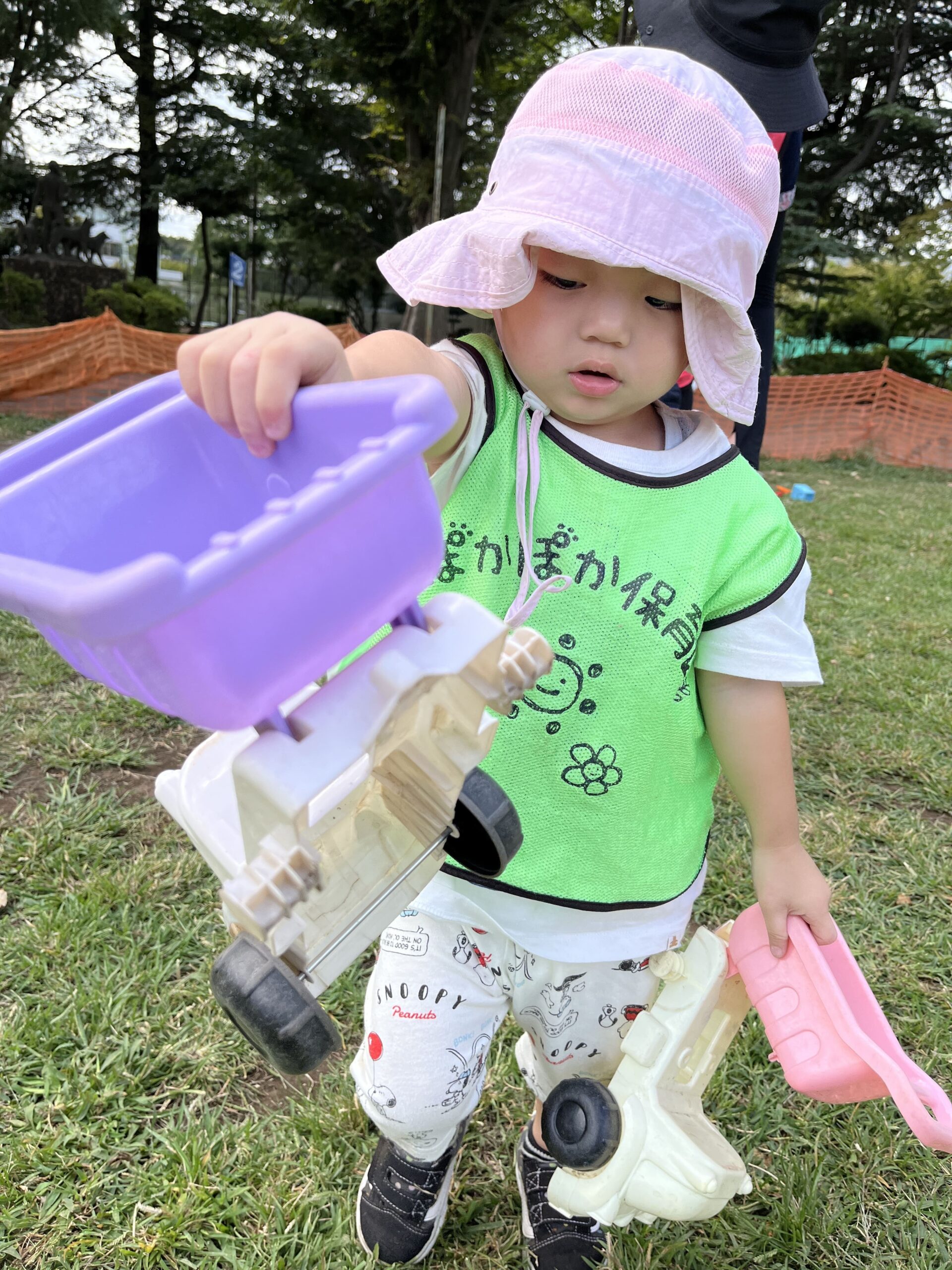 砂場おもちゃも大活躍。「この車、芝生で走るかな?」と先生が問いかけると、「やってみる!」と0歳も1歳もチャレンジ。