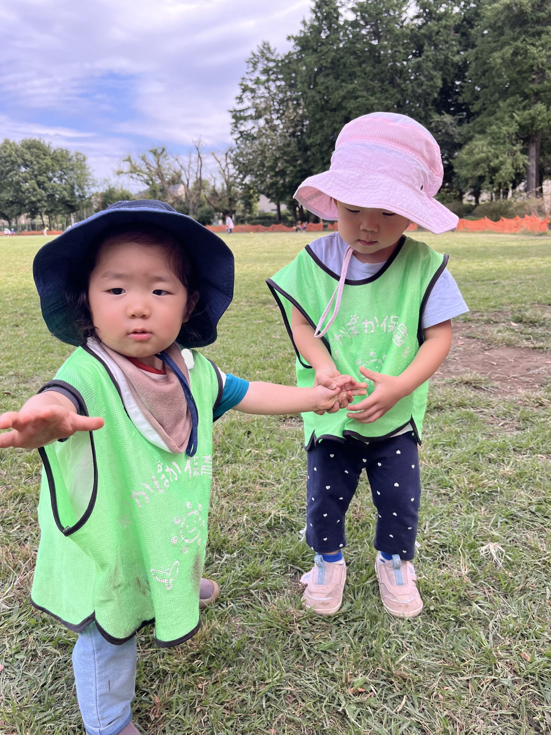 朝は雨が降っていたけど、すぐに晴れて気持ちのよい空。0・1歳は公園へ、2歳はダンスカリキュラムに分かれて活動しました。