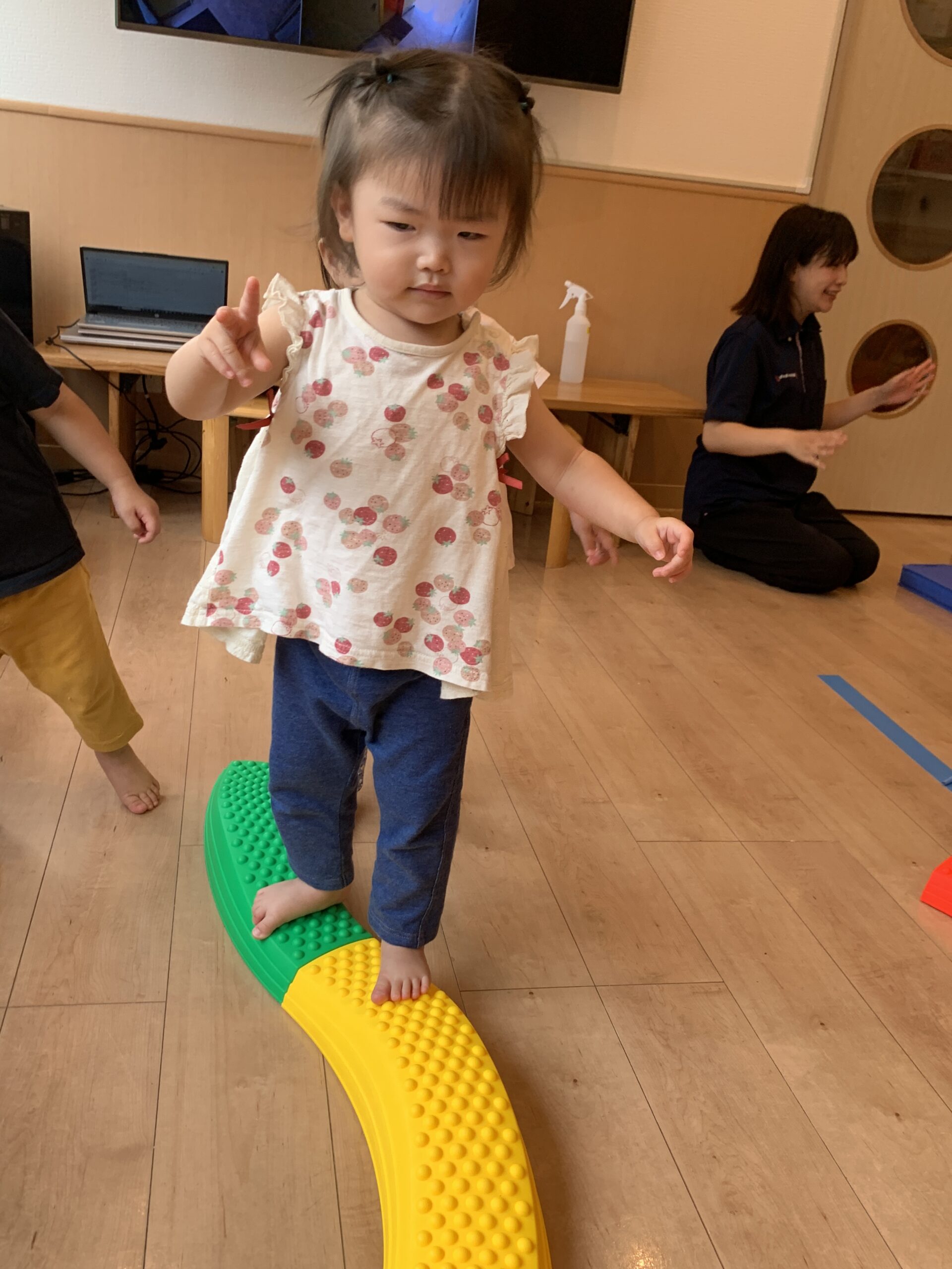 繰り返して遊ぶうちに、なんと両足で平均台に乗り進むことができるように!