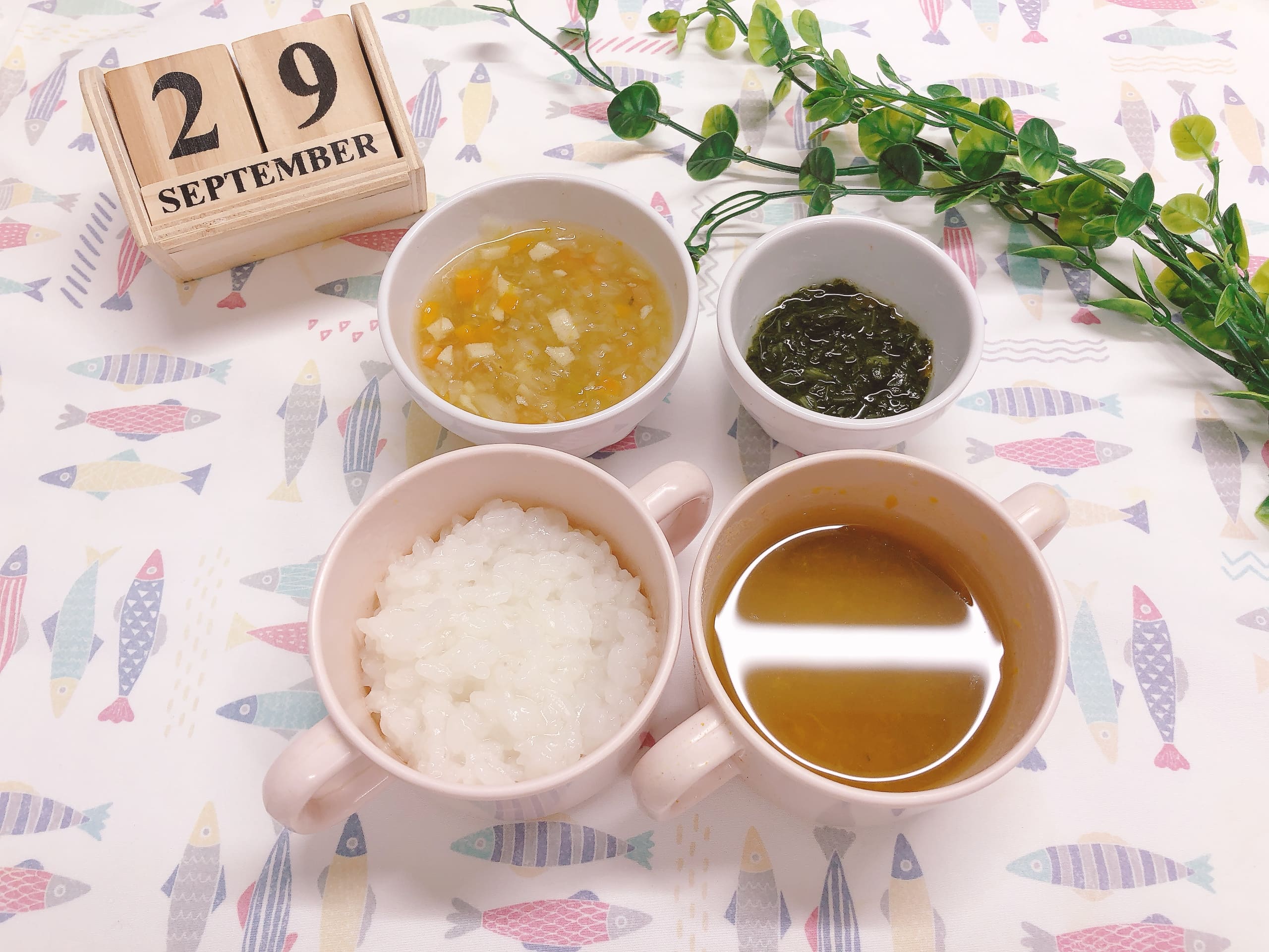 国産米をふっくら炊き上げ、粒感を残すことで咀嚼力アップを促進。そぼろ煮や梅和えのだしをしっかり受け止めます。
