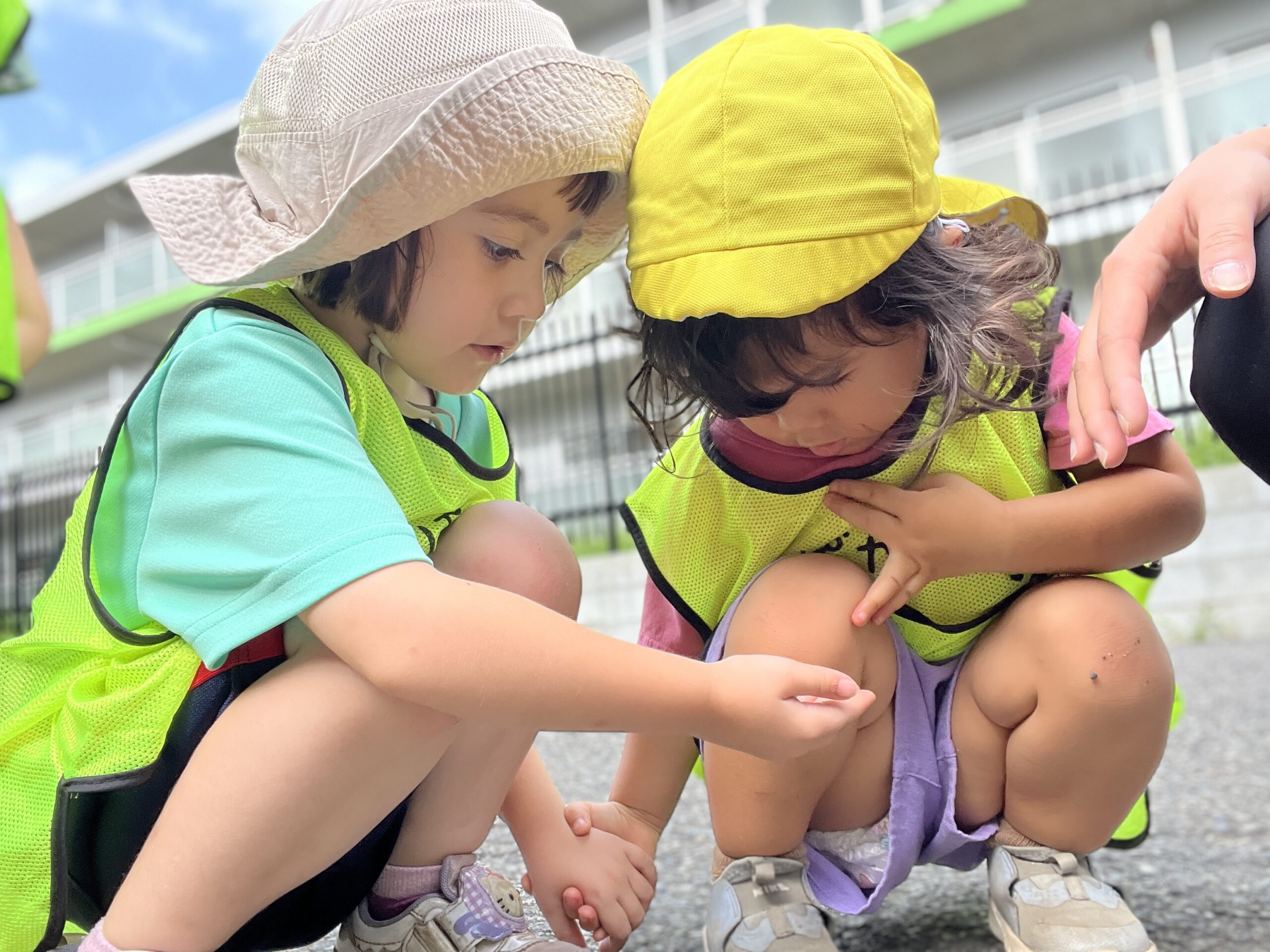 「先生、見て!おっきなイモムシがいる!」と、一人の子が指をさすと、みんな集まってきて興味津々。「ほんとだね、ゆっくり動いてるね」と、先生も一緒に観察し、小さな命に触れる機会となりました。