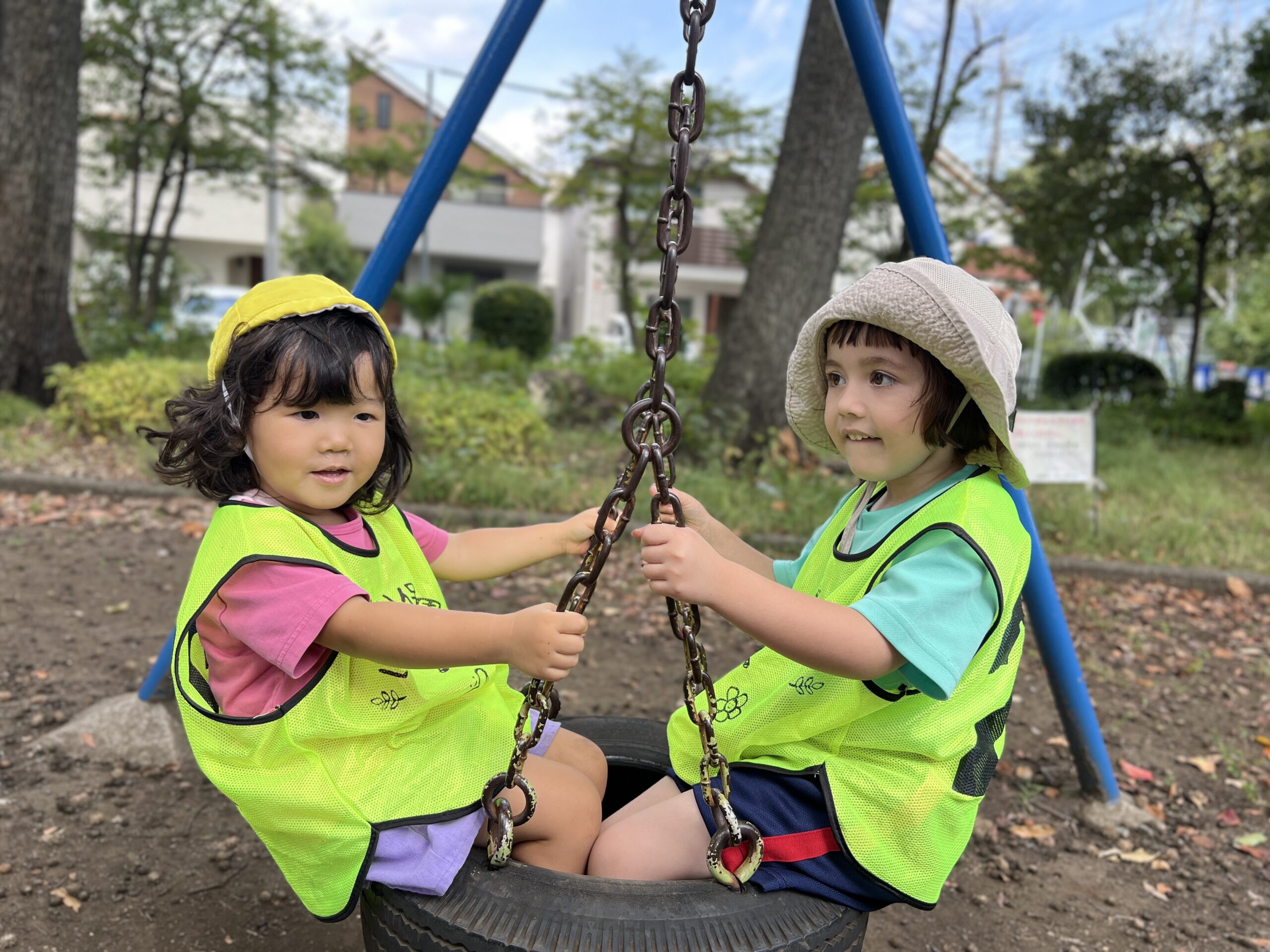タイヤのブランコでは、「ゆらゆら揺れるね!」と、