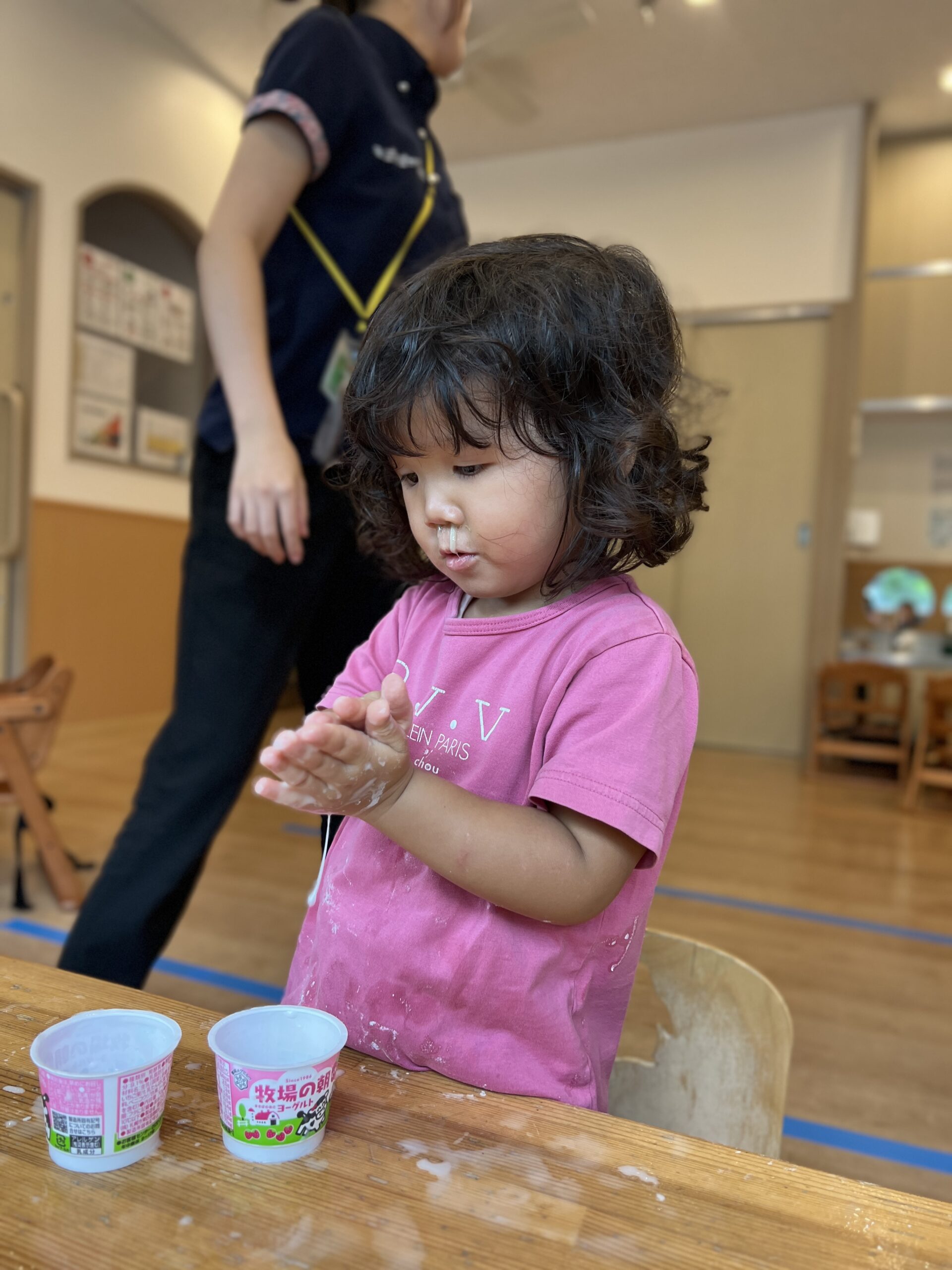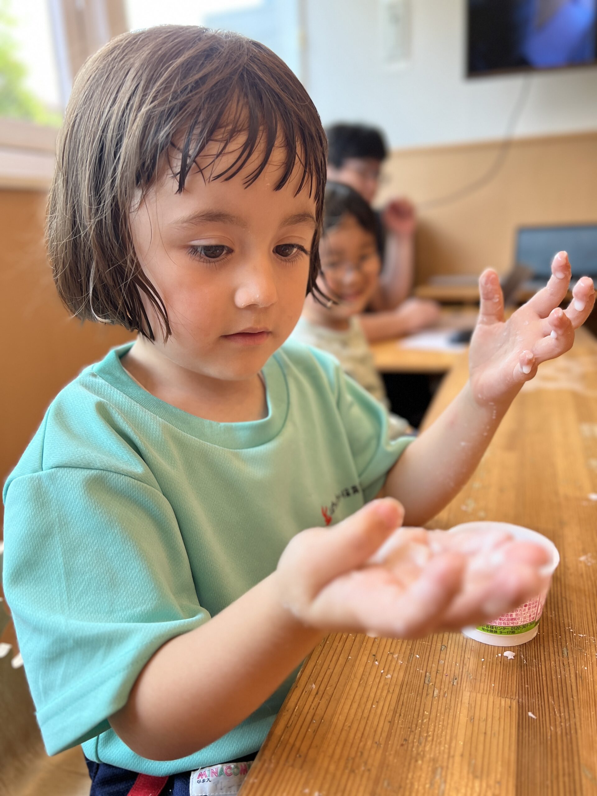 園に戻ってきてからは、室内で片栗粉と水を使った感触遊びをしました。白い片栗粉に水を混ぜていくと、サラサラからドロドロ、そしてギュッと握ると固まる不思議な感触に、みんな釘付けです。