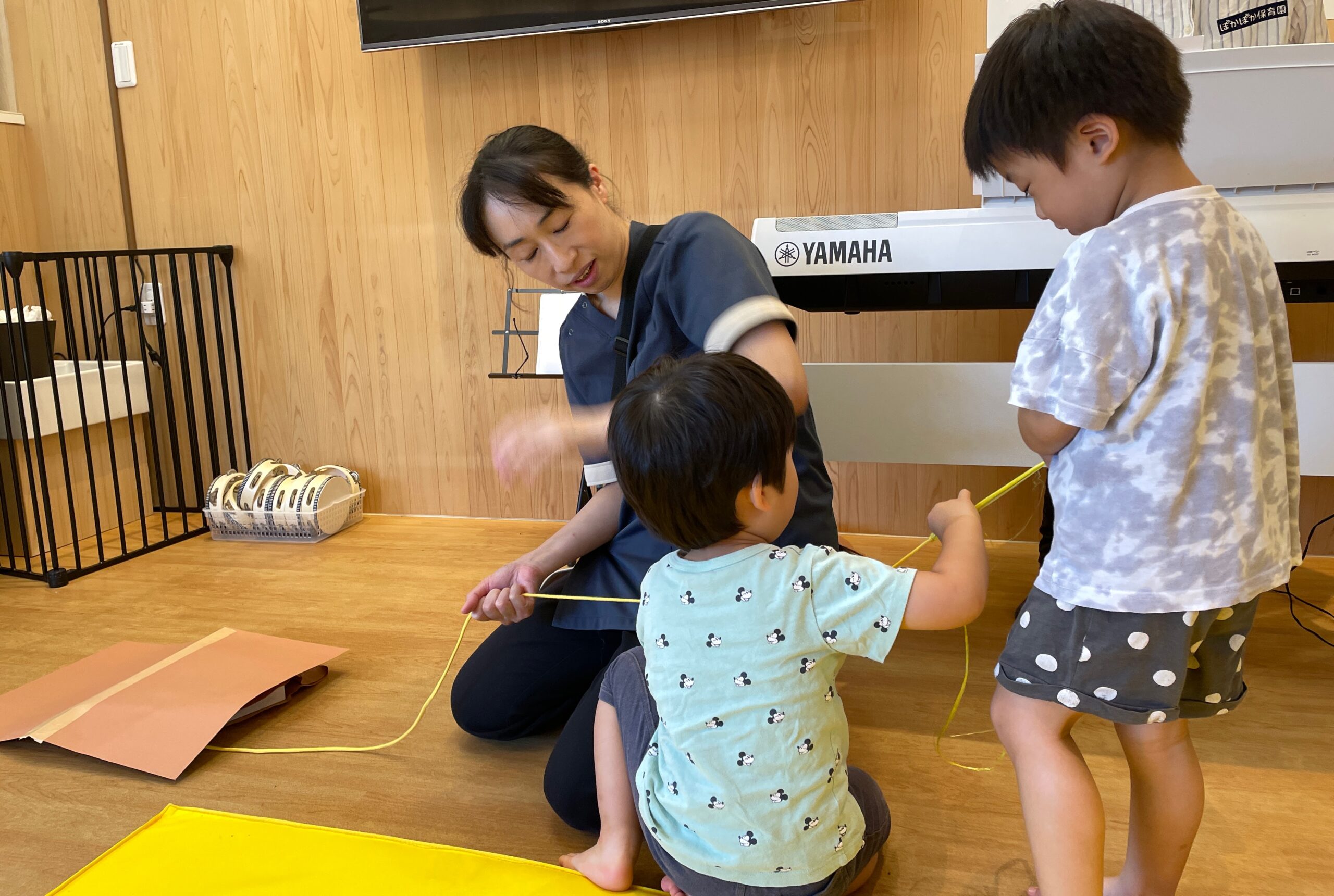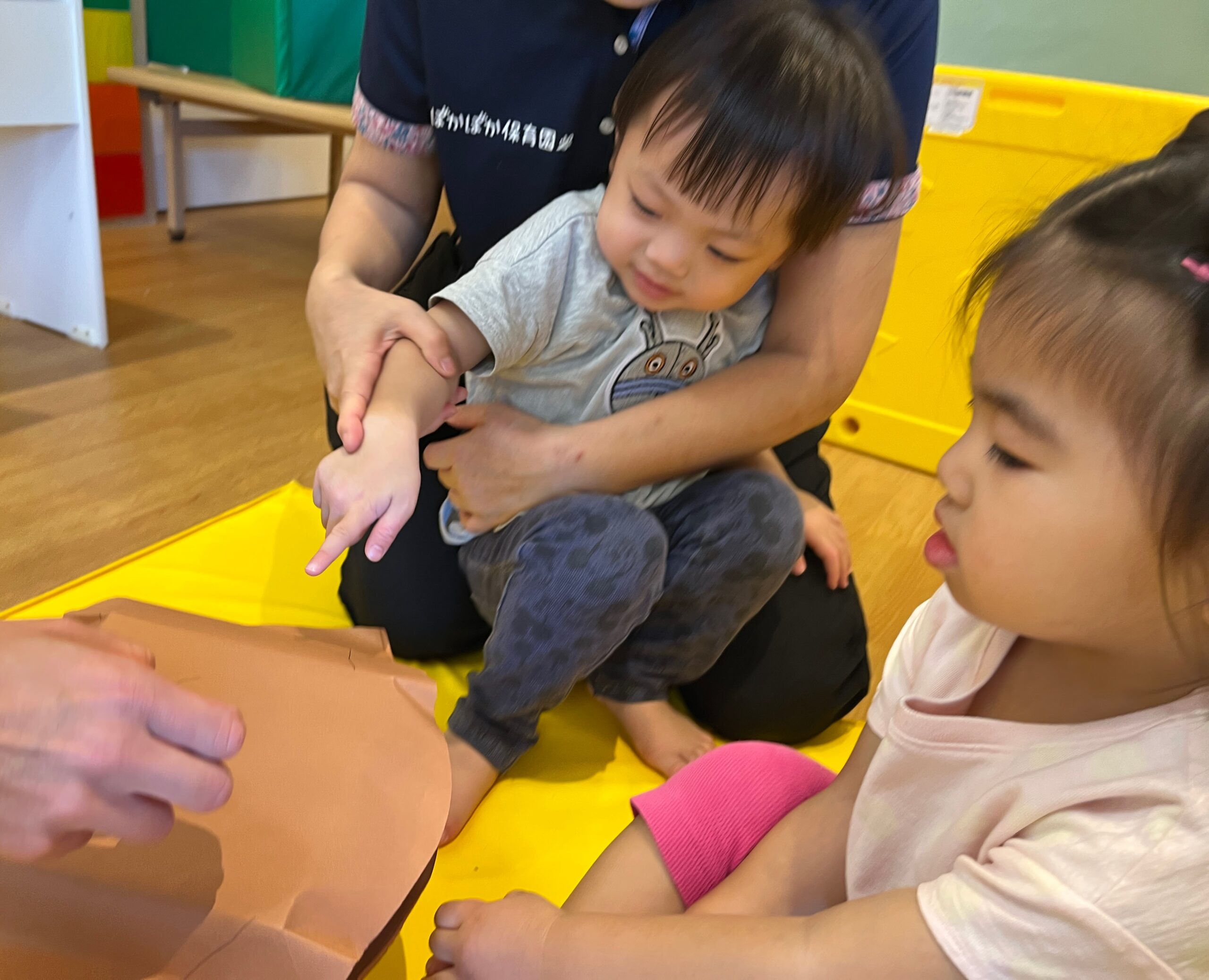 大きなおいもの歌に合わせて、先生に引っ張ってもらいましょう。