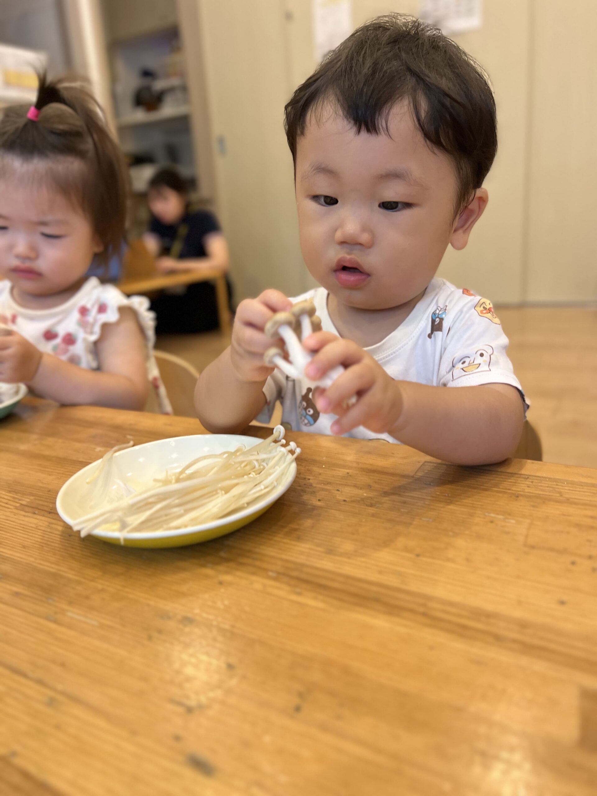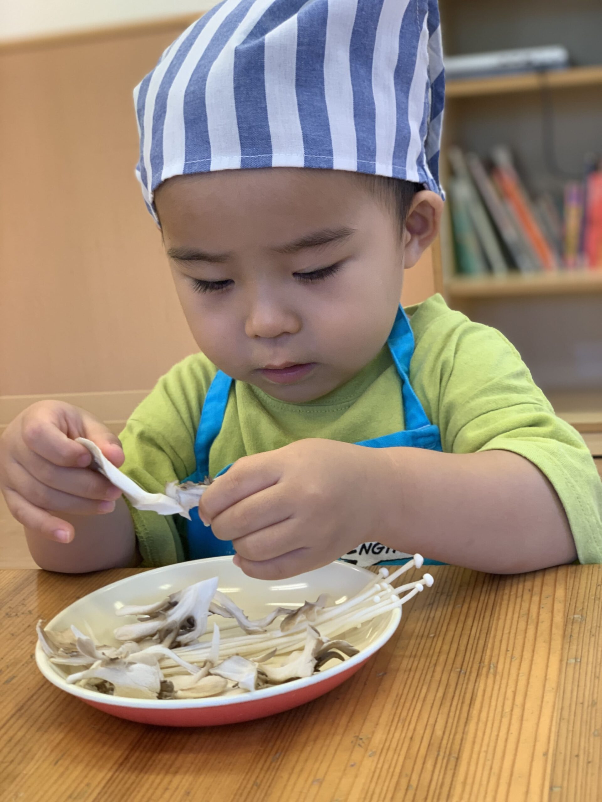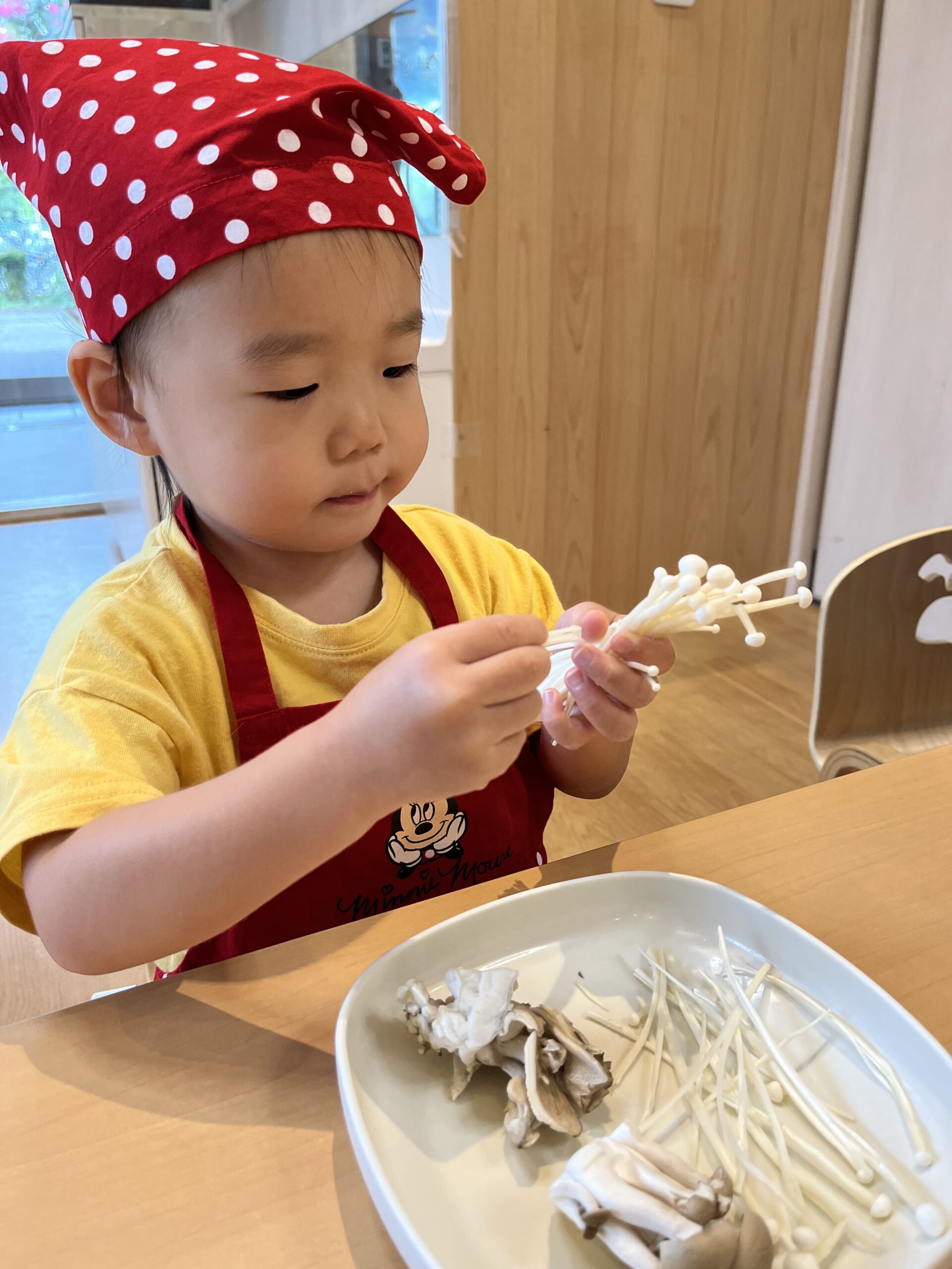 食育の一環として行っているクッキングを本日行い、子どもたちがちぎったり割いたりしたきのこをふんだんに入れました!お野菜に混じっているきのこを探しながら食べていました!