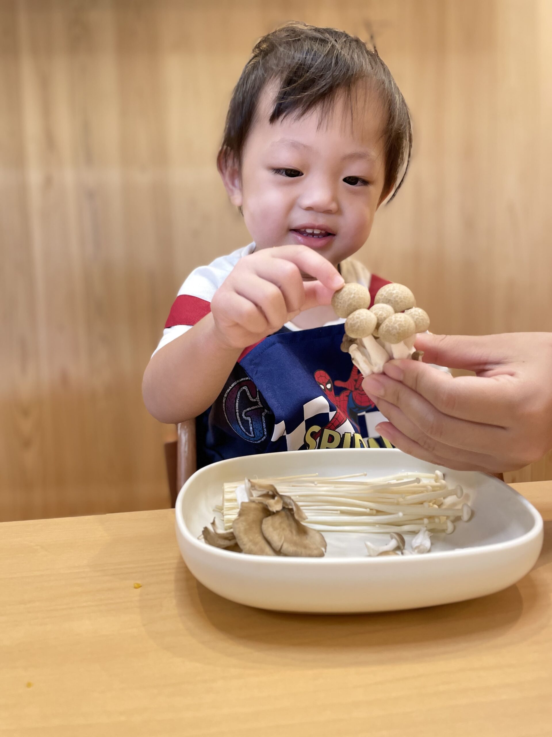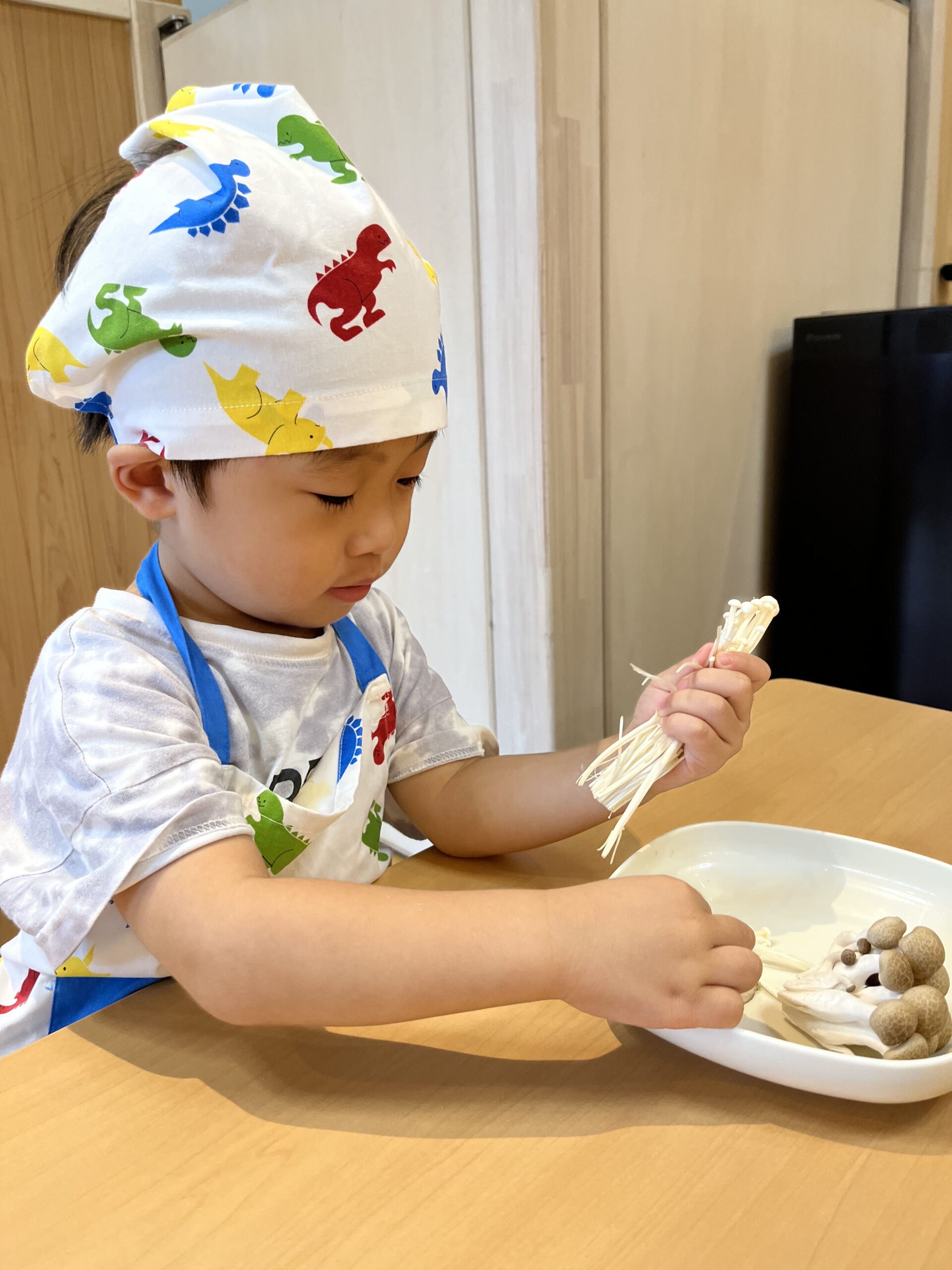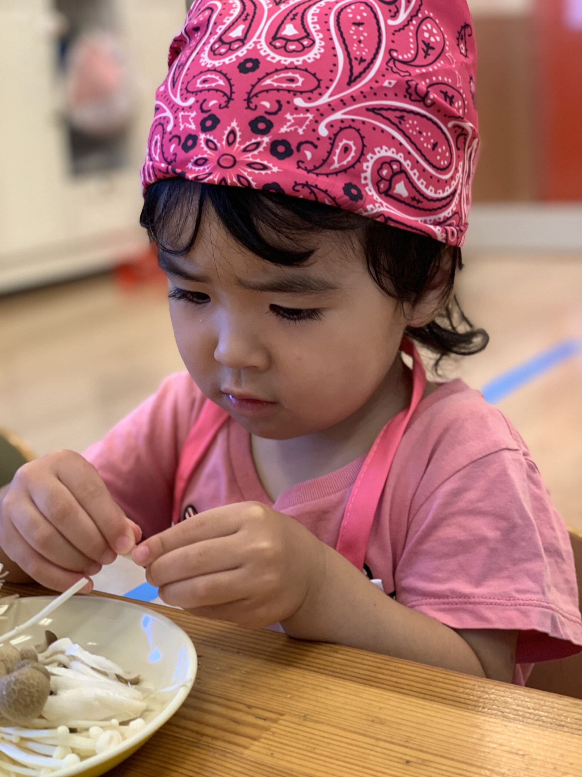 食育の一環として行っているクッキングを本日行い、子どもたちがちぎったり割いたりしたきのこをふんだんに入れました!お野菜に混じっているきのこを探しながら食べていました!