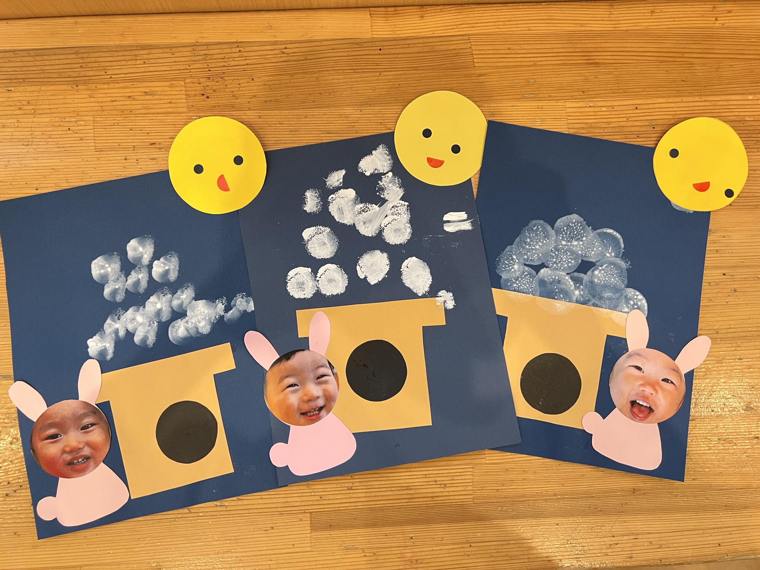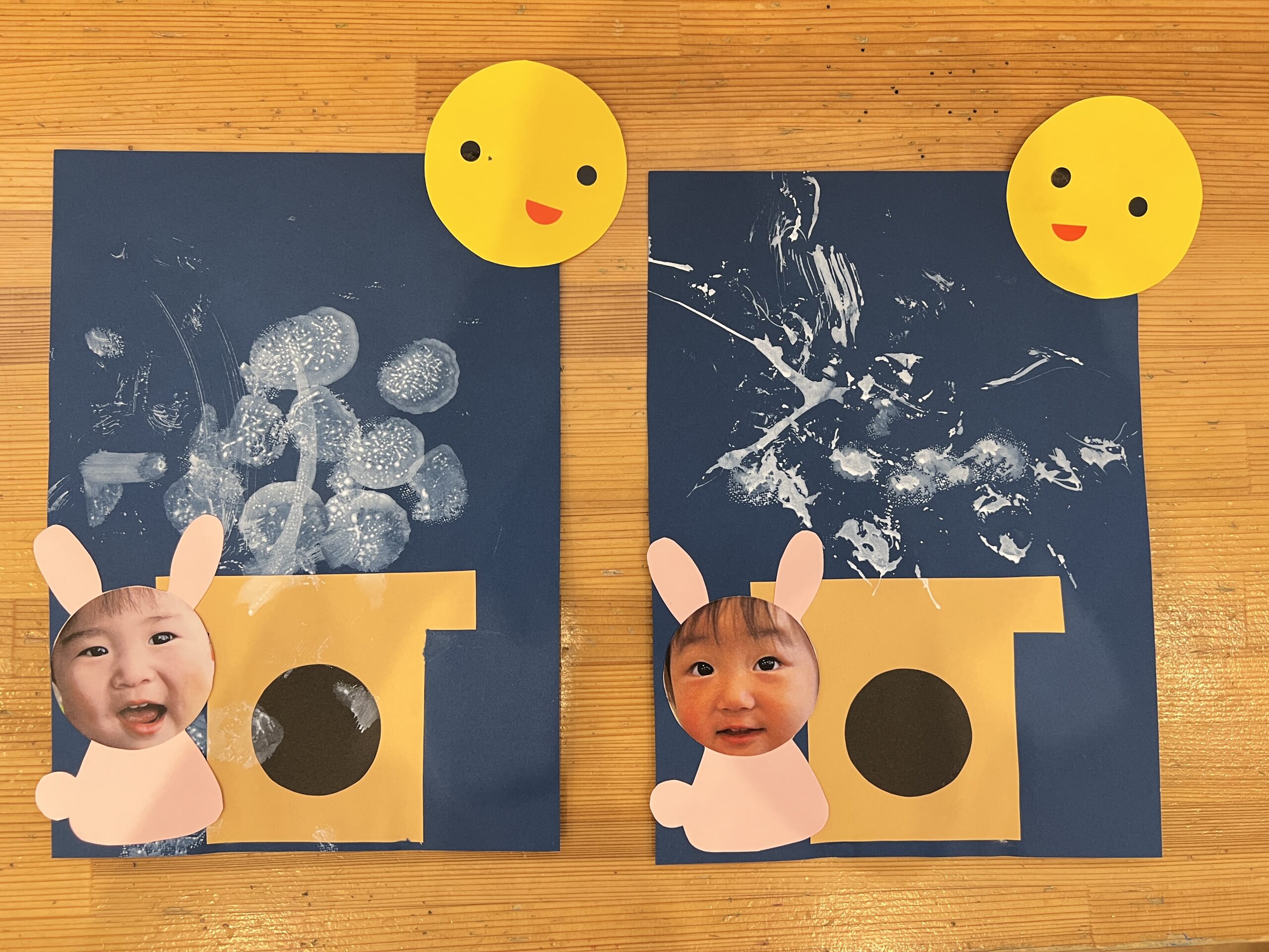 お月様も右にいたり左にいたりと子どもたち自身でどちらに貼るか決めて貼っています♬