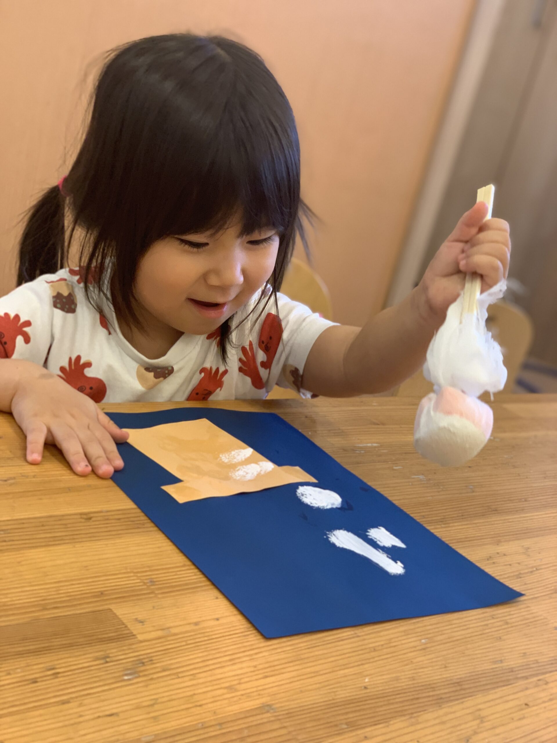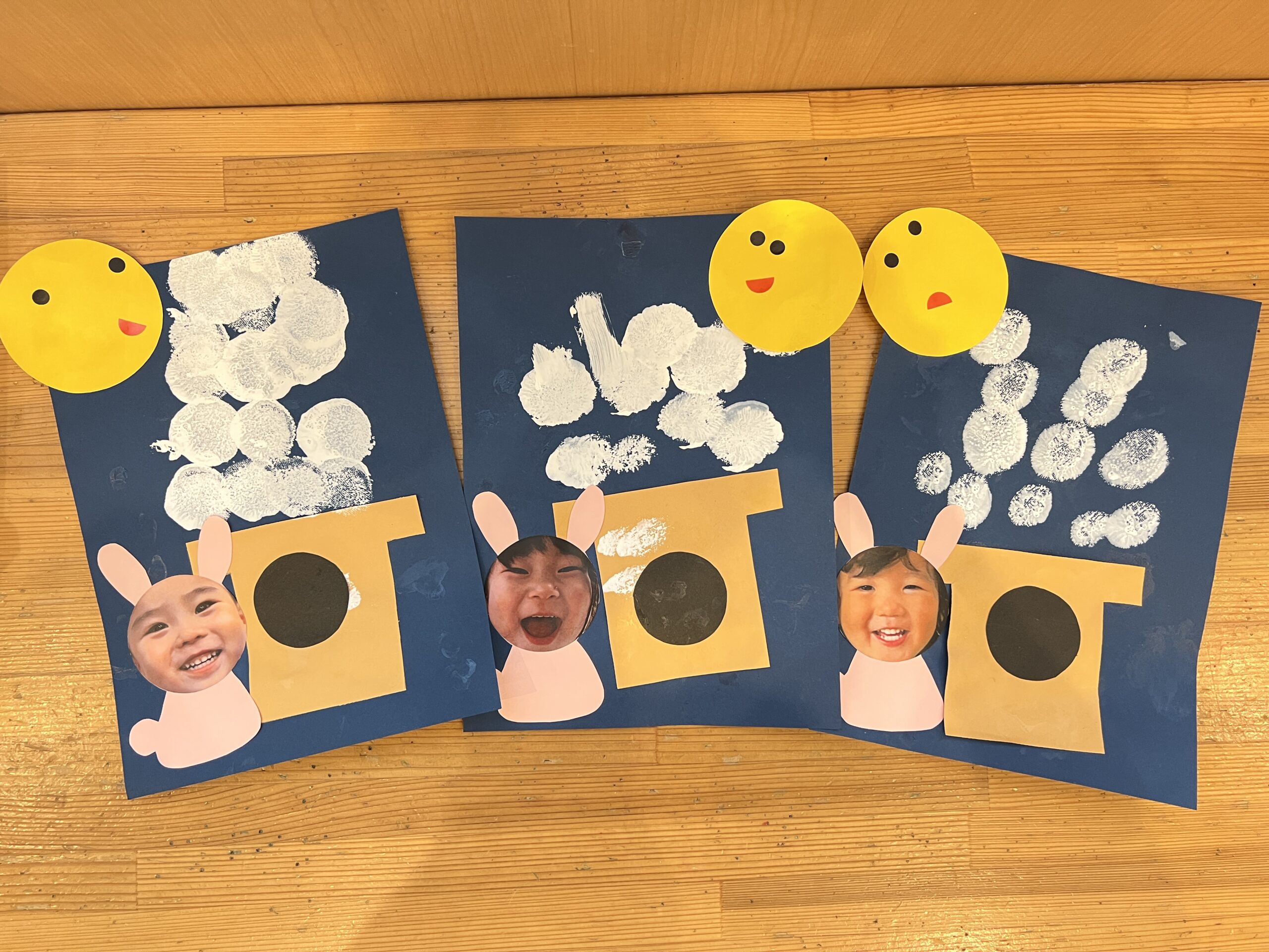 お月様も右にいたり左にいたりと子どもたち自身でどちらに貼るか決めて貼っています♬