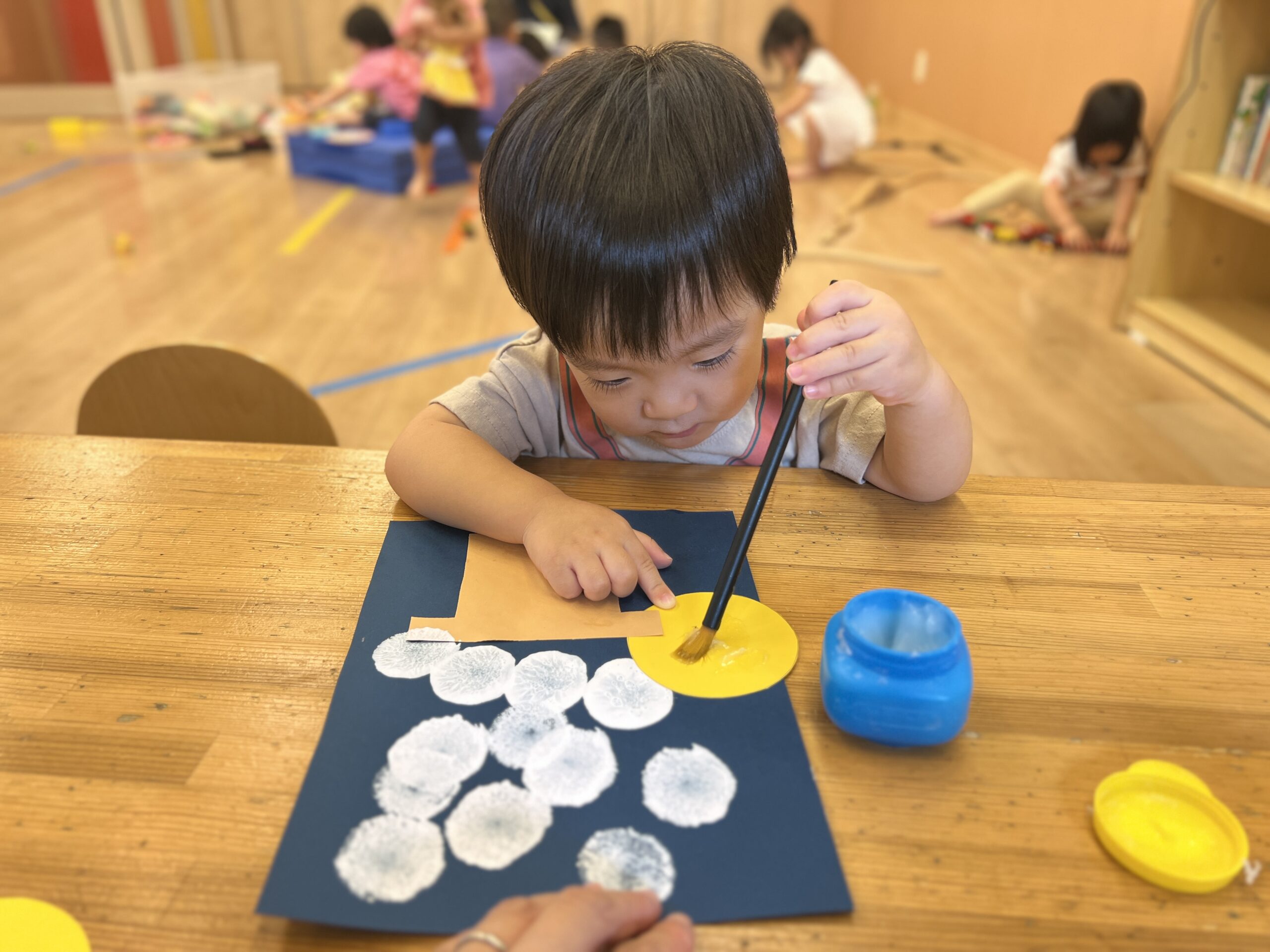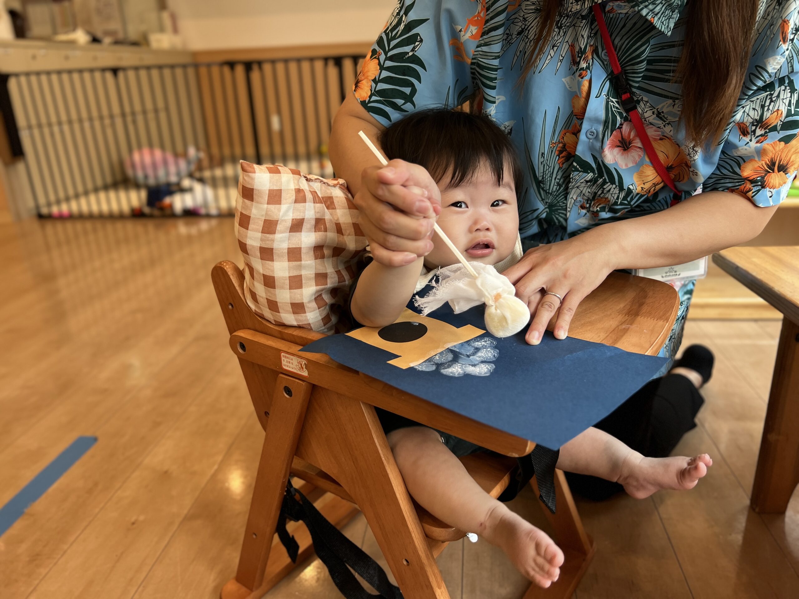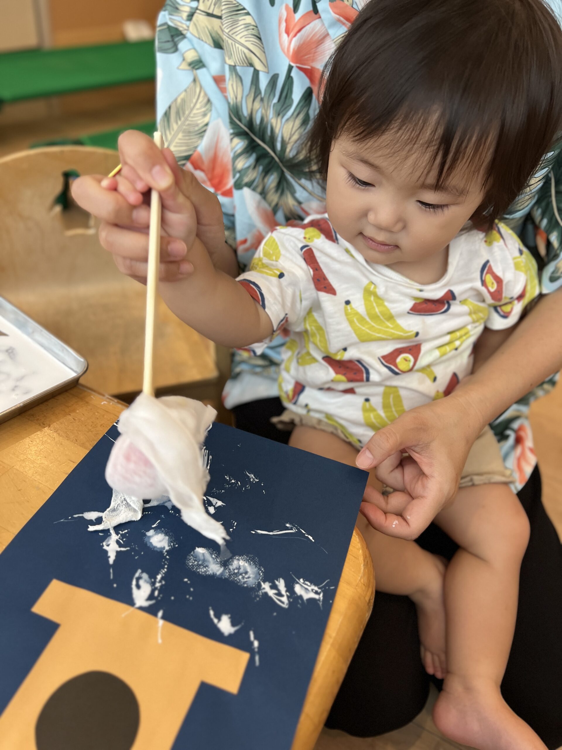 0歳児さんは先生と一緒に初めてのタンポ押し!