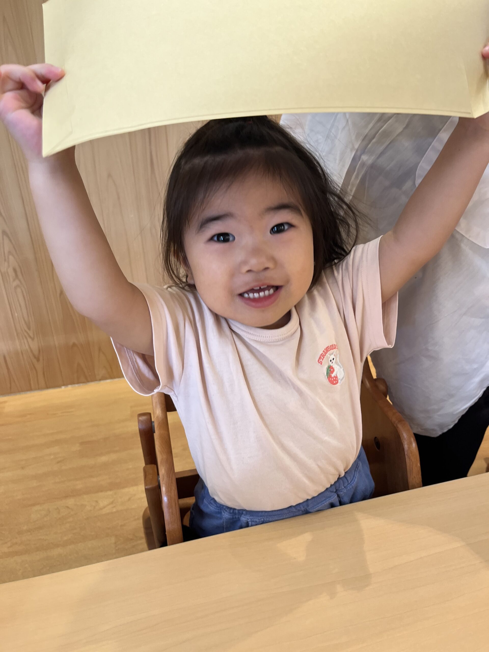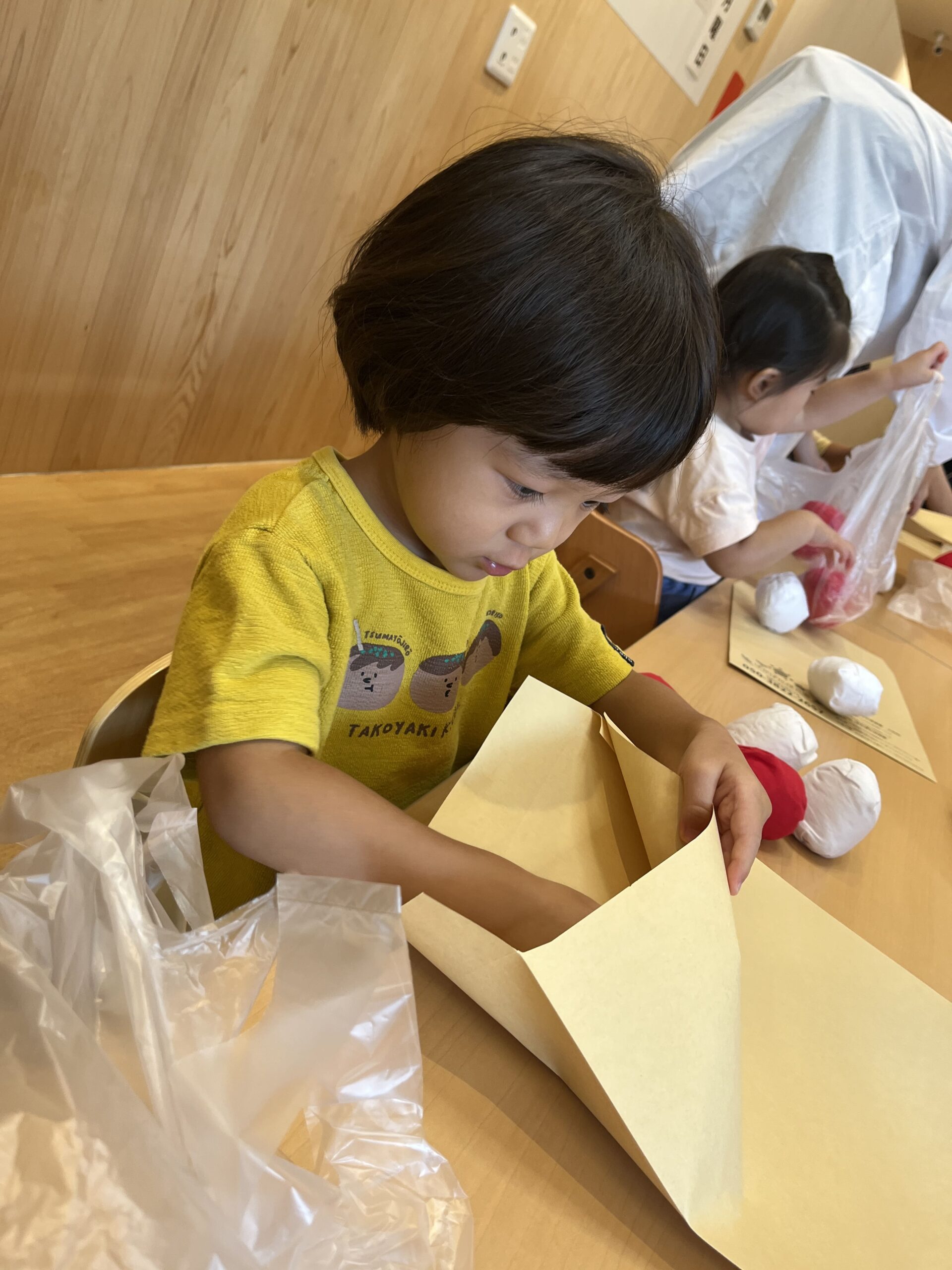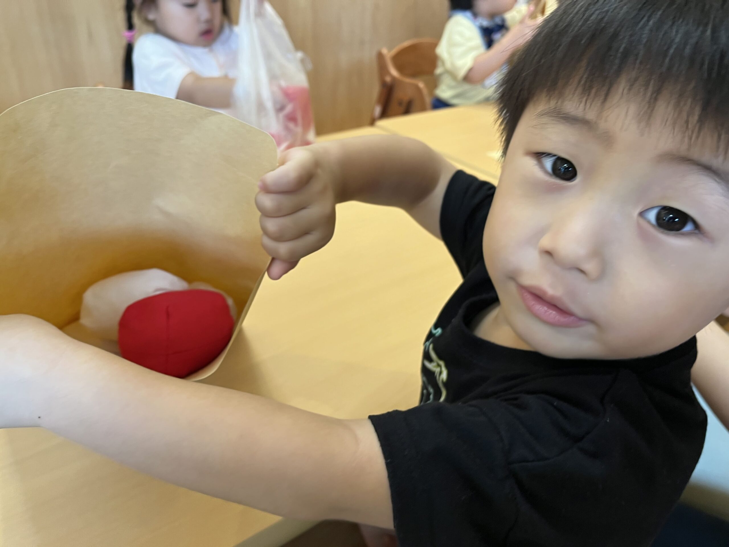 袋を自由に触れられることがうれしくて、手に持って上にあげたり、においを嗅いだり、カサカサ・ガサガサの音に耳を澄ませたりと、物を入れる前から探求心があふれていました。入れること自体が楽しく、何度も出し入れを繰り返し、入れ方を工夫する姿も。紙袋は底を広げるとたくさん入ることに自分で気づいた子、ビニール袋は伸びるから軽い物なら増やせるかも。小さな科学者の表情がきらりと光りました。