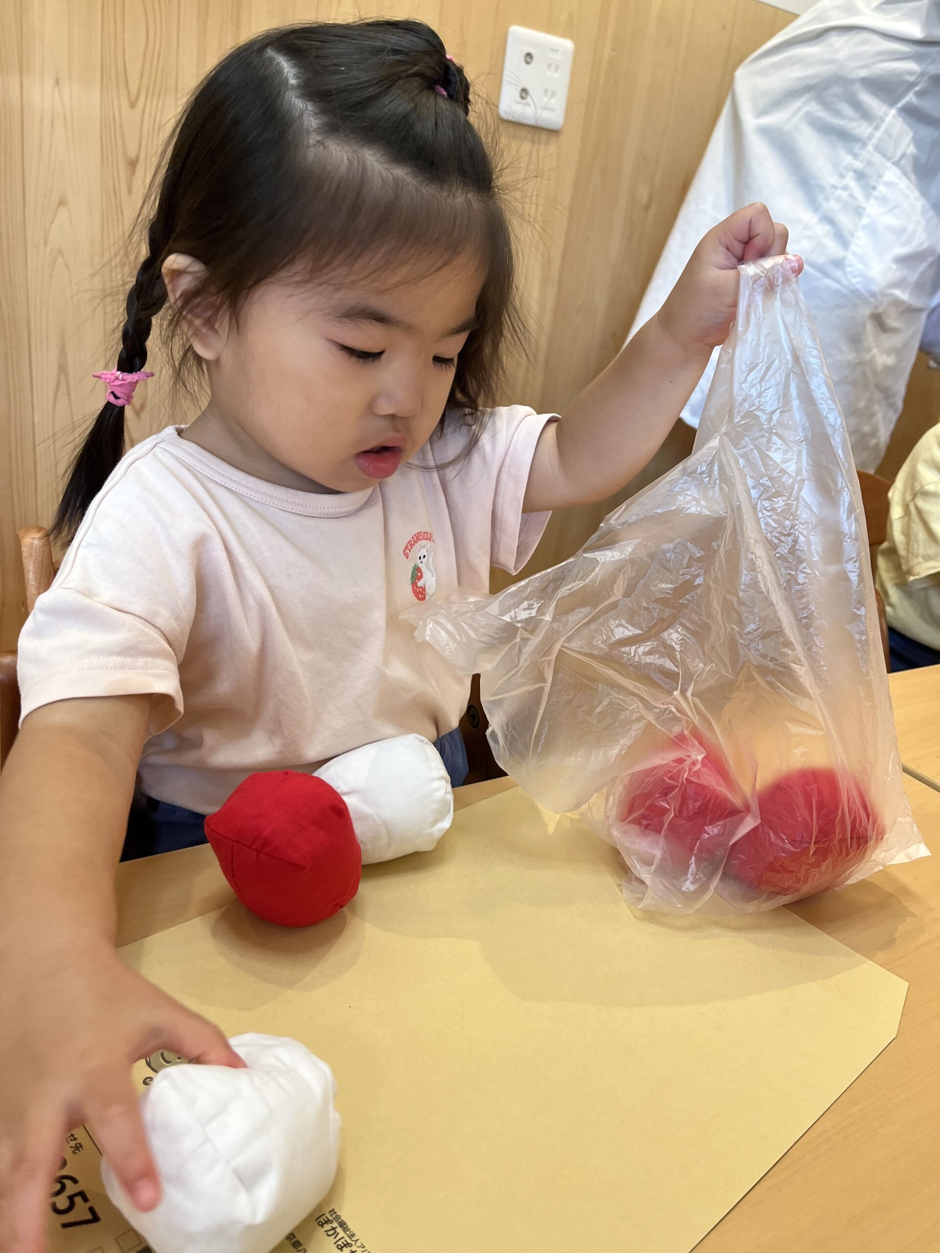 テーマは「ビニール袋と紙袋、どっちがたくさんはいるかな?」。同じ大きさの玉を一つずつ入れ、数が分かる2歳児さんは声に出してカウント。途中で袋の形の変化を観察し、空気を含ませたり、底を広げたり、持ち手の強さも比較しました。破れにくさや音の違いもチェック。いつもと違う素材にワクワクしています♪