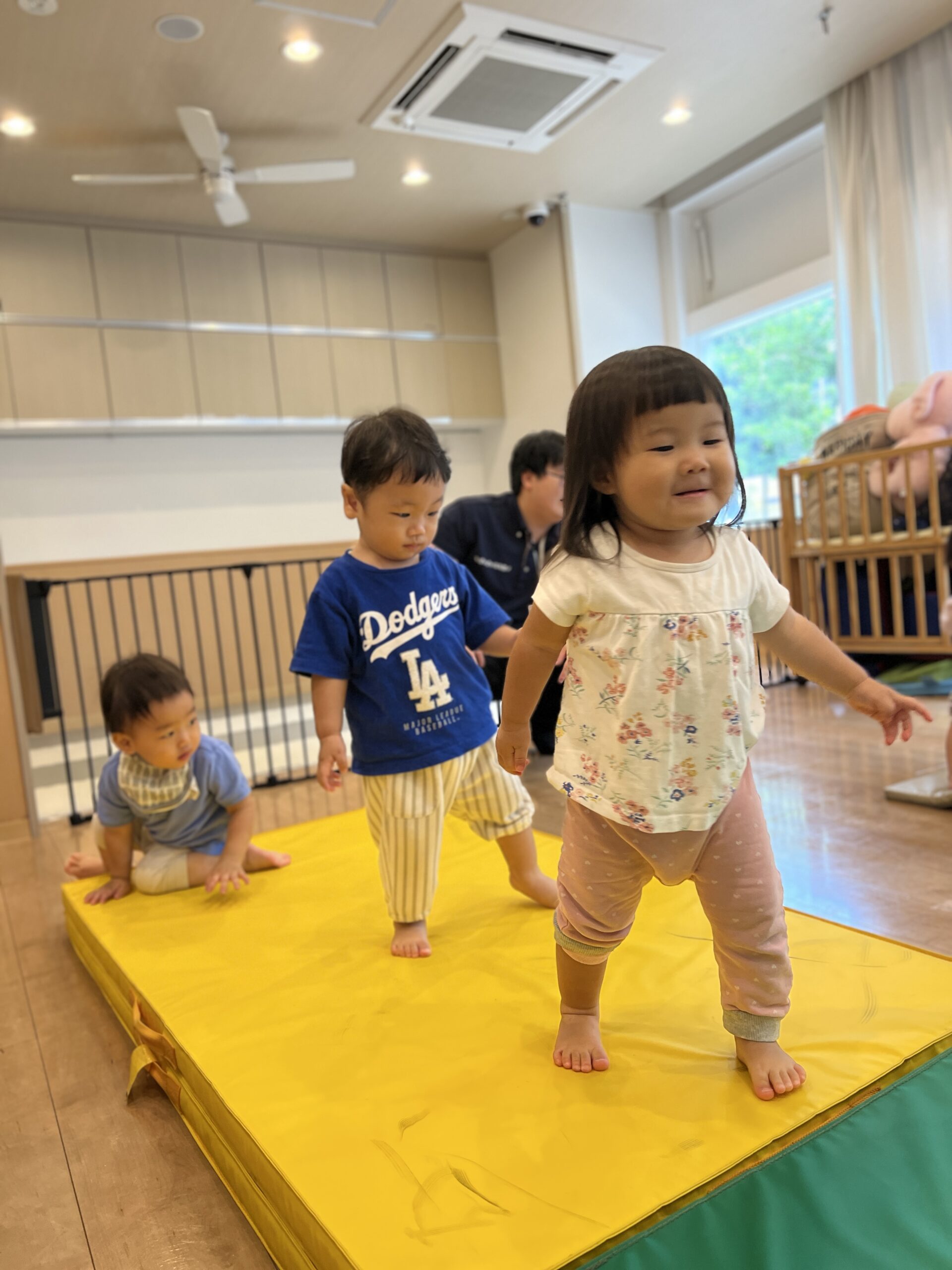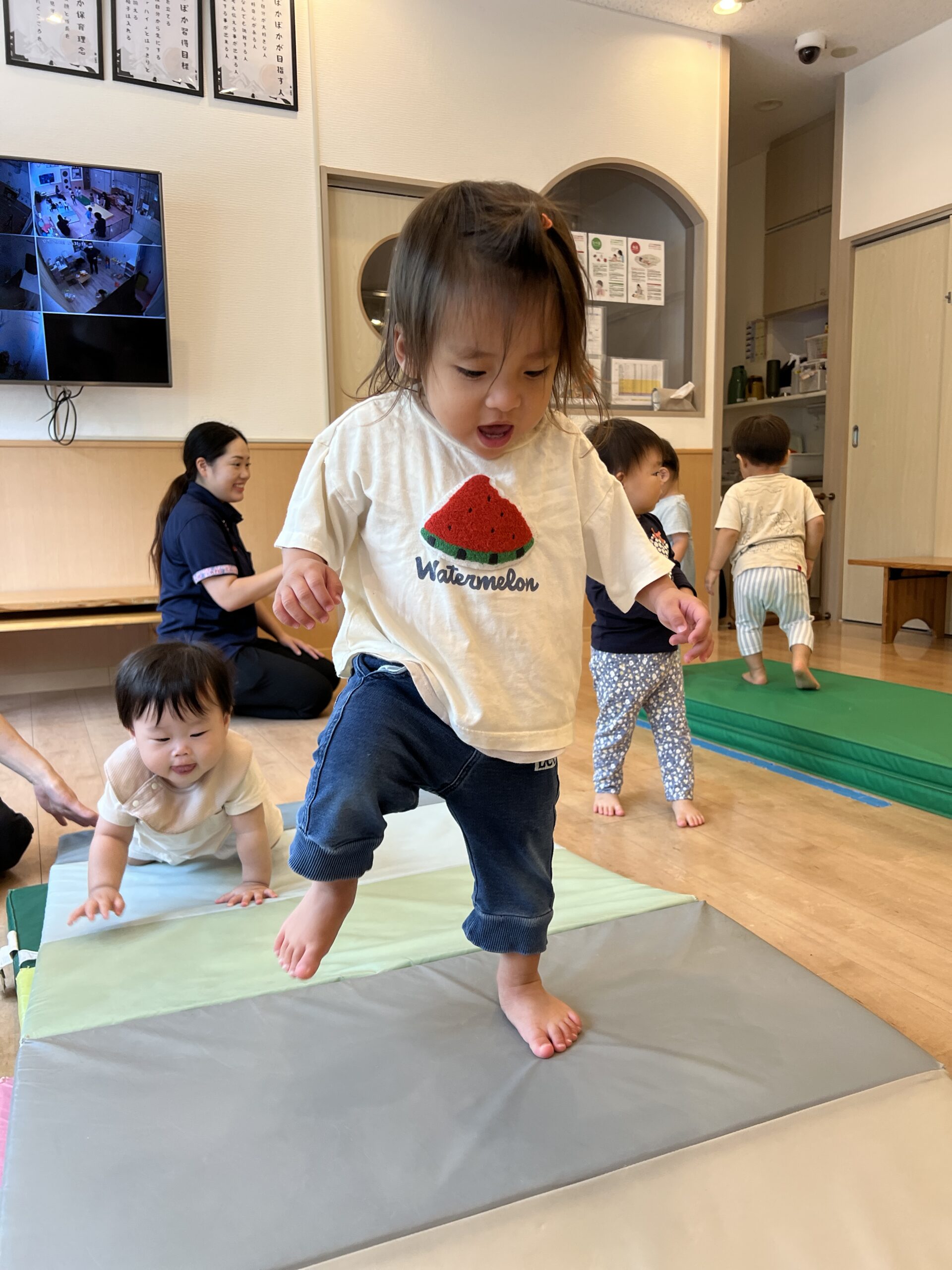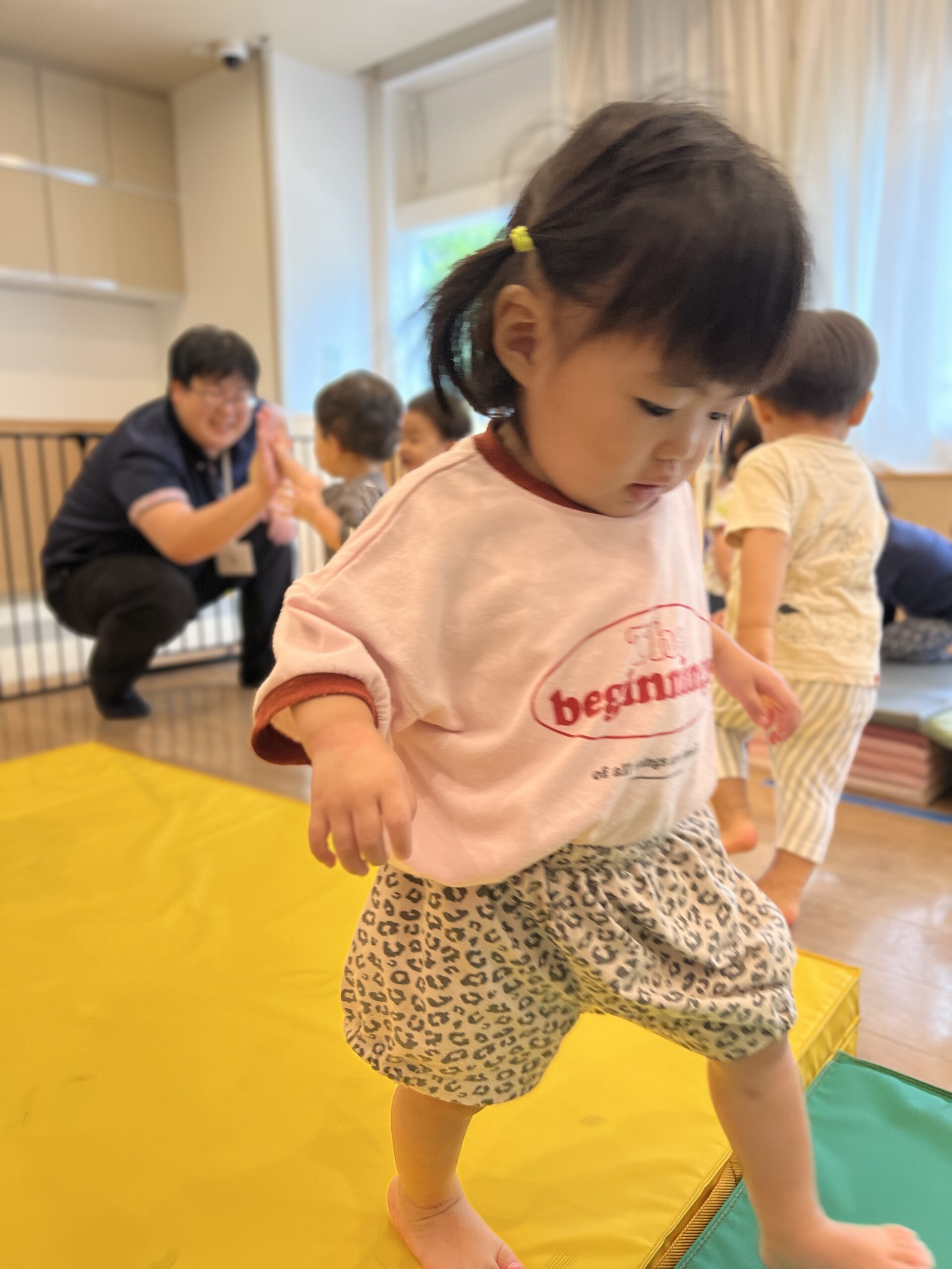 午前中、小さいお友だちはお部屋の中で「体育遊び」に挑戦しました。