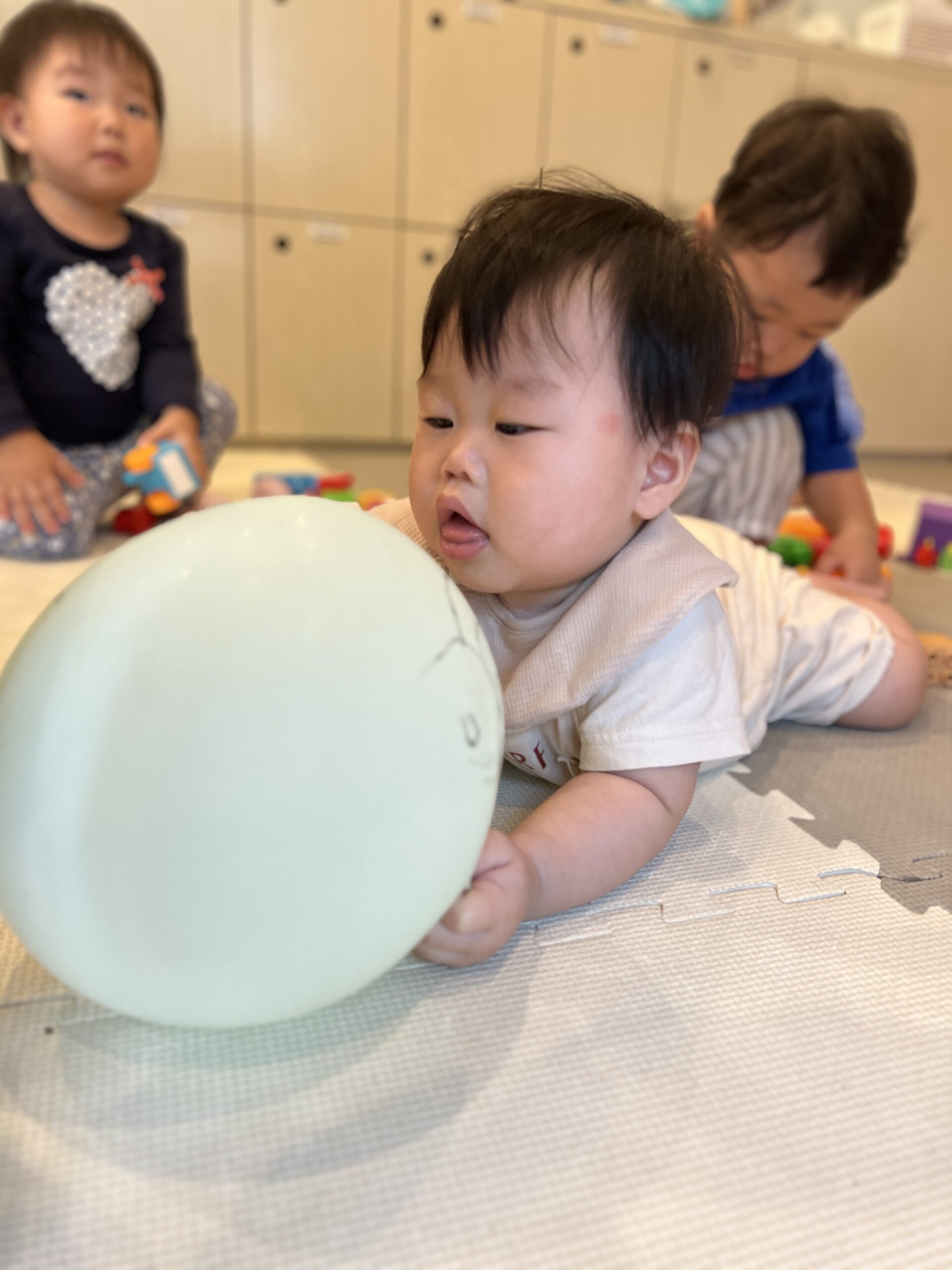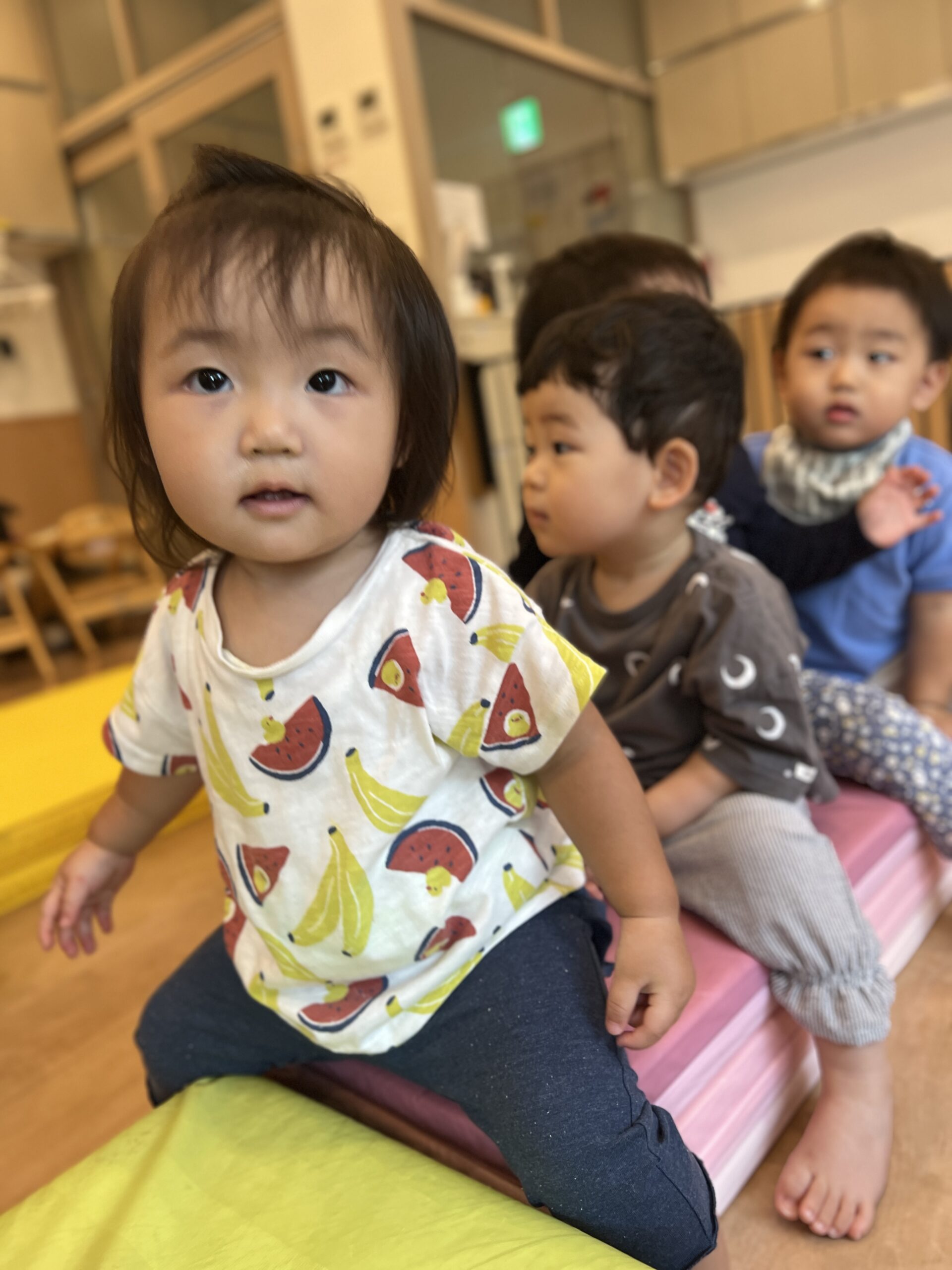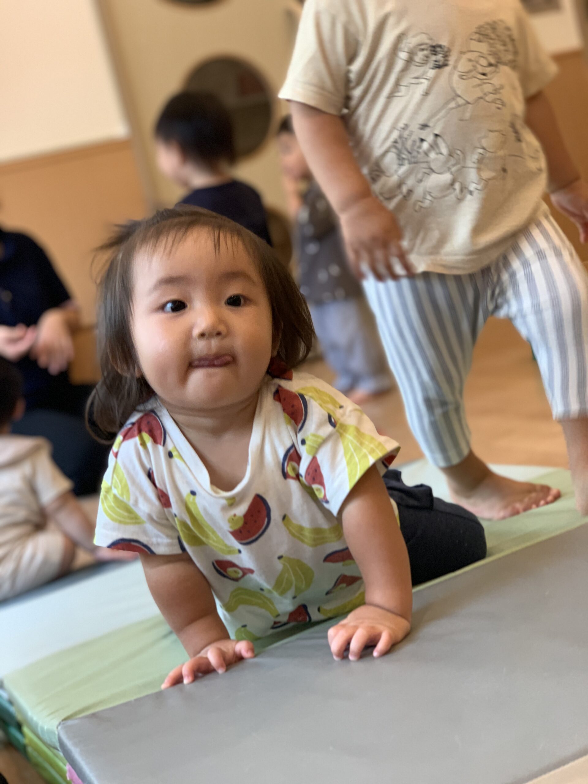 午前中、小さいお友だちはお部屋の中で「体育遊び」に挑戦しました。
