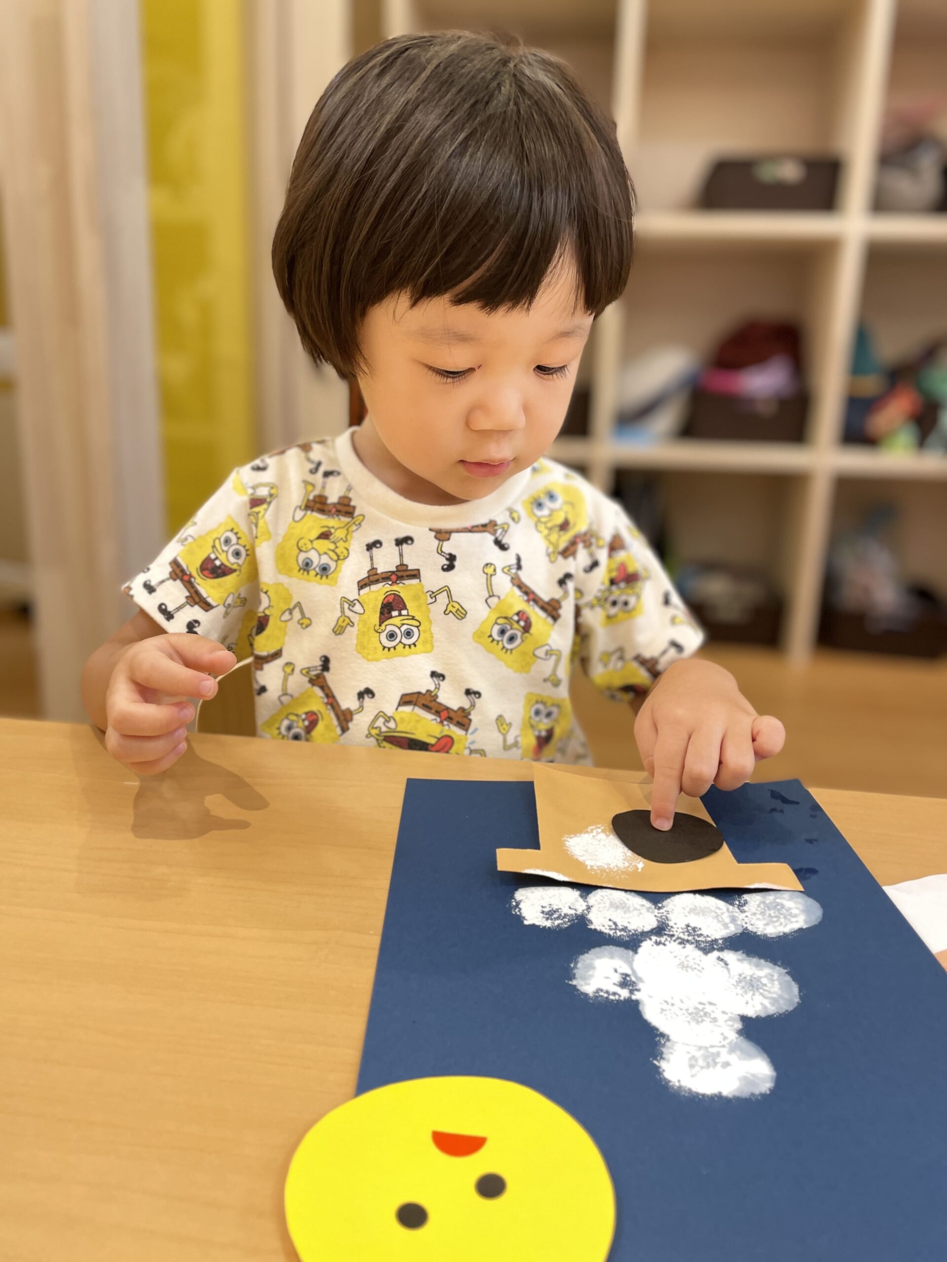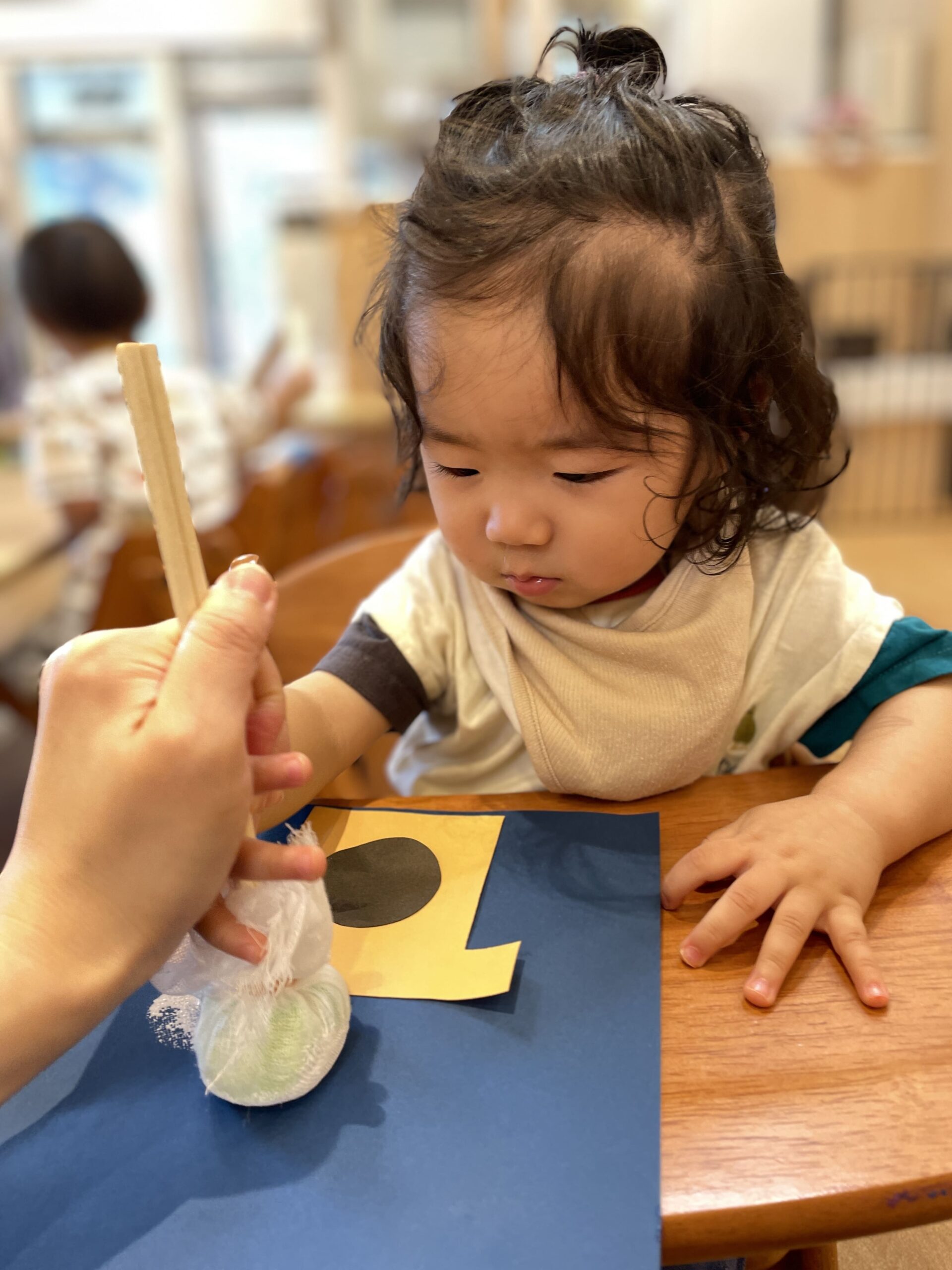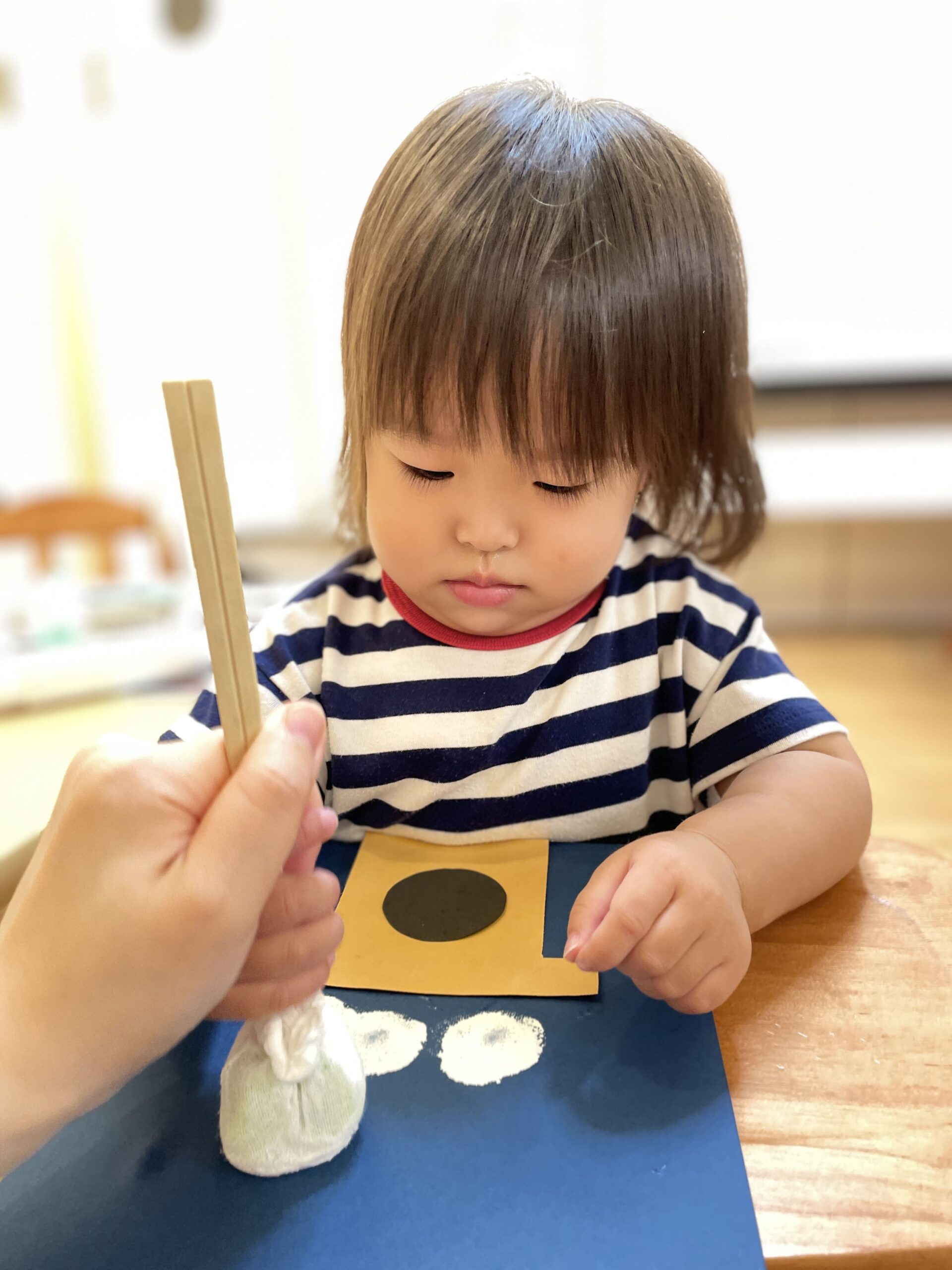 みんな、とっても集中して取り組めていました。シール貼りの所では、目と口の位置をちゃんと貼ろうとする気持ちが伝わり、成長を感じました。素敵なお月見になりますように♪