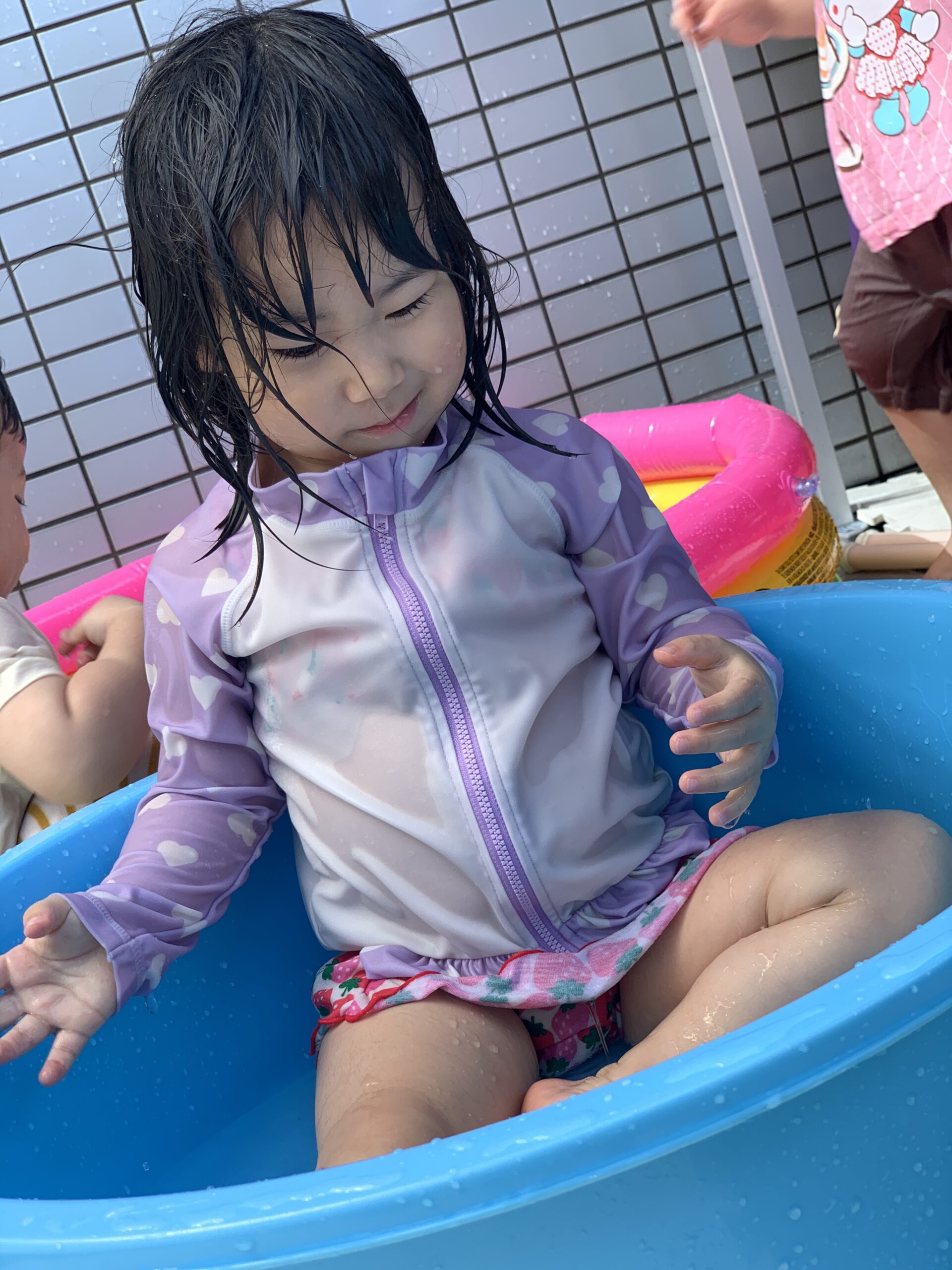 ちょこんとプールに入ってみたり、ウォーターテーブルに手を入れてお水の冷たさを楽しんだり。