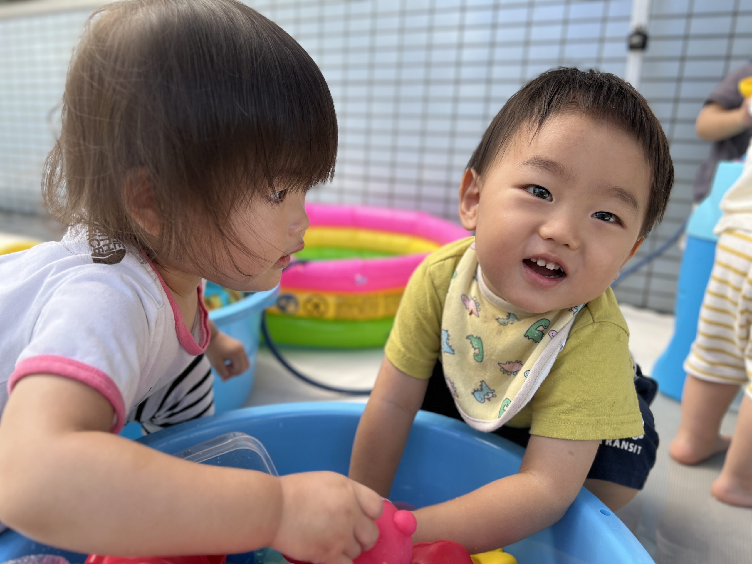 たらいや小さなプールが用意されると、子どもたちは目をキラキラさせてテラスに飛び出してきました。
