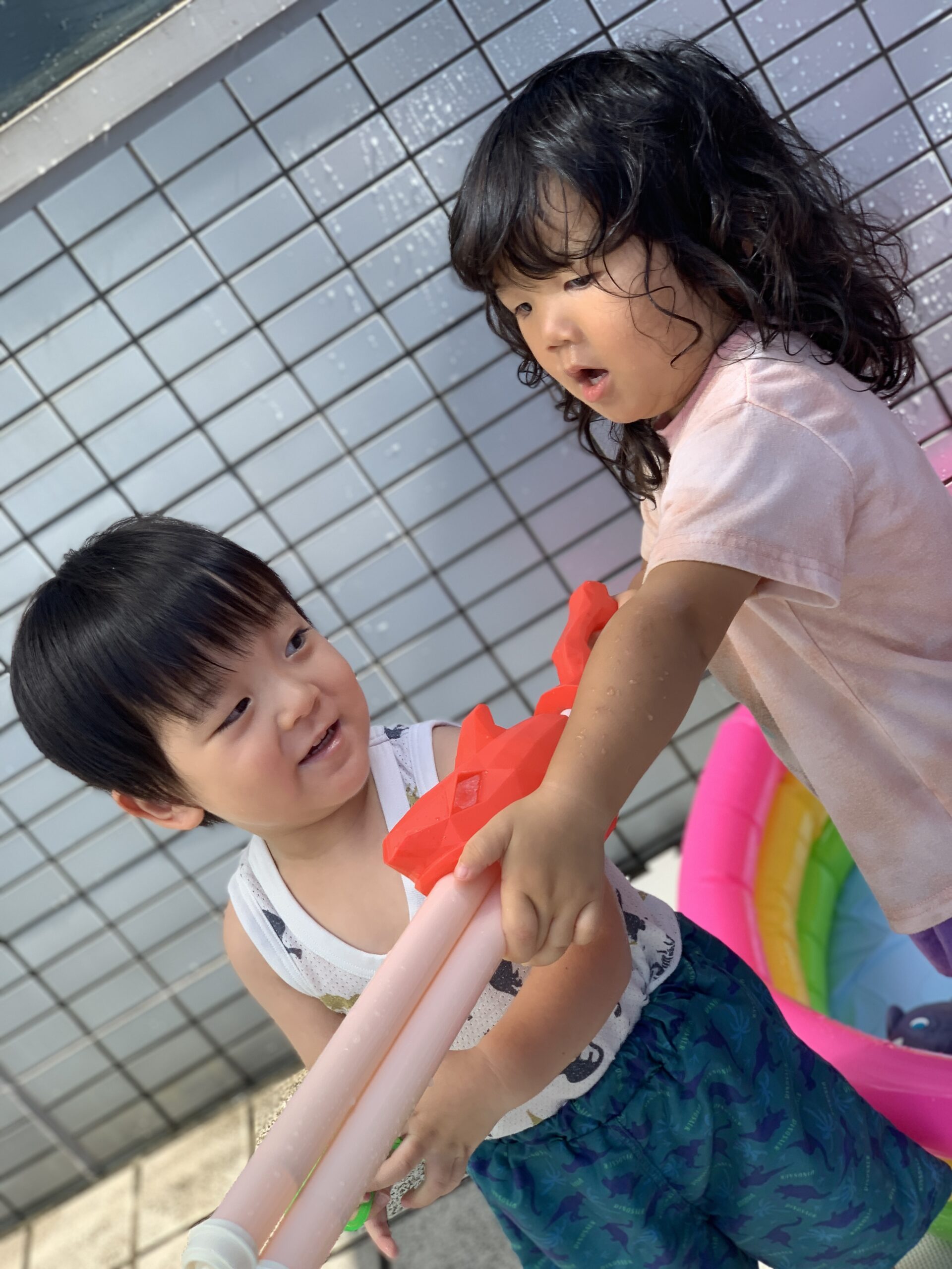 水鉄砲を手にすると、先生や壁を狙って「えいっ!」と元気よく水を飛ばしていました。