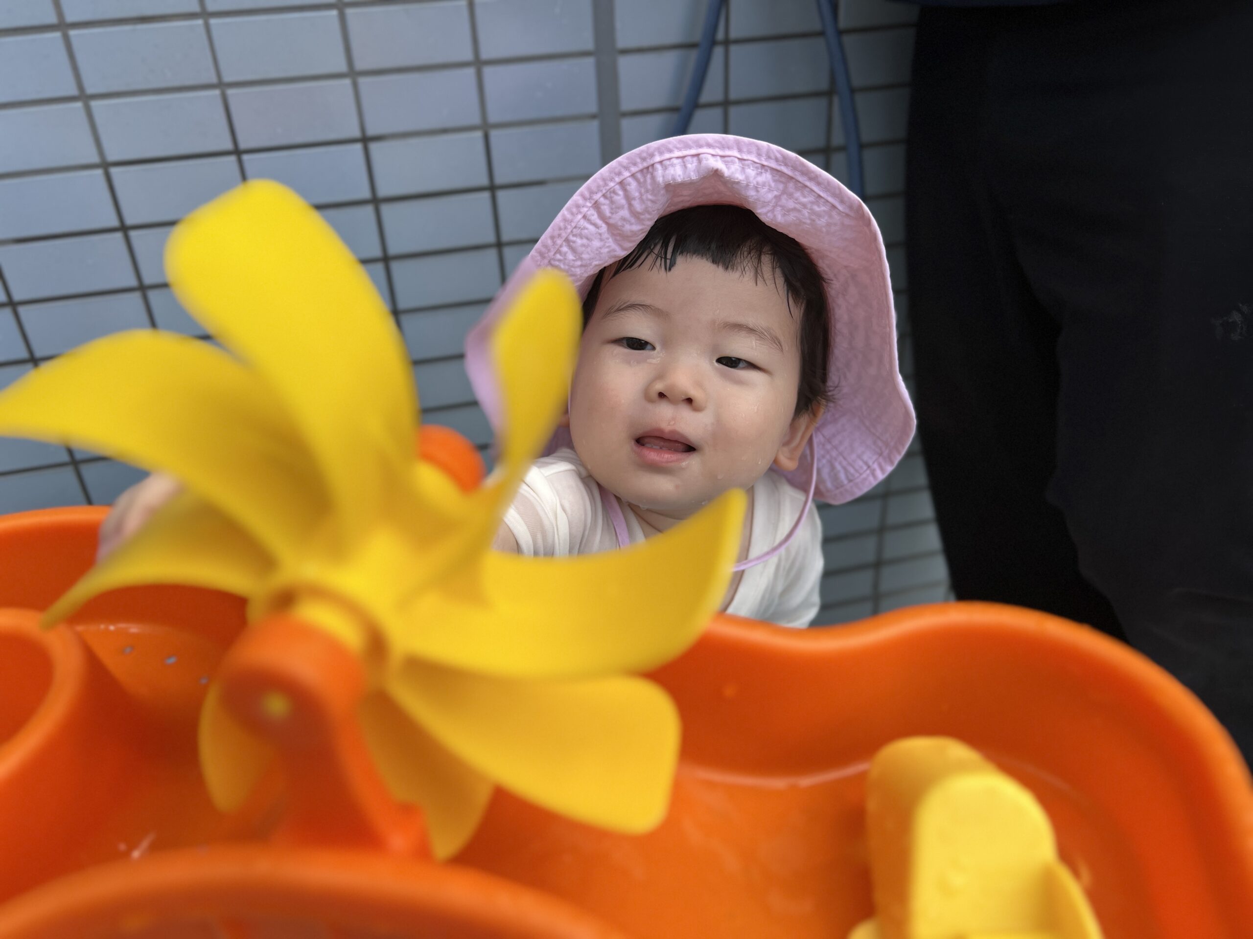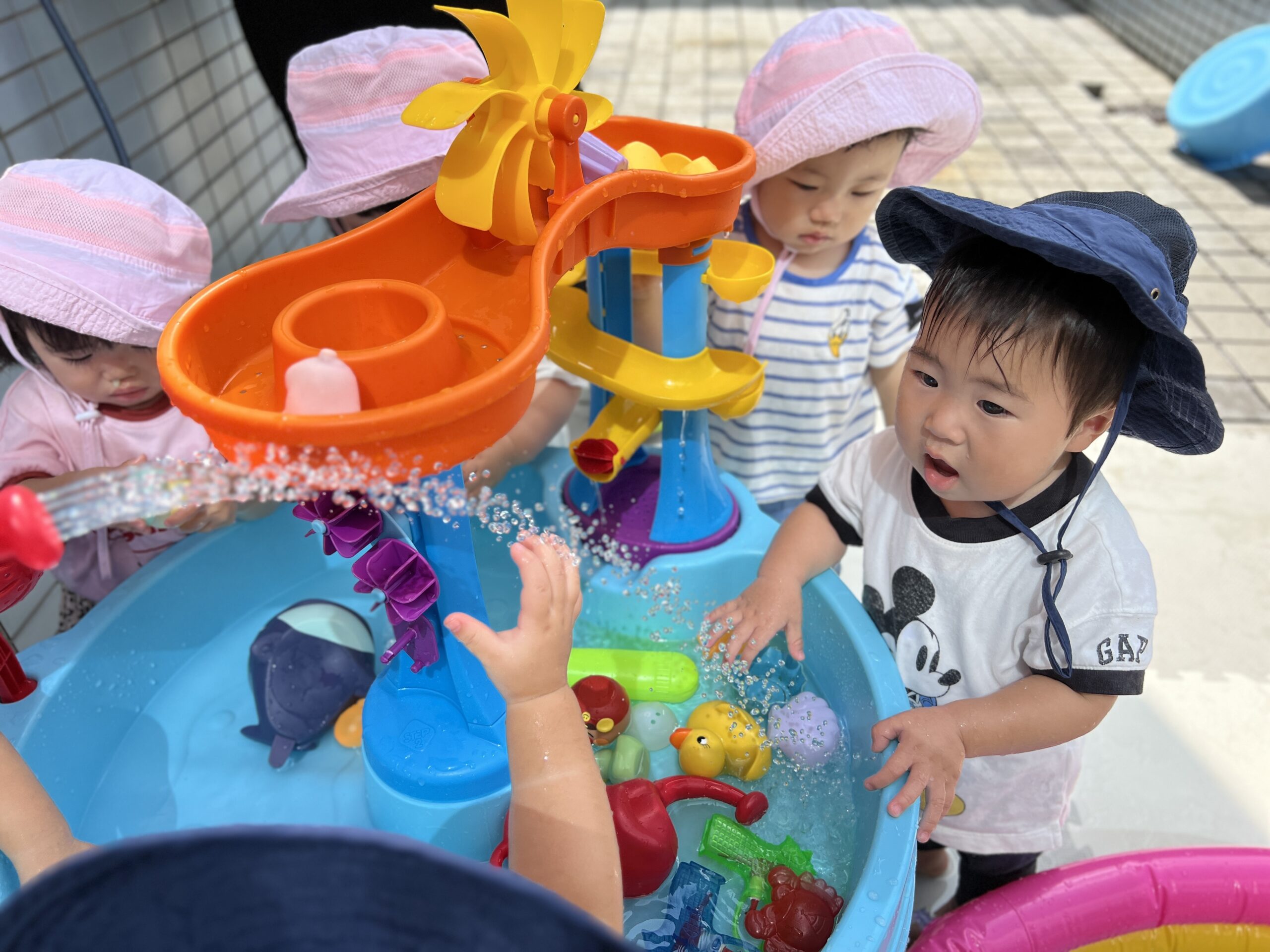 ウォーターテーブルに張られたお水を見るだけでも、子どもたちは大興奮!