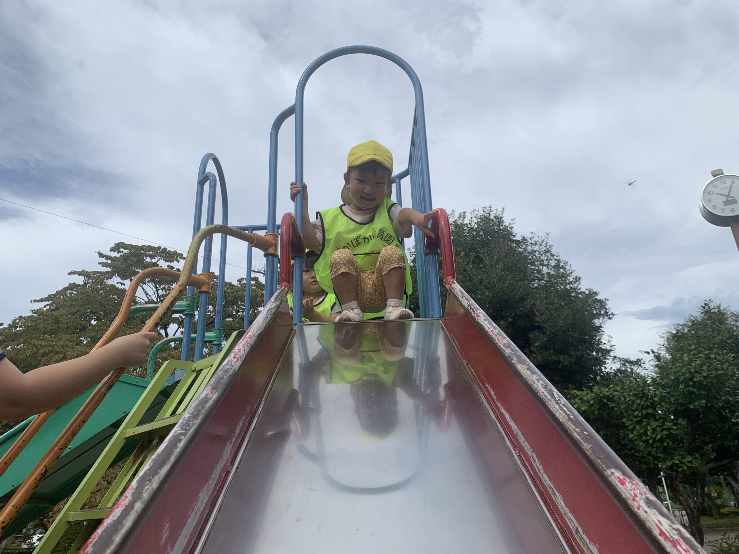 滑り台のところでは、順番を守って滑り降りる子どもたち。