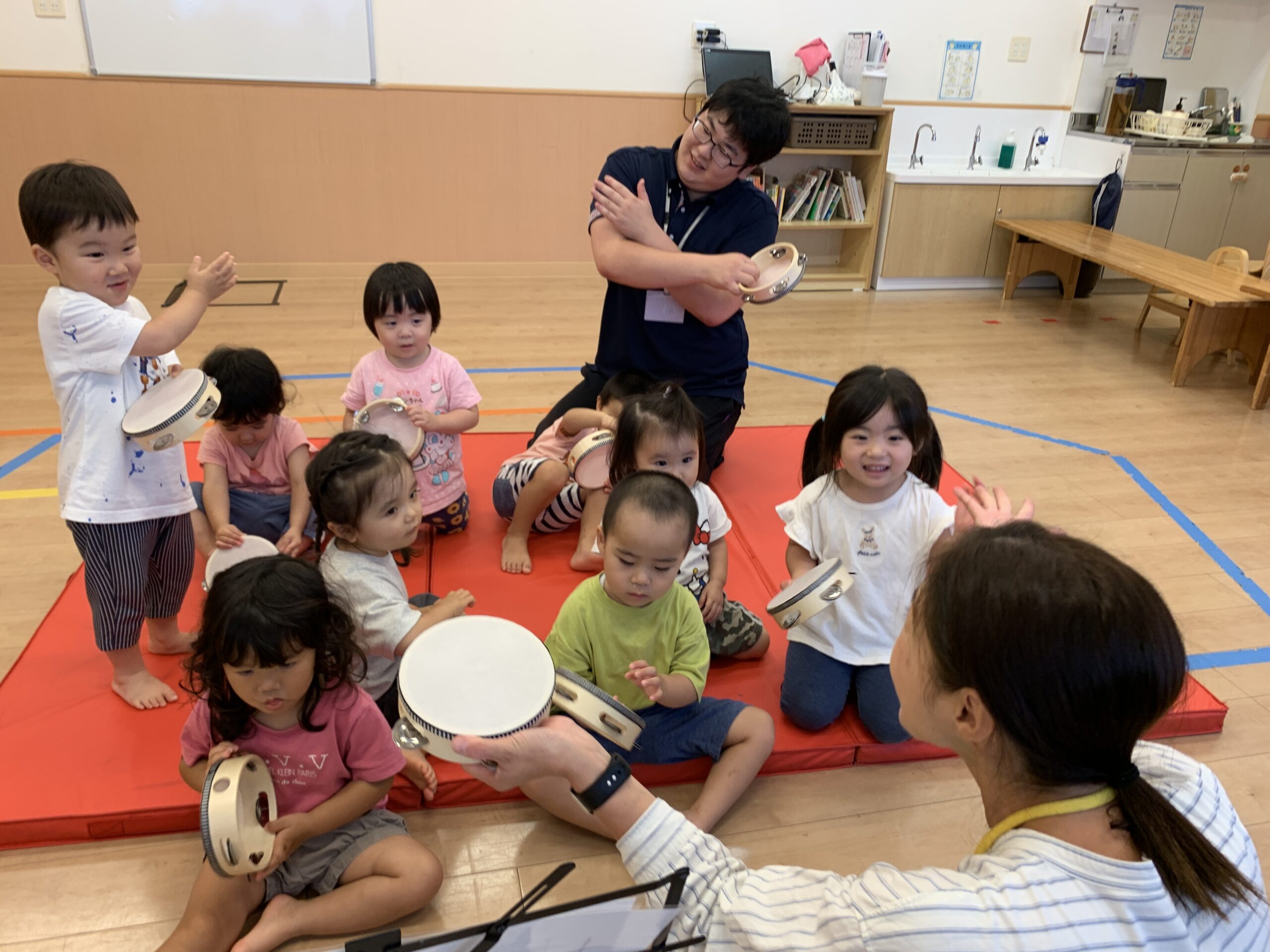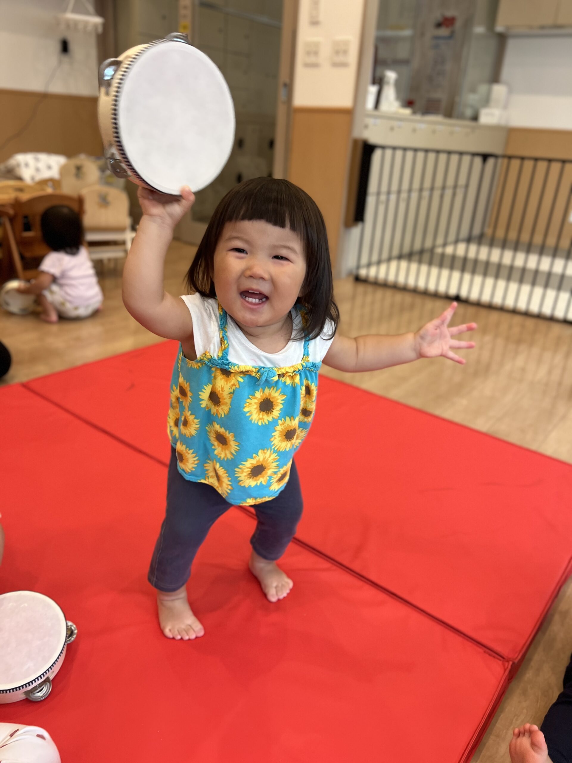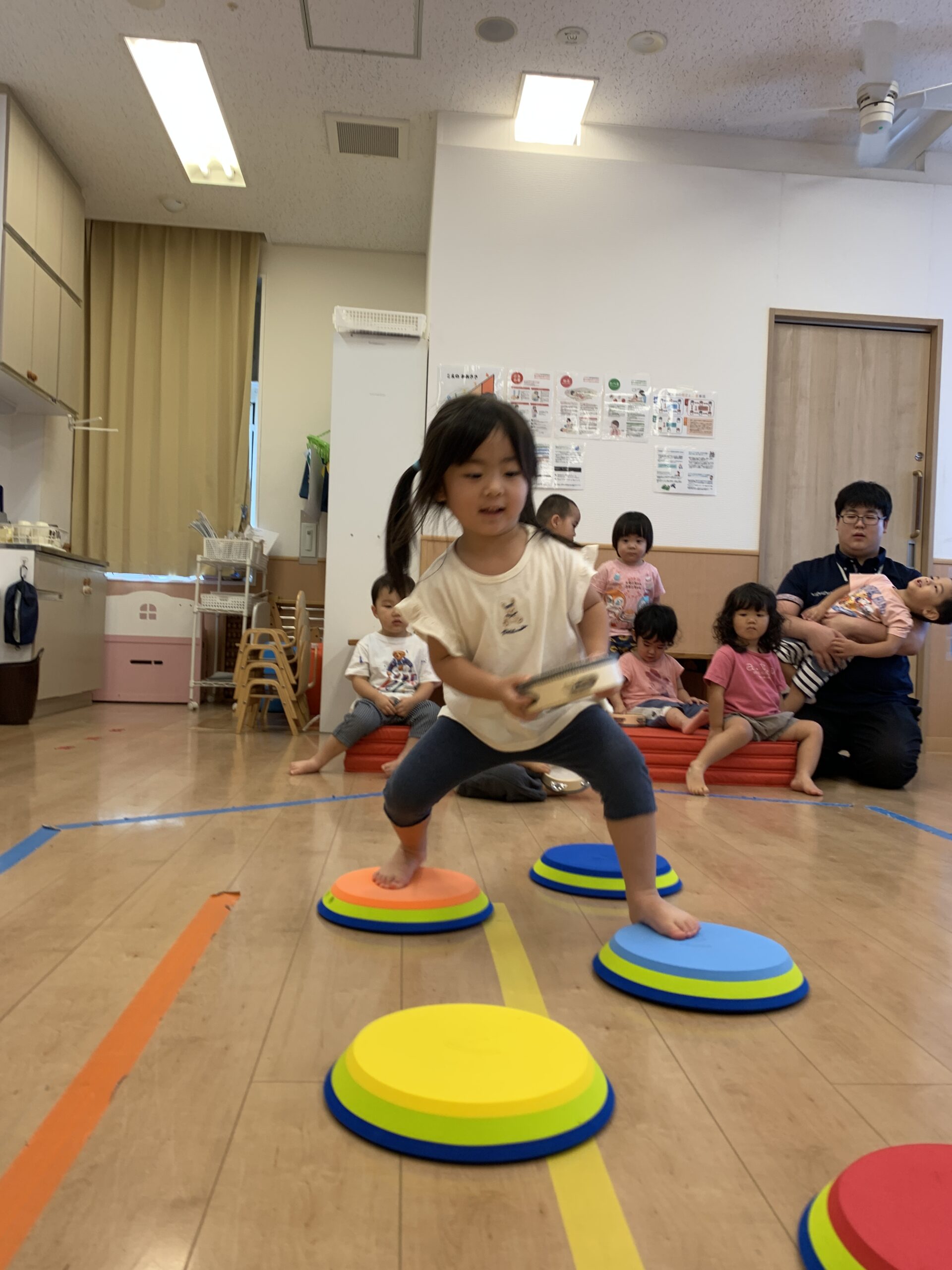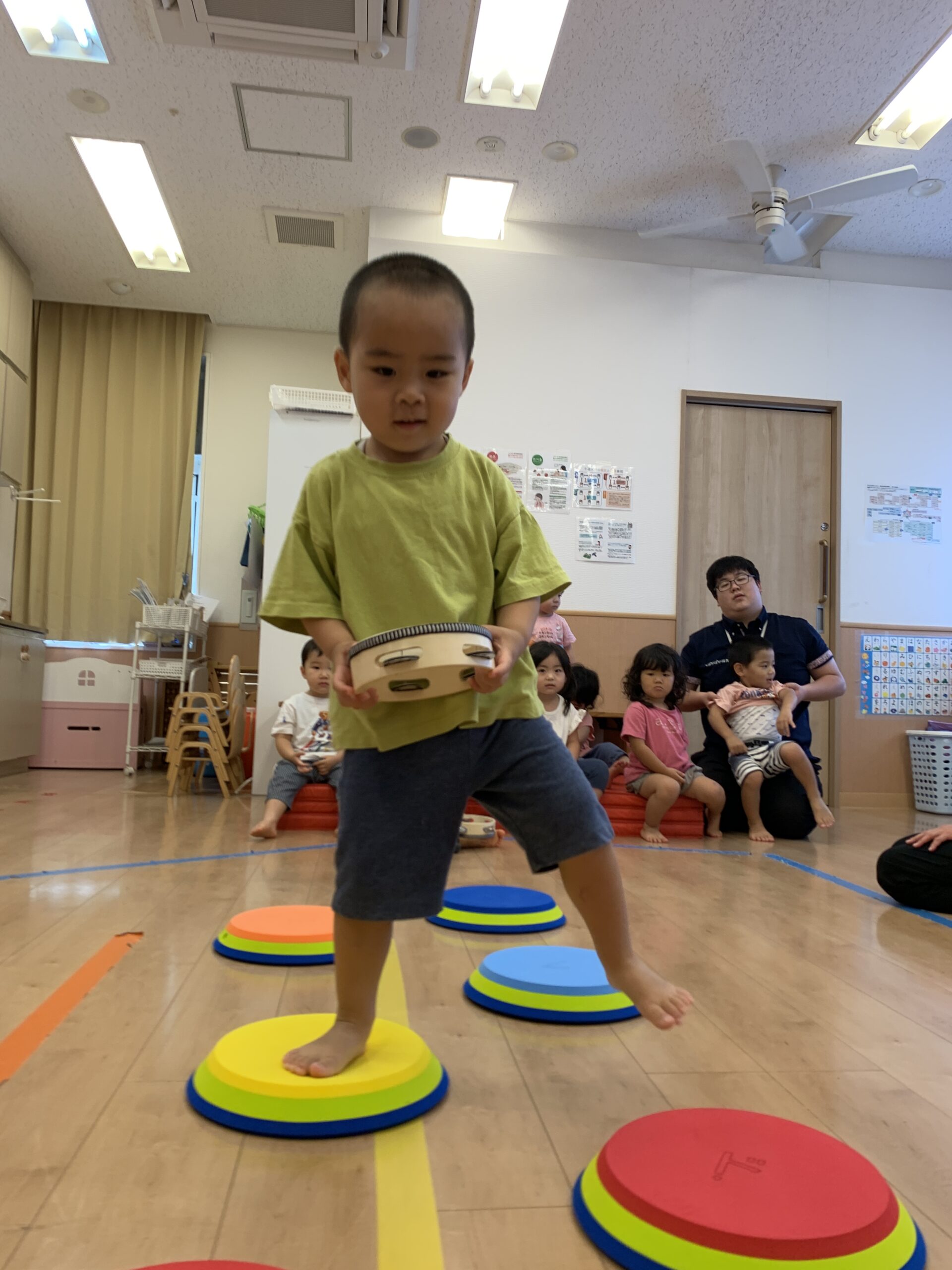虹ぐみさんでは、1人ずつマットを踏んで歩き、タンバリンを目的地までもっていくミッションです!